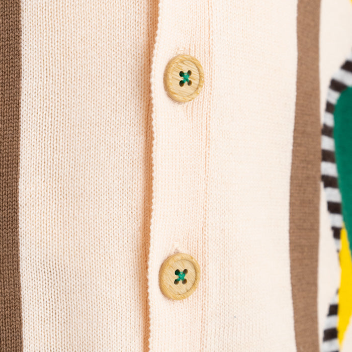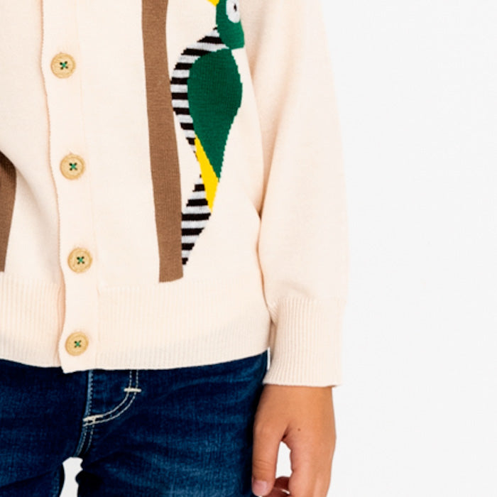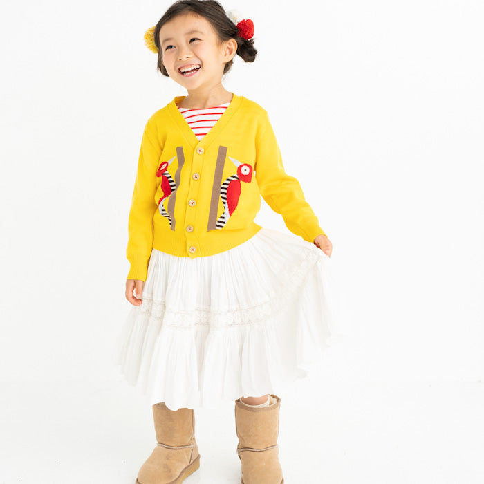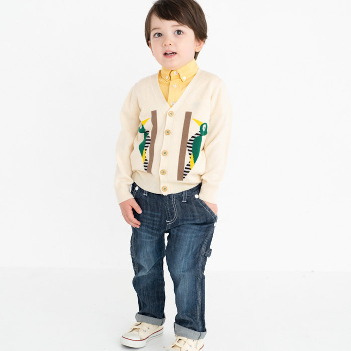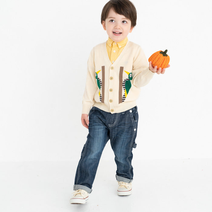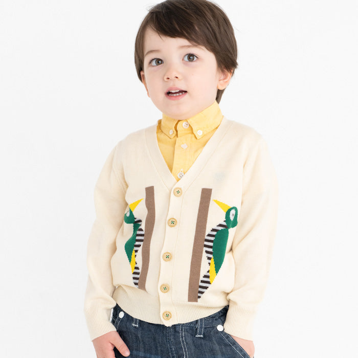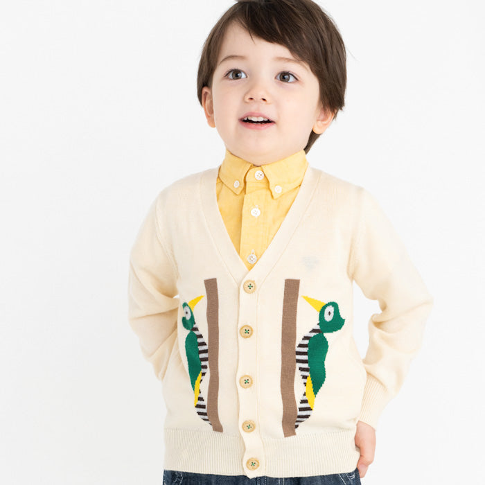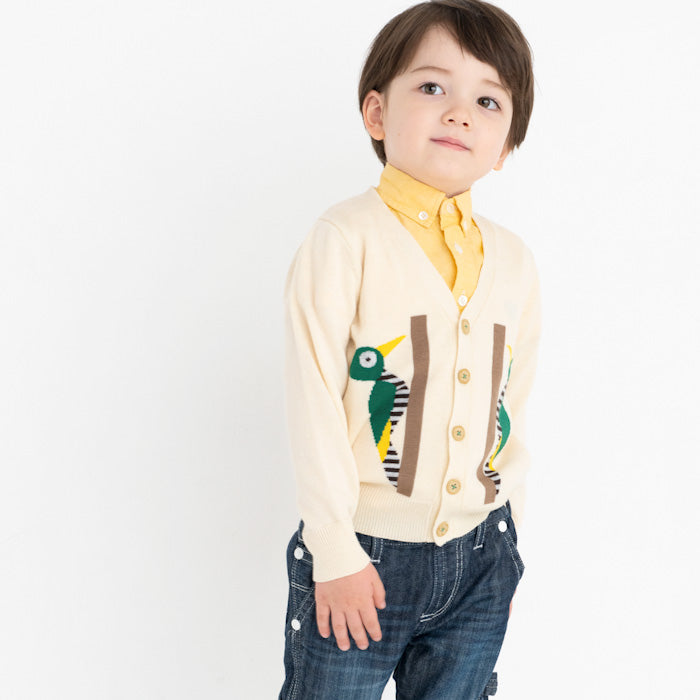 キツツキが2羽、インターシャ編み(糸を切り替えて使うので、厚みが出ない)Vネックカーディガンです。明るい色合いいのカーディガンなので、着ていてハッピーになりますね。模様の部分にはインターシャ編みを採用しており、1本の糸を切替えて編んでいるので厚みが出にくい仕上がりになります。ボタンの糸もキツツキとお揃いで可愛いです。