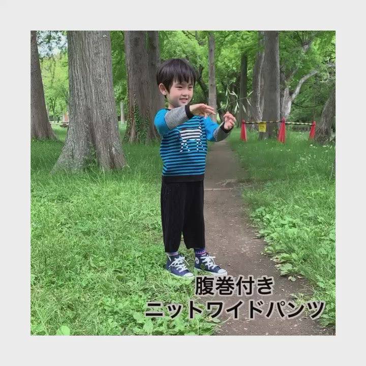 お腹までリブ腹巻が付いているニットワイドパンツです。