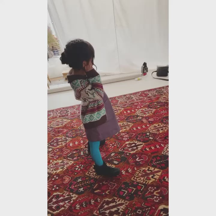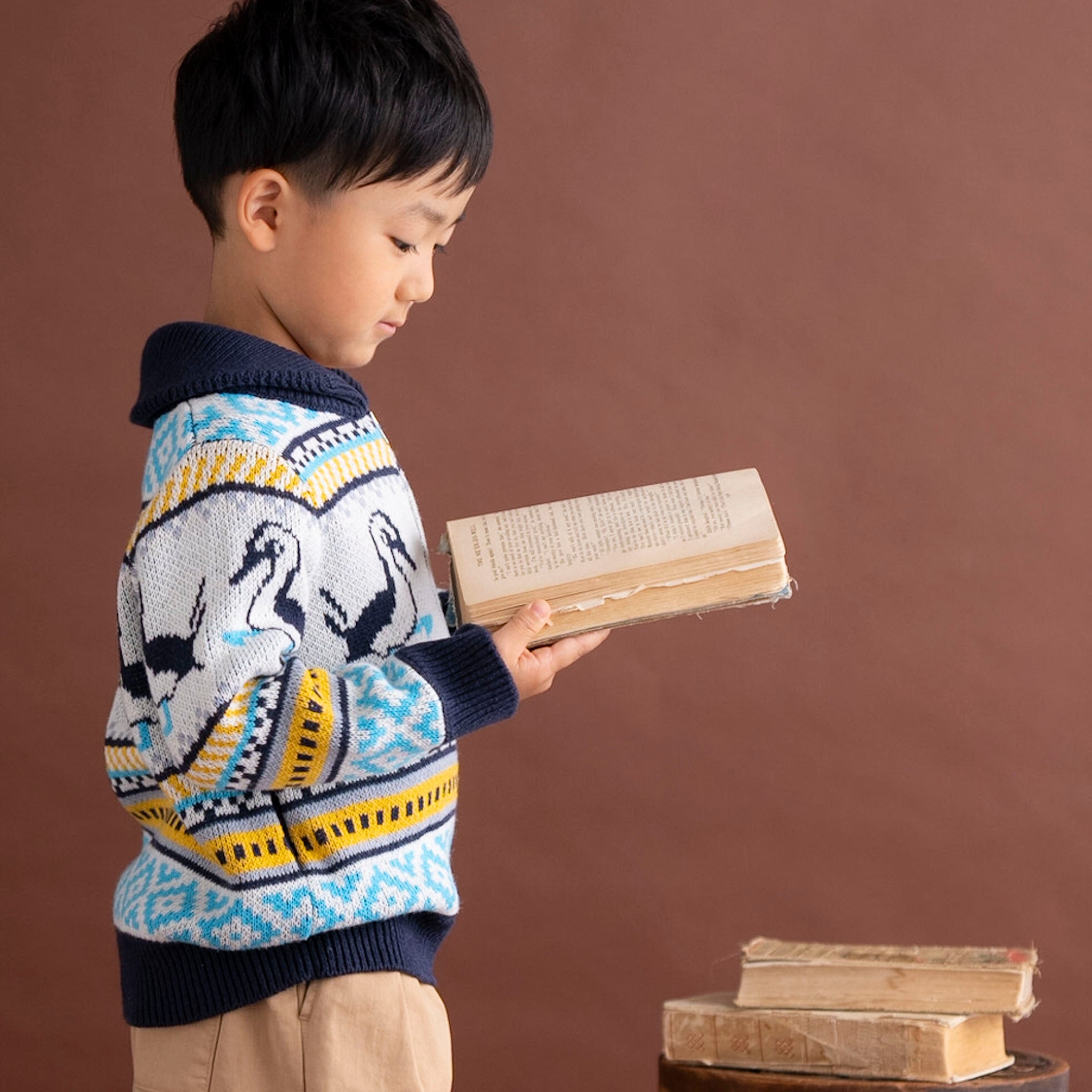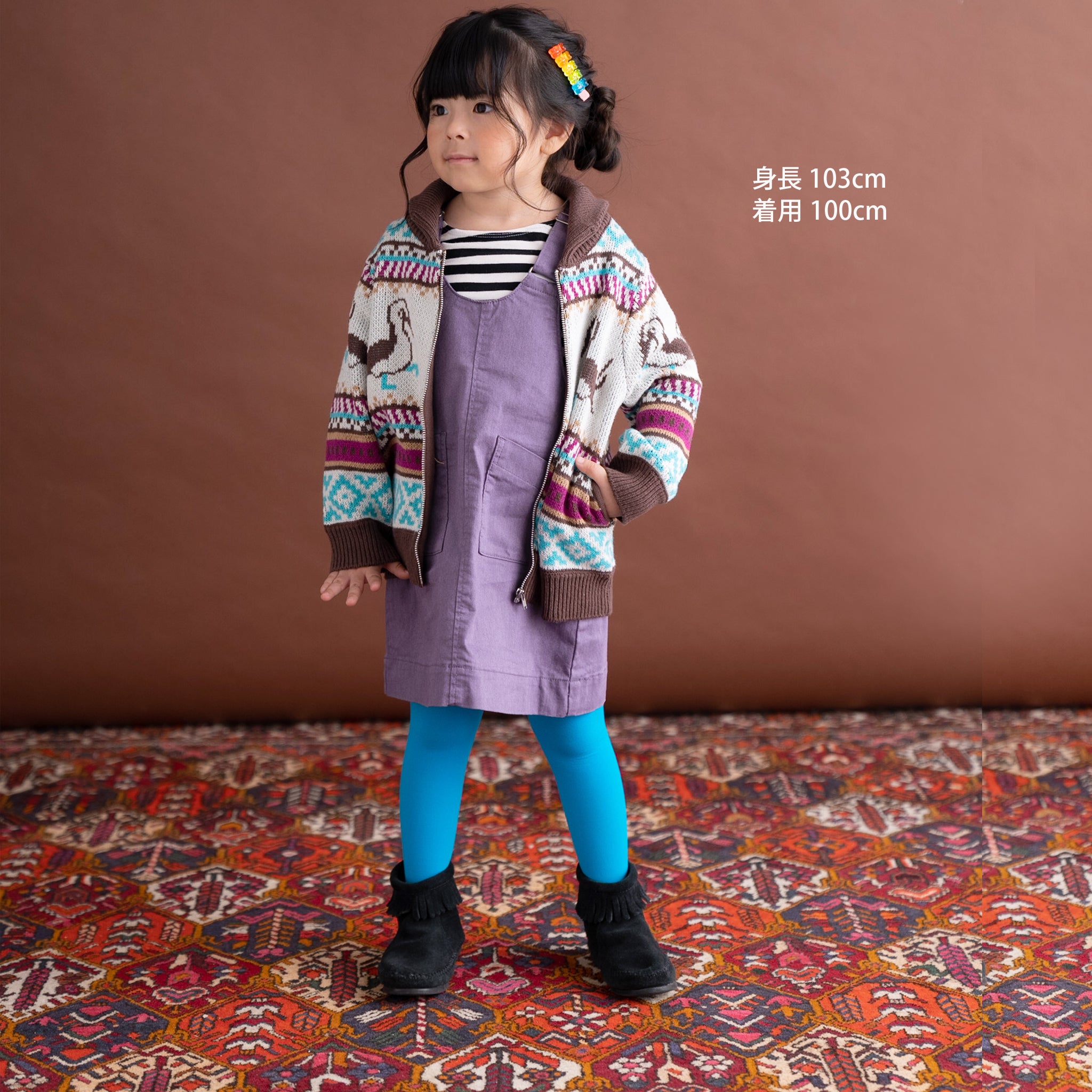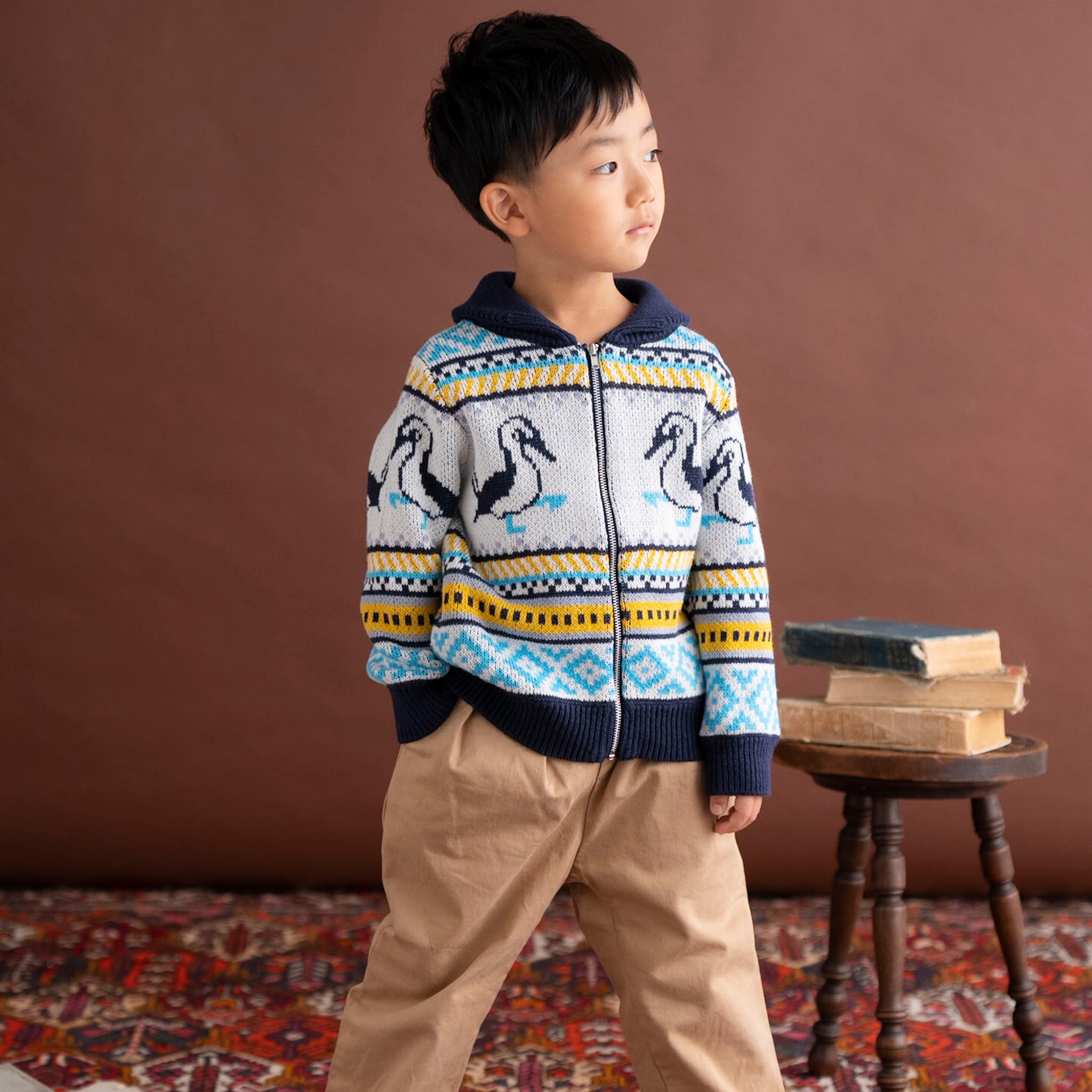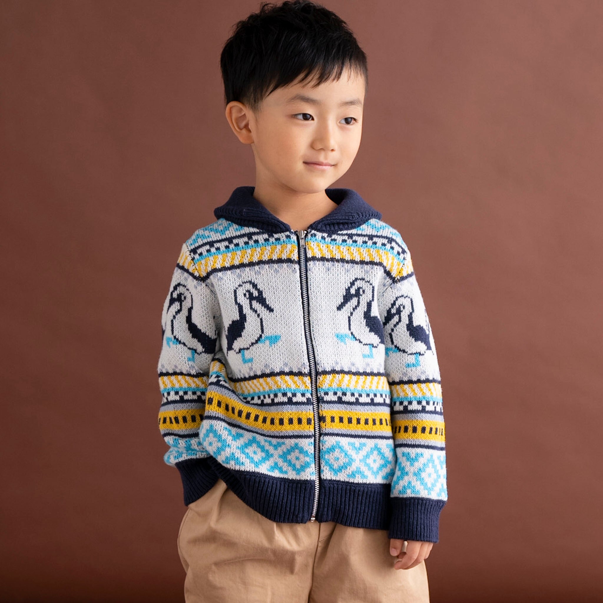 子どもが珍しい動物が好きで、アオアシカツオドリの柄を見て欲しがりました。暖冬なので、コートの代わりに2月の今、上着として羽織っています。