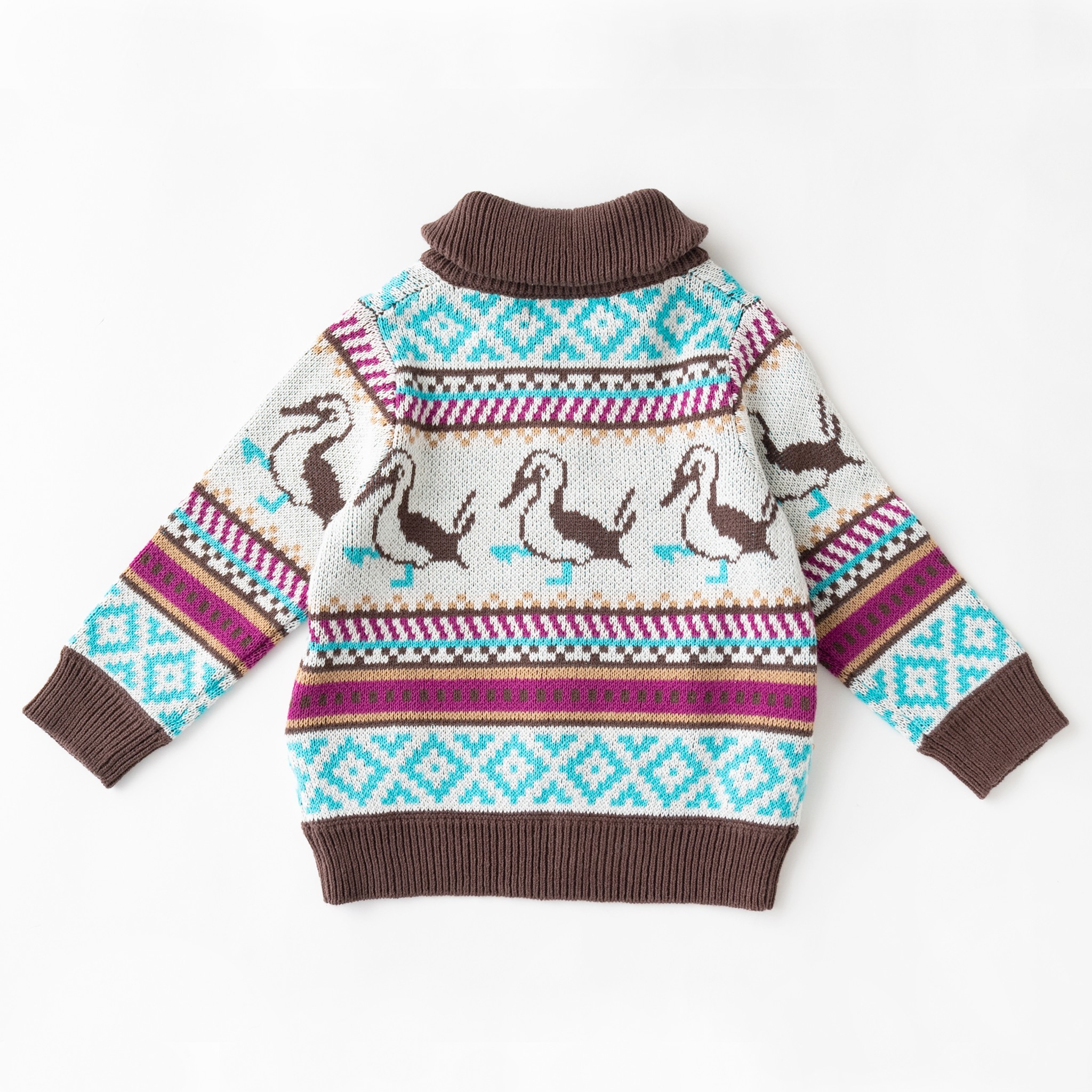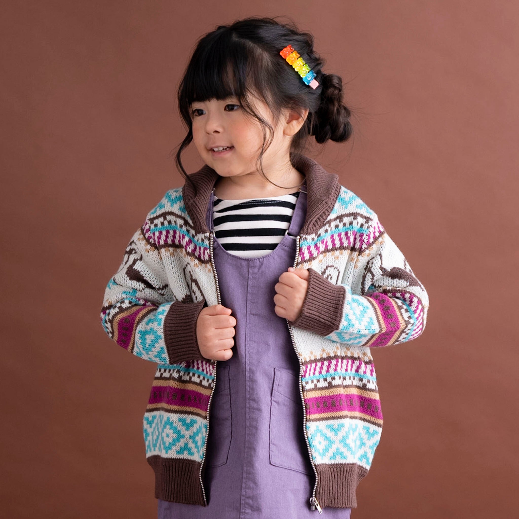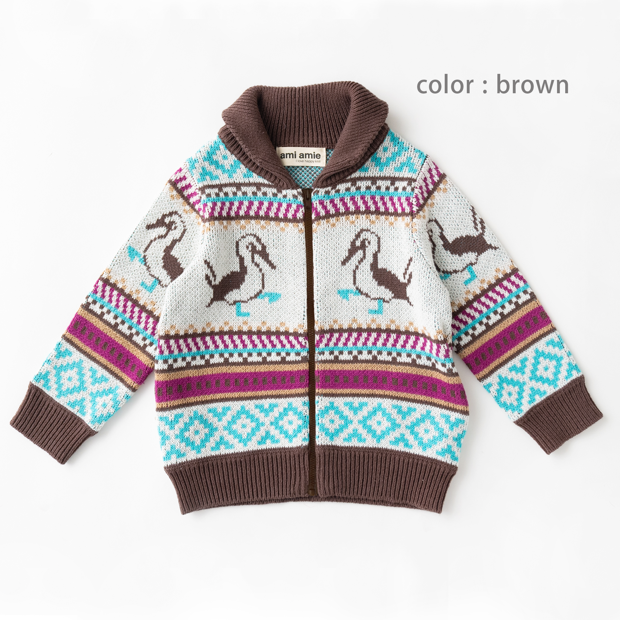 背面に蝶ネクタイをしたアルパカが編み込まれたインターシャカーディガンです。