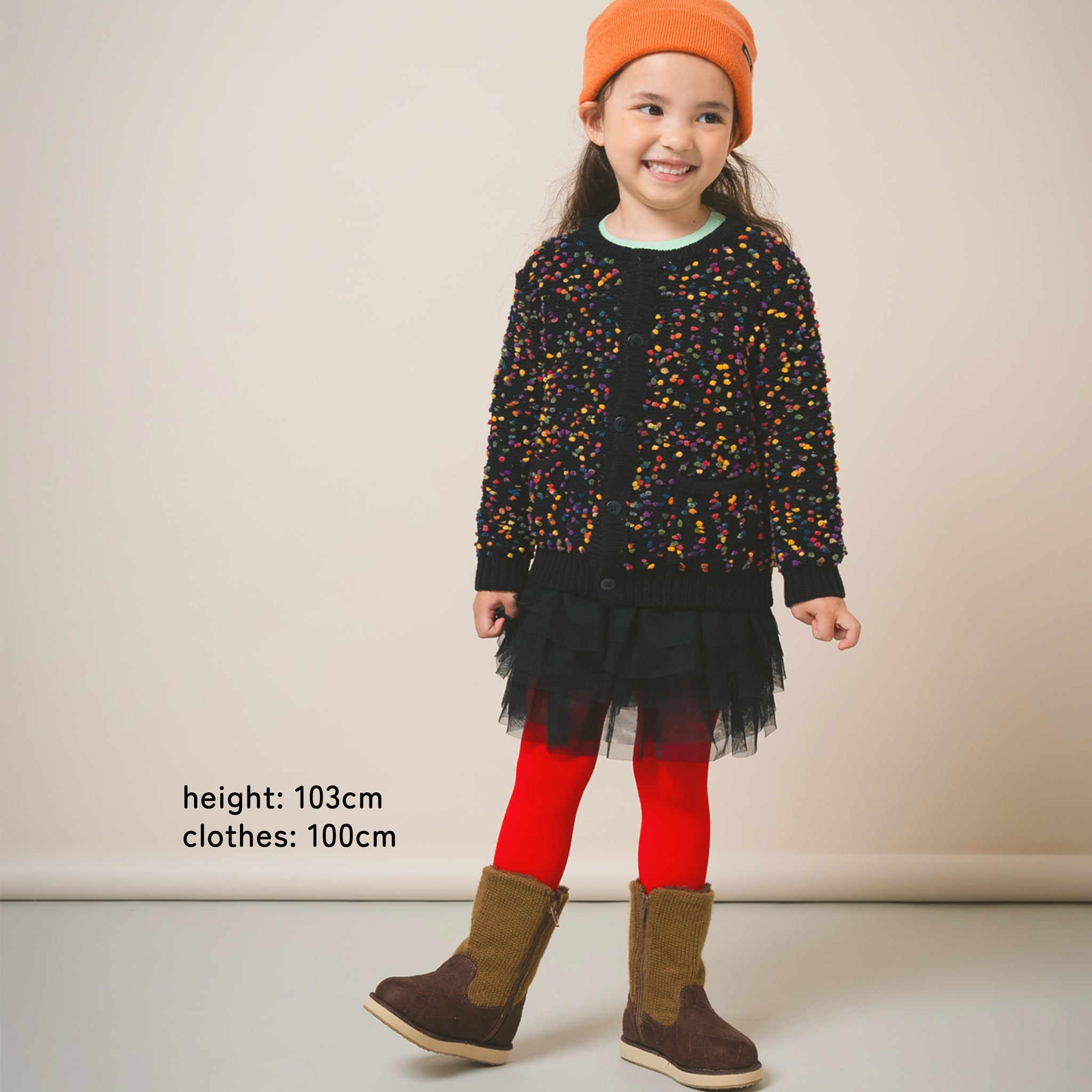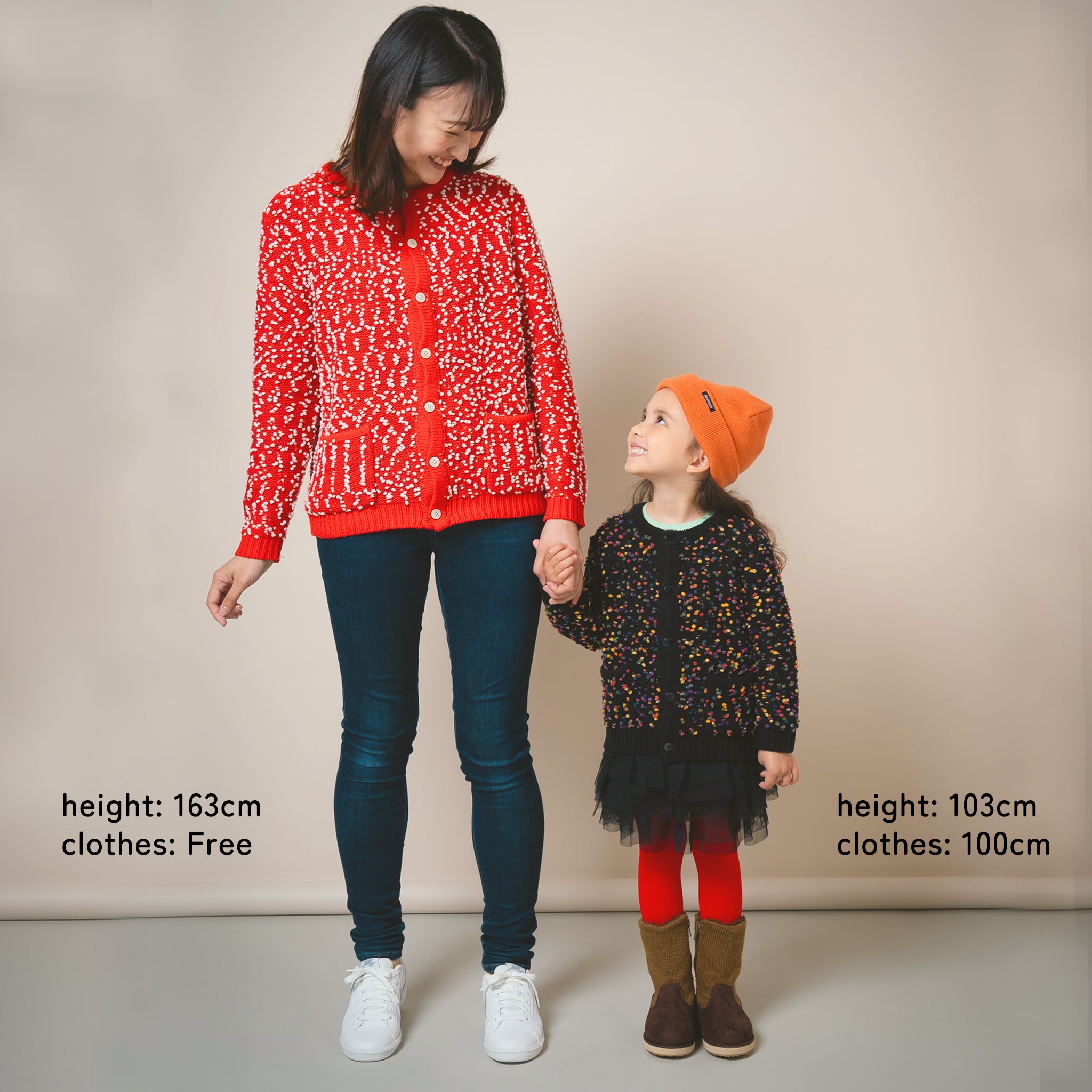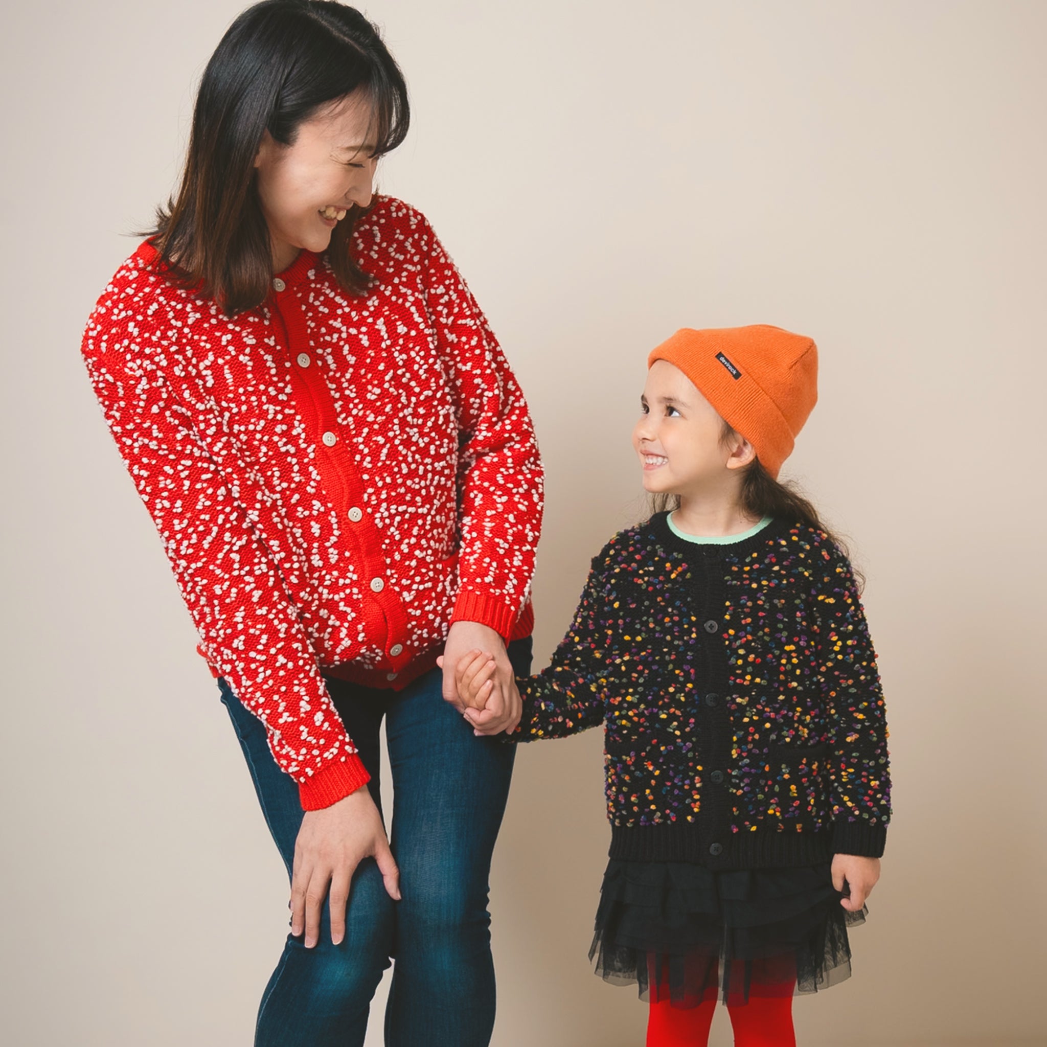 雪のようなポコポコが可愛い♪ 冬のおしゃれを楽しむぽこぽこカーディガン ふんわりとした編み地に、まるで雪が舞い降りたようなカラフルなポコポコを編みこんだニットカーディガン。 ざっくりとした編み目が可愛らしく、ブラックはカラフルなネオンカラーのポコポコでポップに、レッドは雪のようなホワイトのポコポコで冬らしく。 カジュアルにも、ワンピやシャツ合わせでちょっときちんとにも決まります。 おうちの洗濯機で丸洗いOK。デイリーに使えるのもうれしいポイント。 親子でリンクコーデも楽しめるので、ギフトや特別なお出かけにもぴったりです。 |