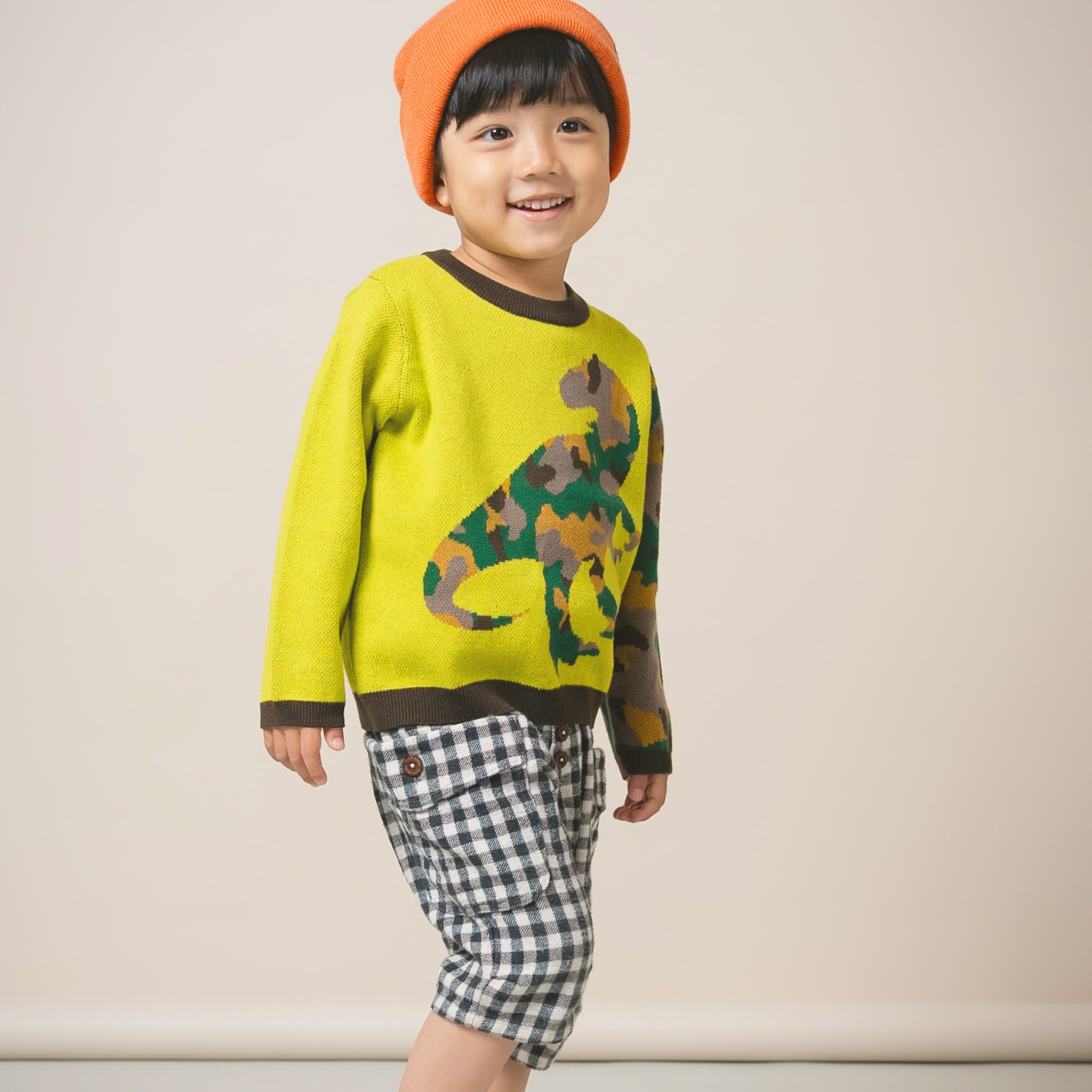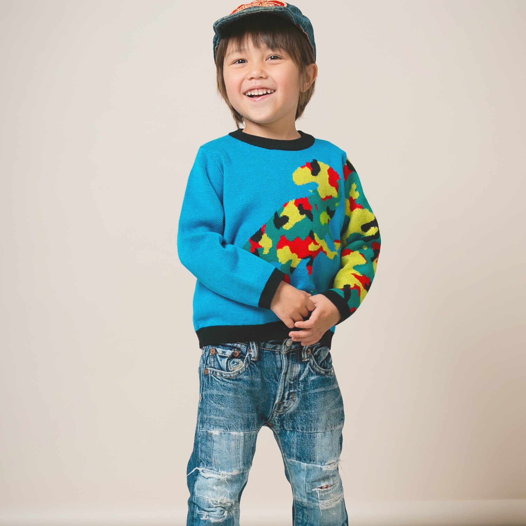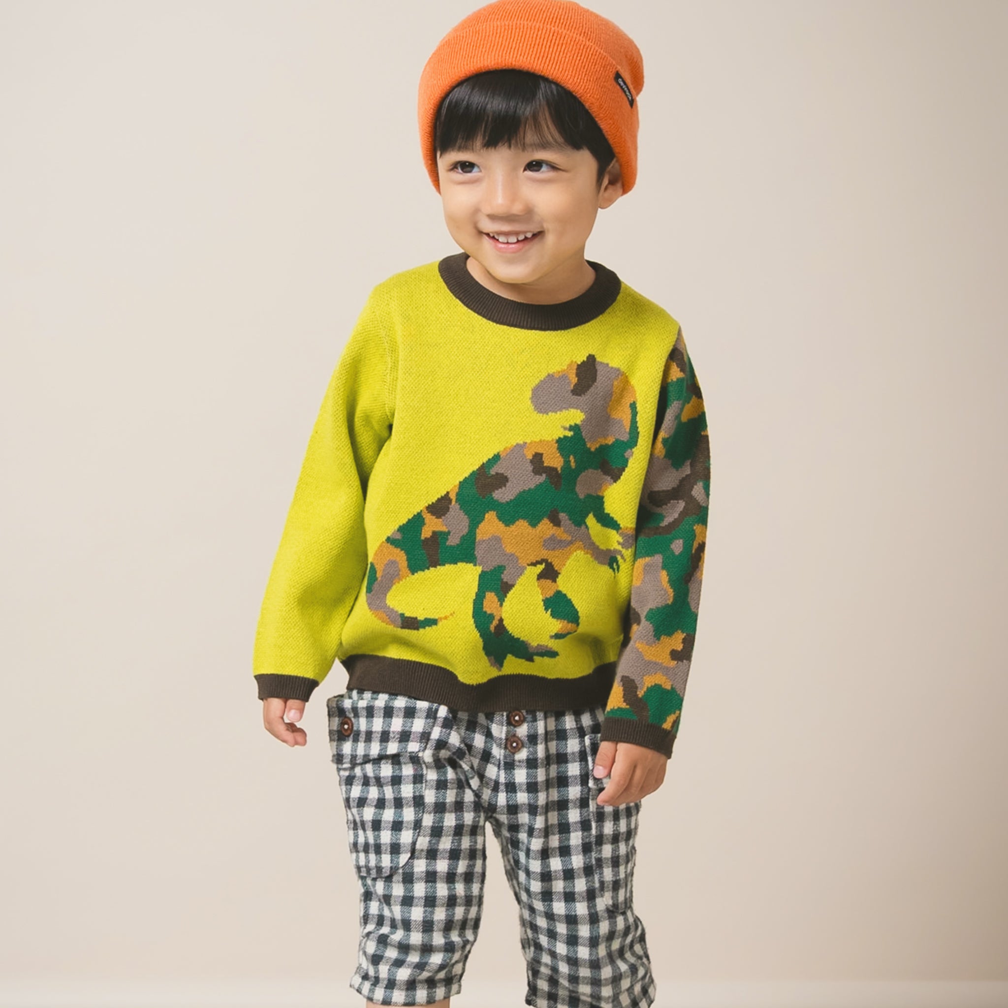 恐竜好きキッズ必見!カラフル迷彩柄で元気コーデ 恐竜好きのお子さまにぴったり! 身頃に大胆な恐竜モチーフ、袖には迷彩柄を組み合わせた遊び心あふれるニットプルオーバーです。 コットン100%素材でチクチクしにくく、デイリーに着やすいのもポイント。 カラーバリエーションは、定番の迷彩柄を使ったグリーンと、ビビッドな配色が映えるブルーの2色展開。 どちらもコーディネートの主役になる存在感たっぷりのデザインです。 さらにご家庭の洗濯機で丸洗いできるので、お手入れもラクラク。 元気いっぱいに遊ぶキッズに安心して着せられる、頼れる1枚です。 |