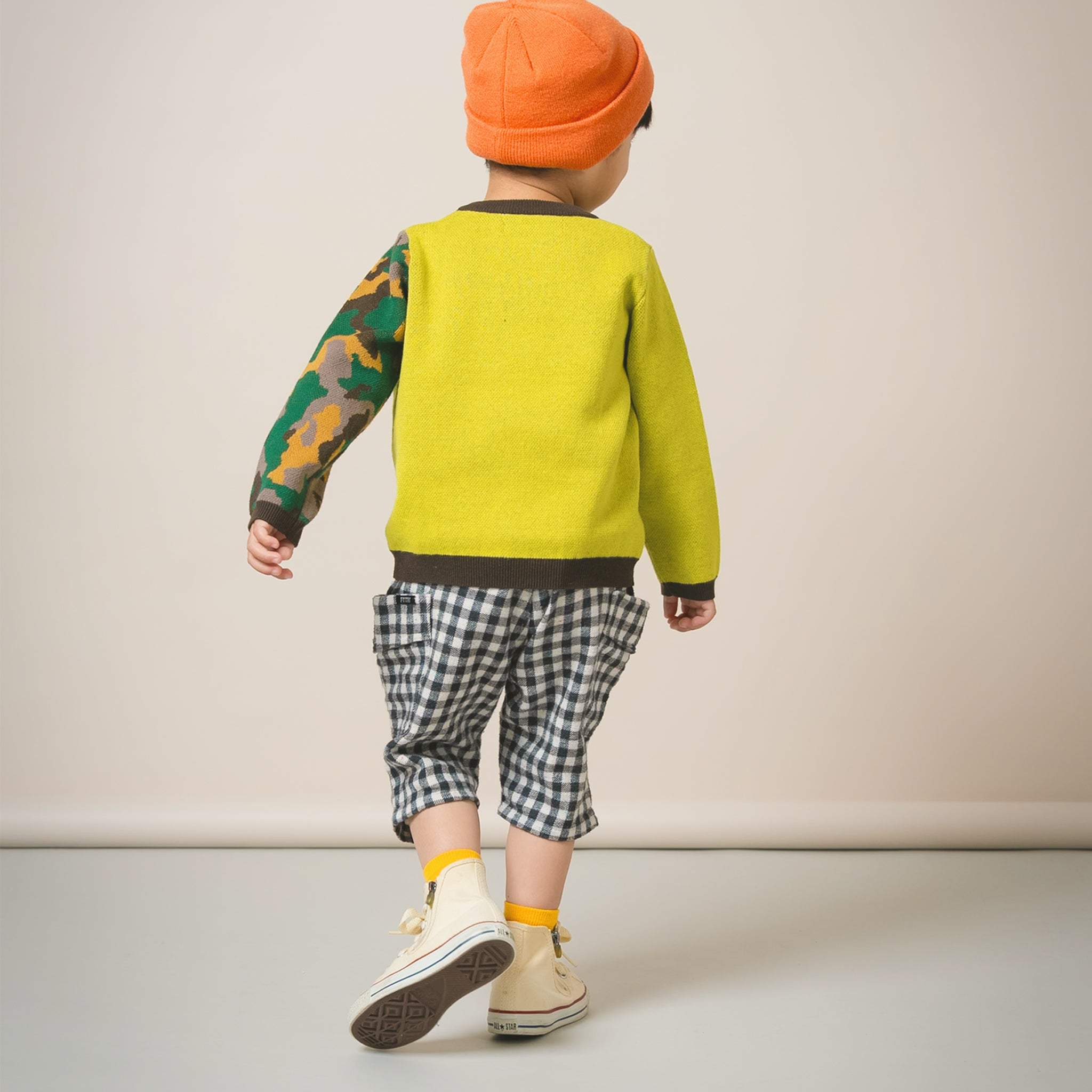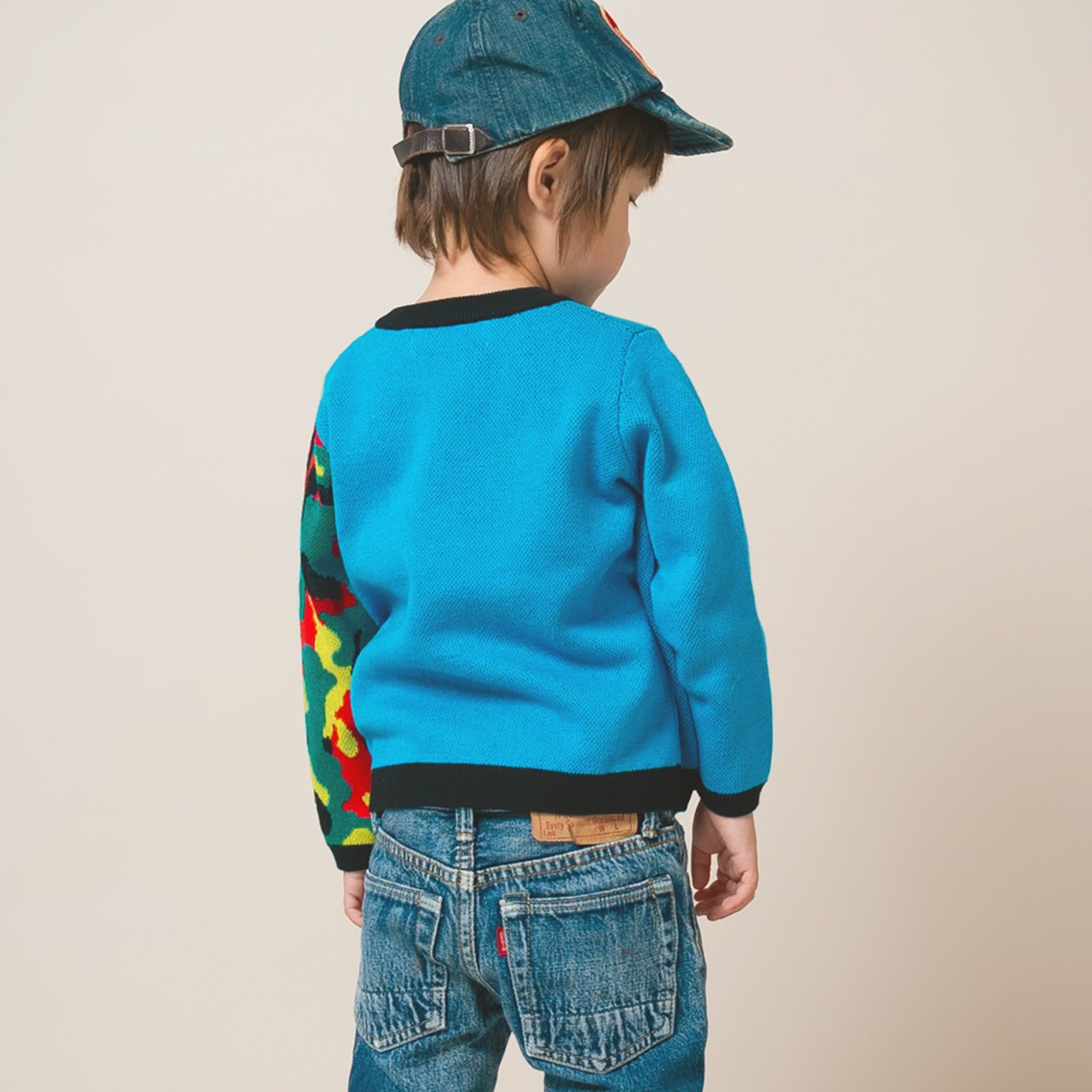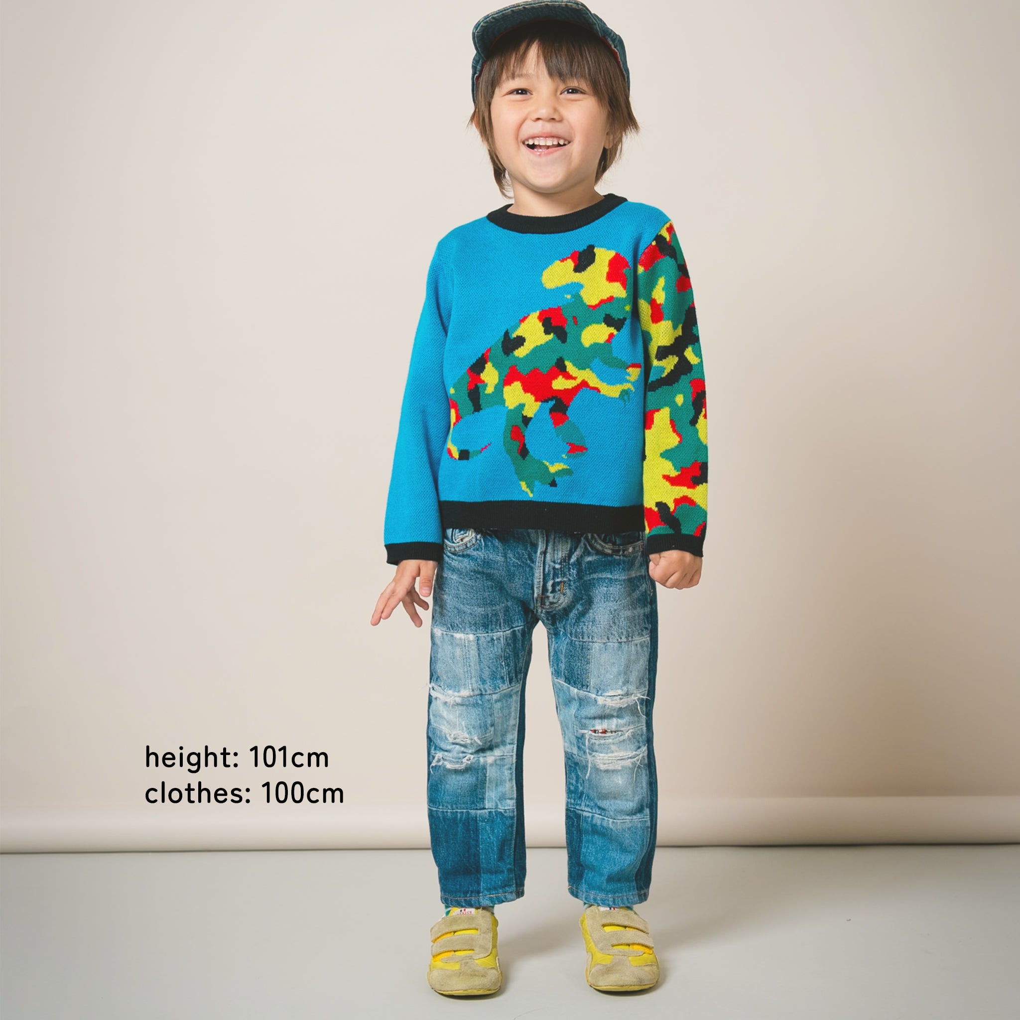 恐竜好きキッズ必見!カラフル迷彩柄で元気コーデ 恐竜好きのお子さまにぴったり! 身頃に大胆な恐竜モチーフ、袖には迷彩柄を組み合わせた遊び心あふれるニットプルオーバーです。 コットン100%素材でチクチクしにくく、デイリーに着やすいのもポイント。 カラーバリエーションは、定番の迷彩柄を使ったグリーンと、ビビッドな配色が映えるブルーの2色展開。 どちらもコーディネートの主役になる存在感たっぷりのデザインです。 さらにご家庭の洗濯機で丸洗いできるので、お手入れもラクラク。 元気いっぱいに遊ぶキッズに安心して着せられる、頼れる1枚です。 |