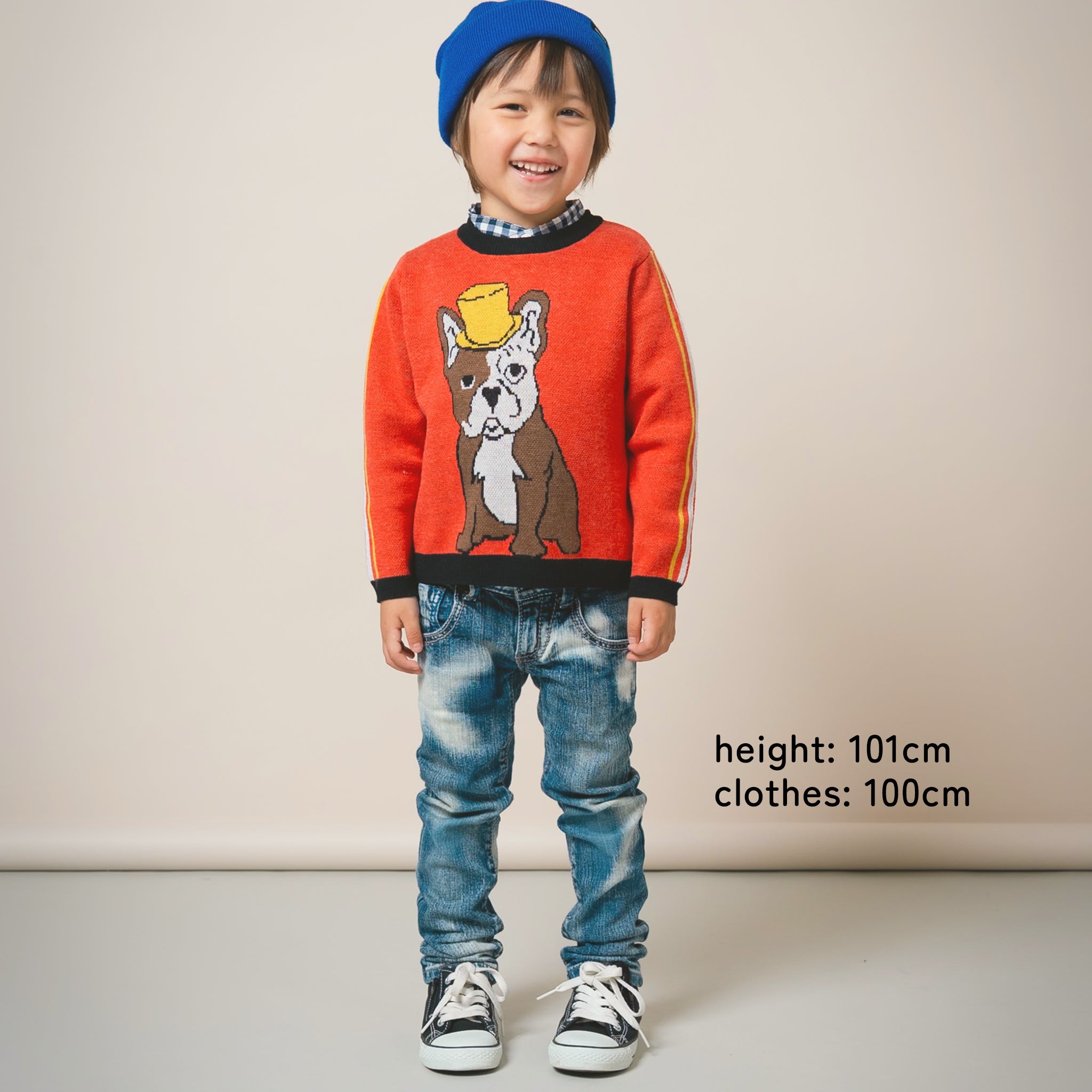 フロントに大きくデザインされたワンちゃんモチーフと、袖の3本ラインがアクセントになった、カラフルでポップなウール混ニットプルオーバーです。