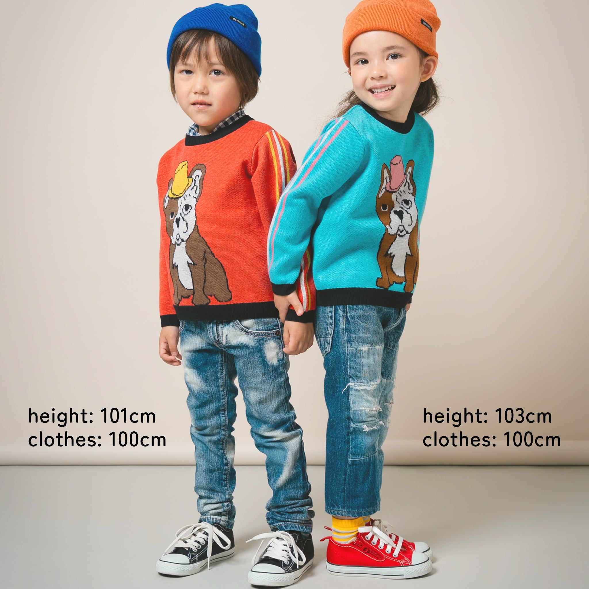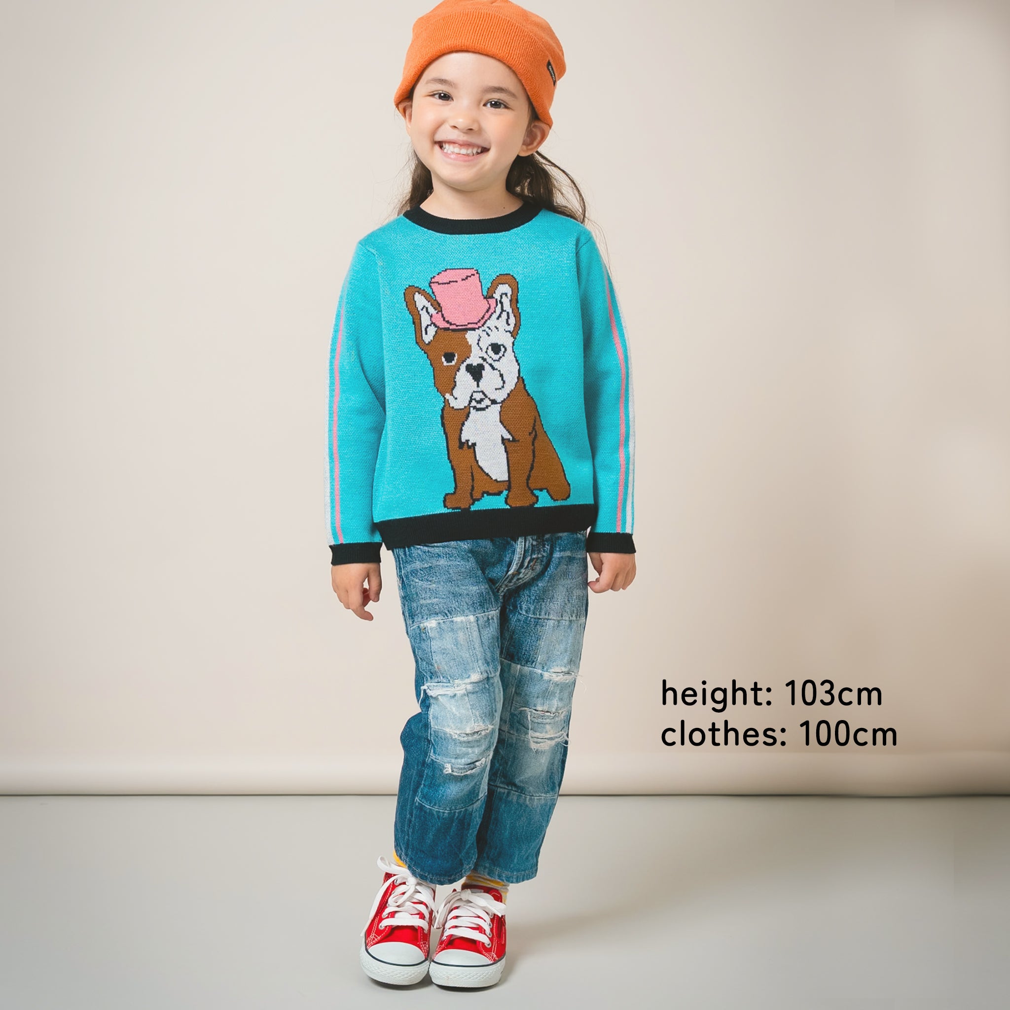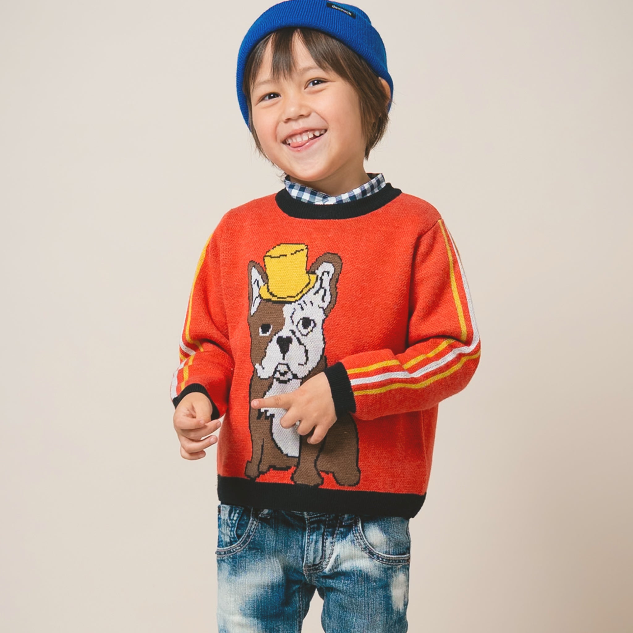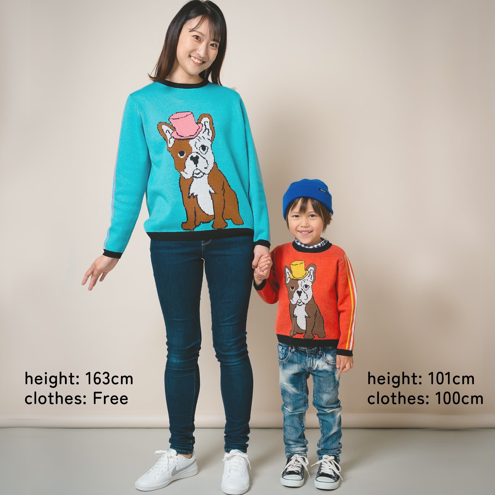 帽子をかぶったブルドッグと一緒にお出かけ♪ カラフル&ポップな親子リンクニット