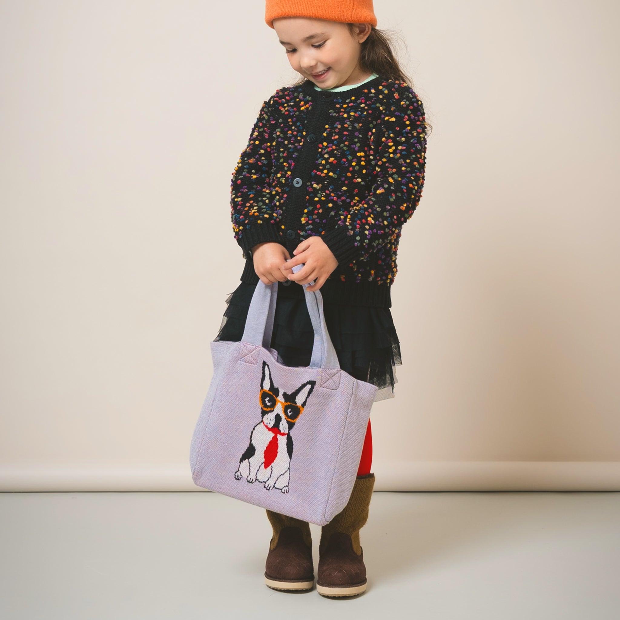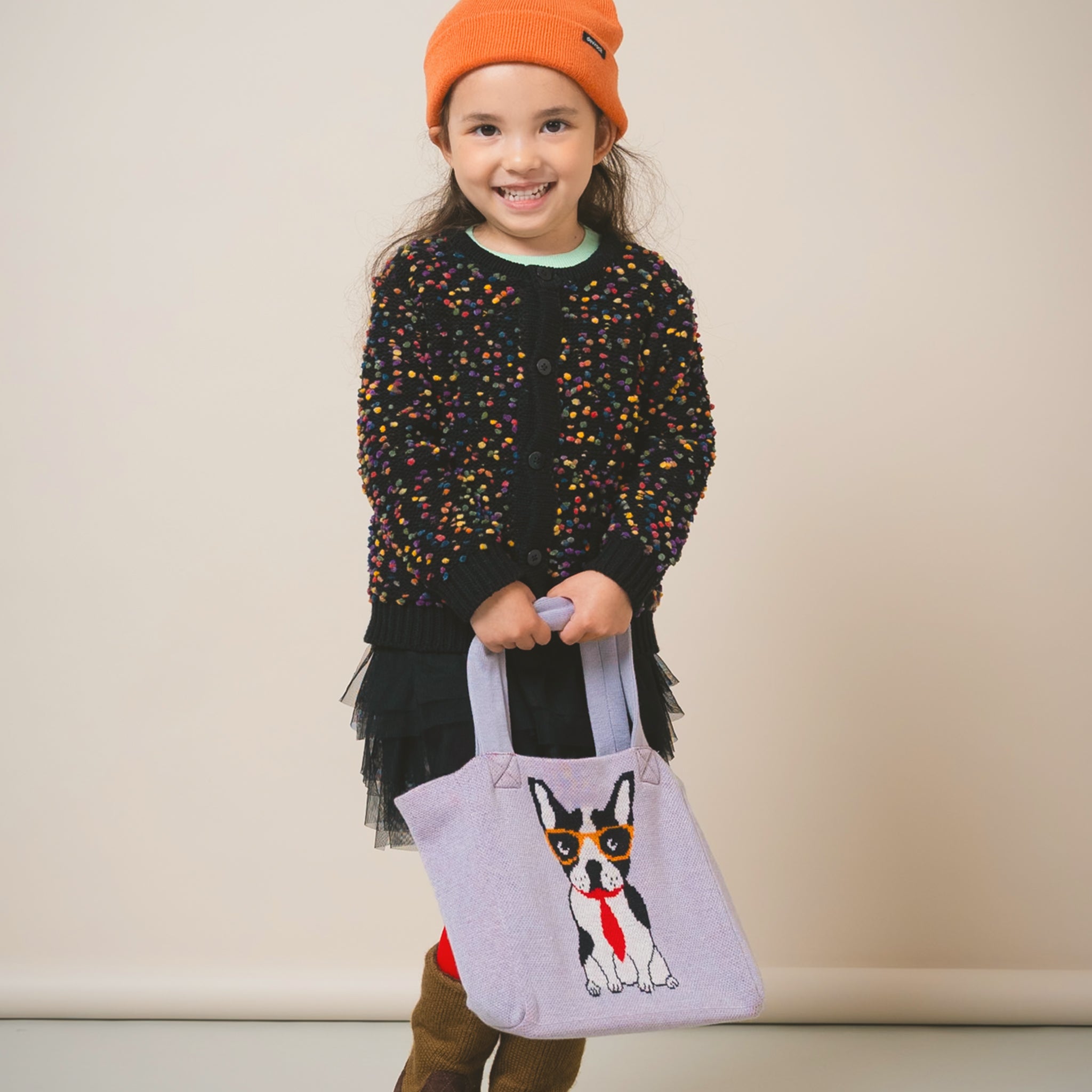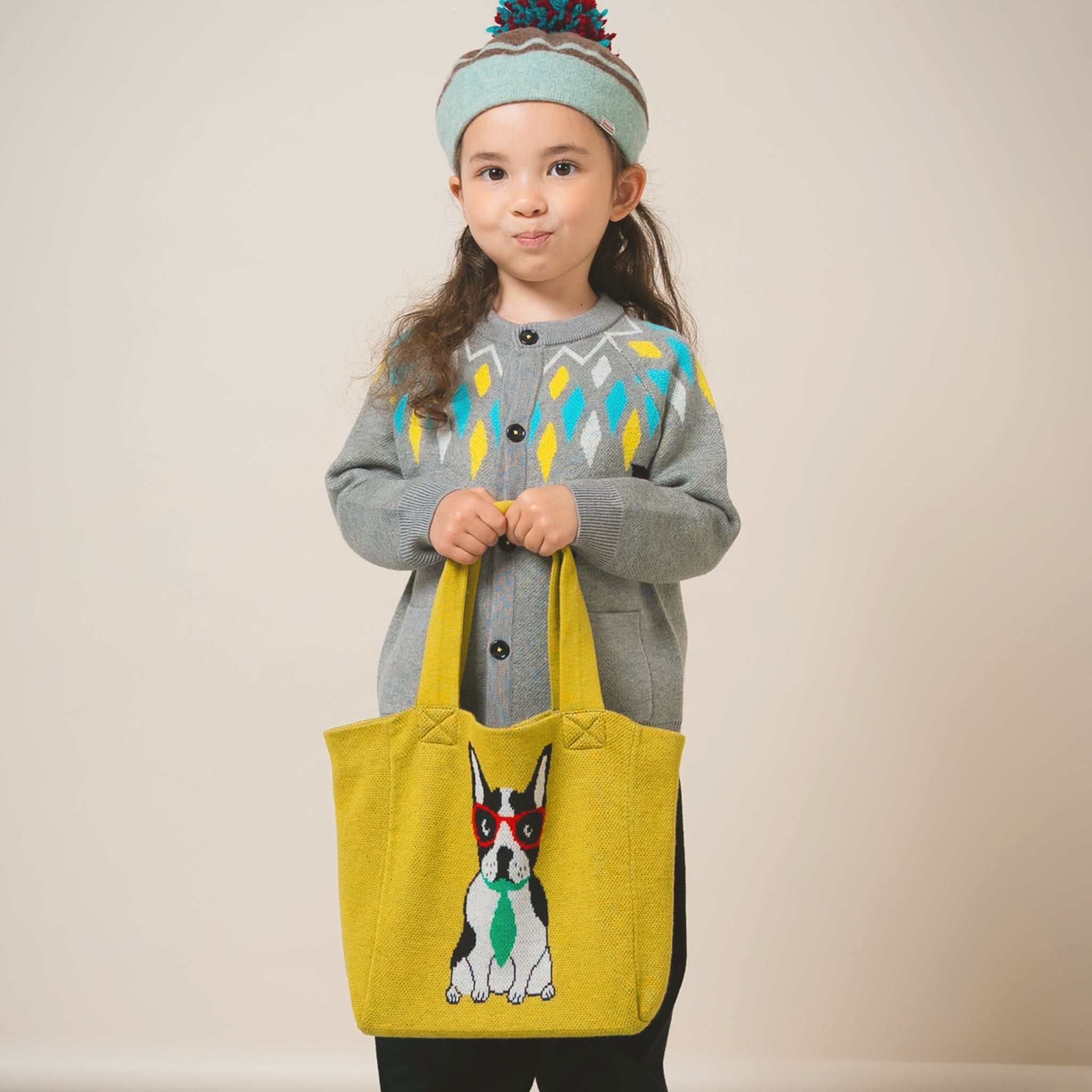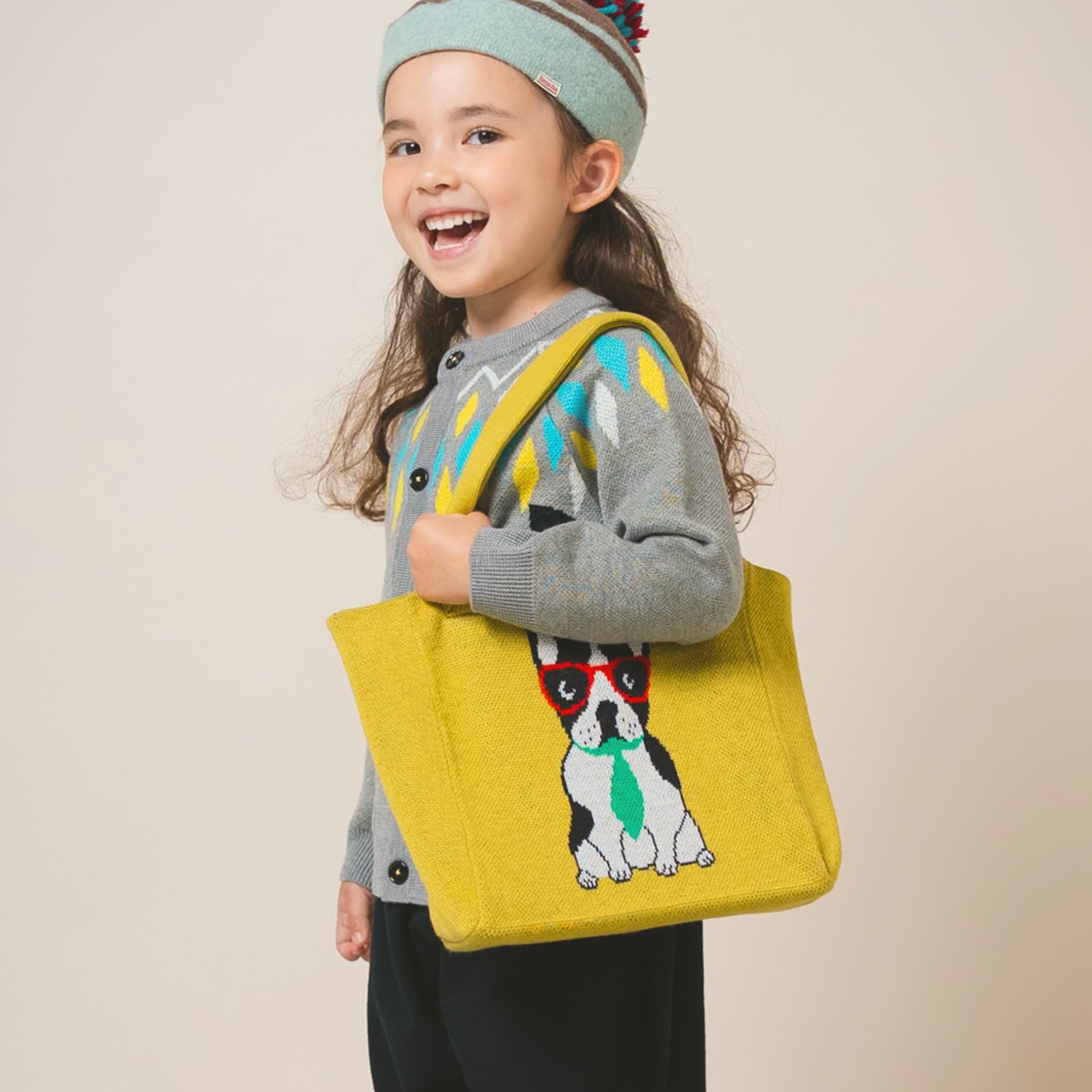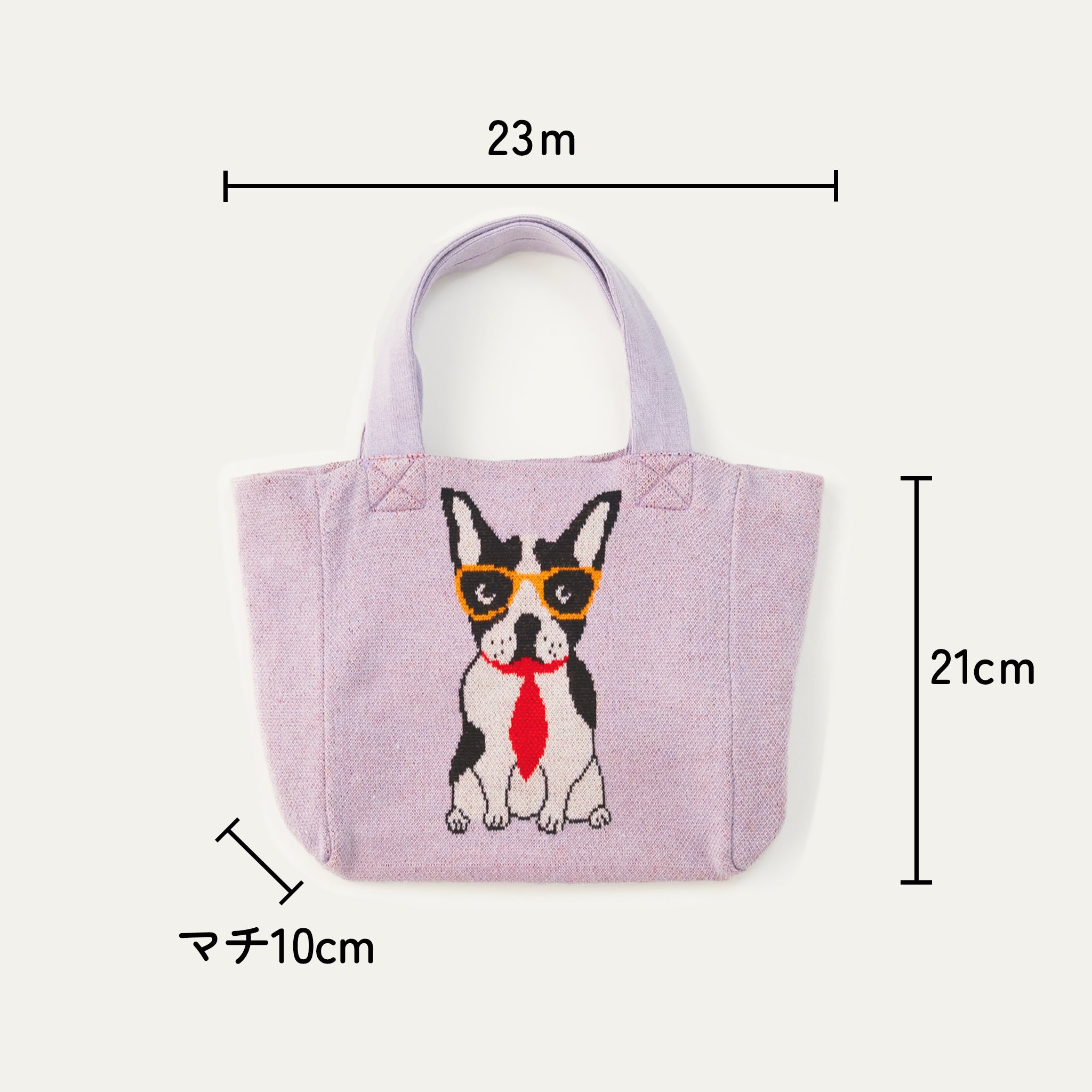 ニット素材と遊び心のあるブルドッグモチーフが、通学バッグ・通勤バッグとしても◎。シンプルな服装にバッグのアクセントが映えます。