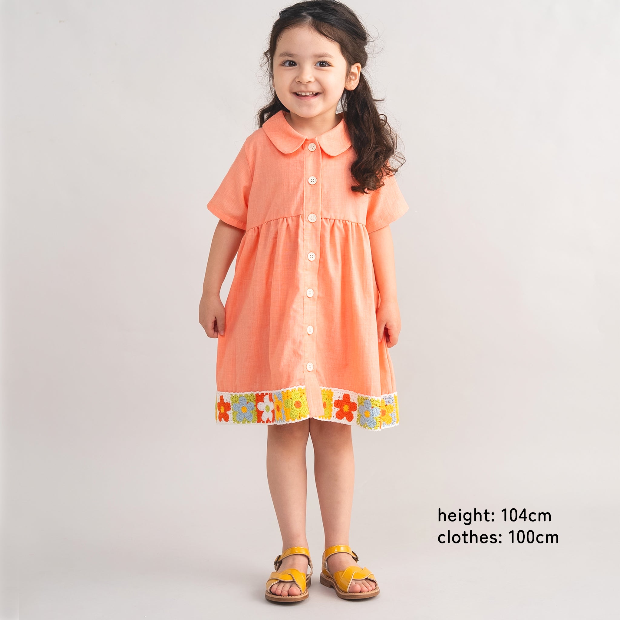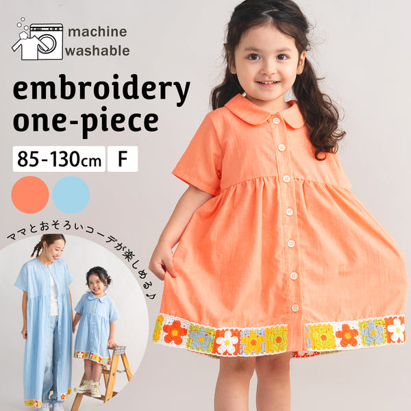 薄くて軽い、やわらかな生地を使用し、裾にかぎ針編みを施したワンピース。 ふんわりと空気を含むような素材感で、暑い季節も涼しく快適に着られます。 動くたびに自然に揺れるシルエットが女の子らしく、1枚でさらっと着るだけで夏らしい装いに。 カラーは、明るく元気な印象のオレンジと、爽やかなサックスの2色展開。 首元はやさしい雰囲気の丸衿デザインで、きちんと感と可愛らしさをプラスしました。 裾にはカラフルなフラワーかぎ針編みをあしらい、シンプルながらも目を引くアクセントに。 前開き仕様でお着替えもしやすく、デイリーからお出かけまで幅広く活躍。 ママサイズはノーカラーのロングタイプ。 前ボタンを留めてワンピースとしてはもちろん、ボタンを開けて羽織りとしても着用でき、コーディネートの幅が広がります。 夏のお出かけや特別な日に取り入れたい、軽やかで涼しげなキッズワンピースです。 |