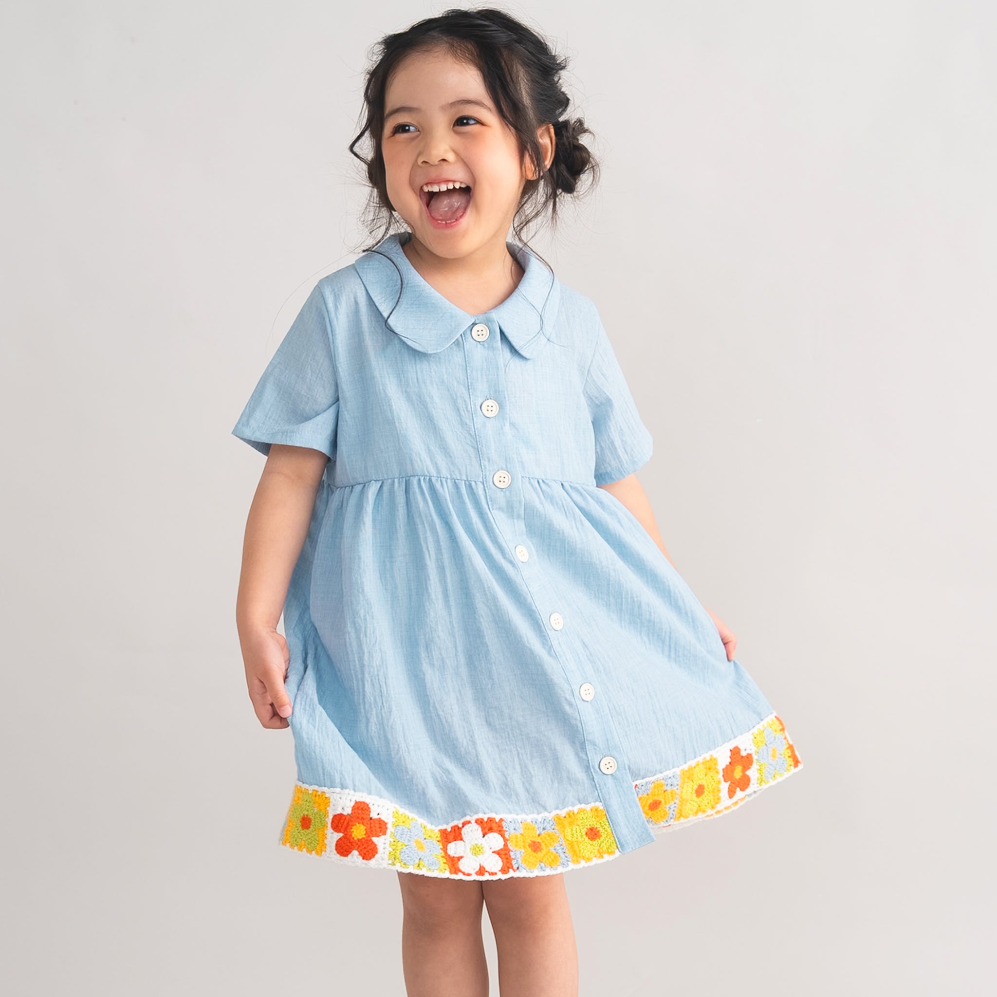 動くたびにふんわり揺れるシルエットがとてもかわいく、裾のかぎ針編みのお花柄がさりげないポイントに。