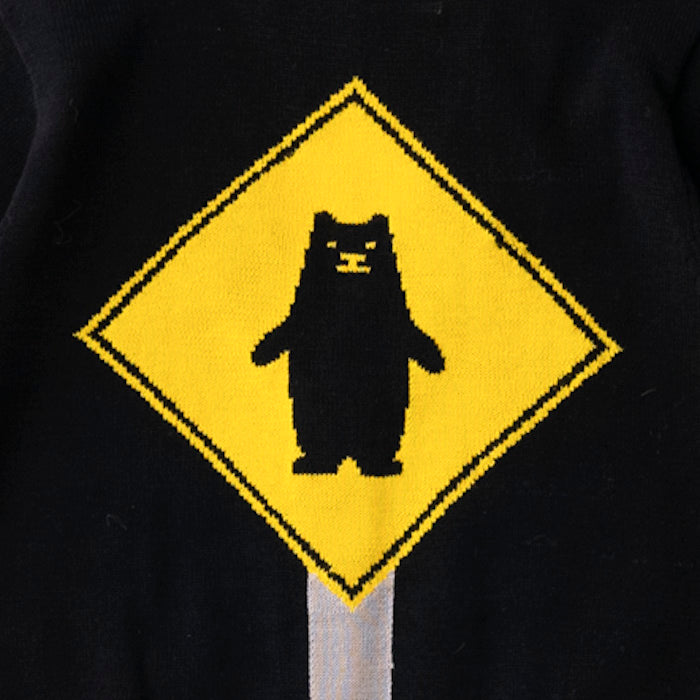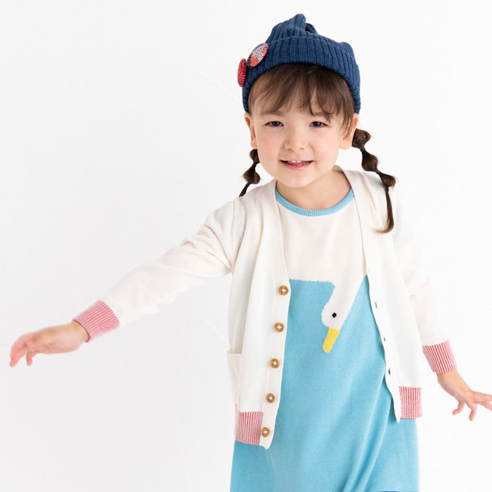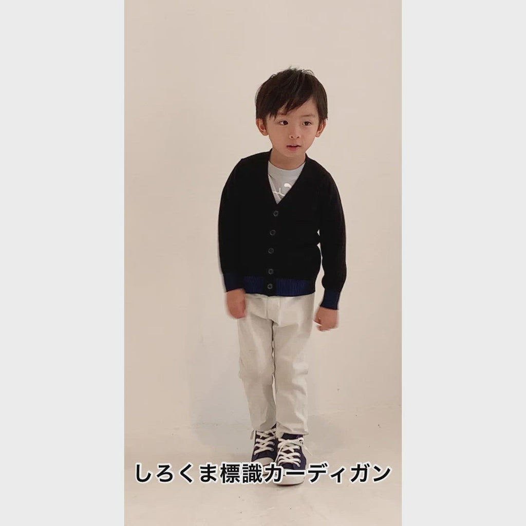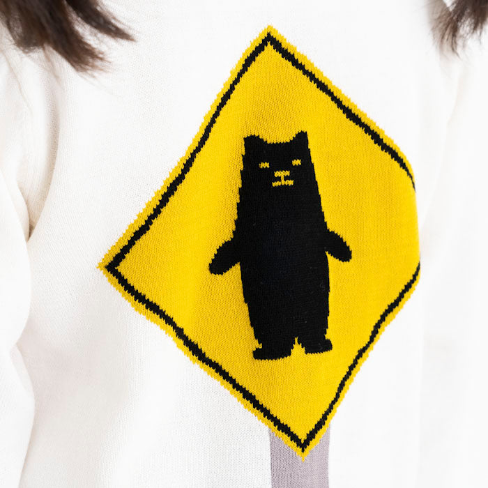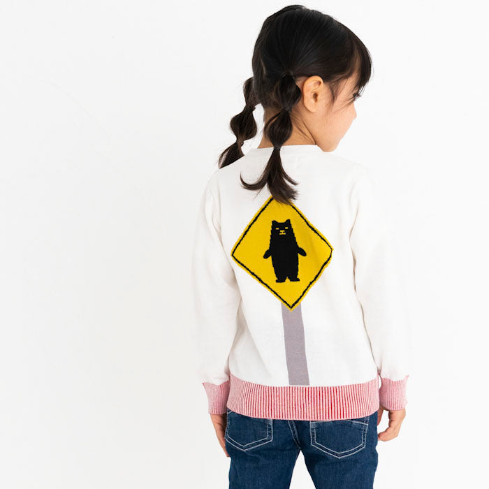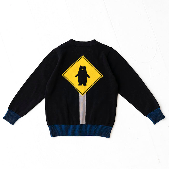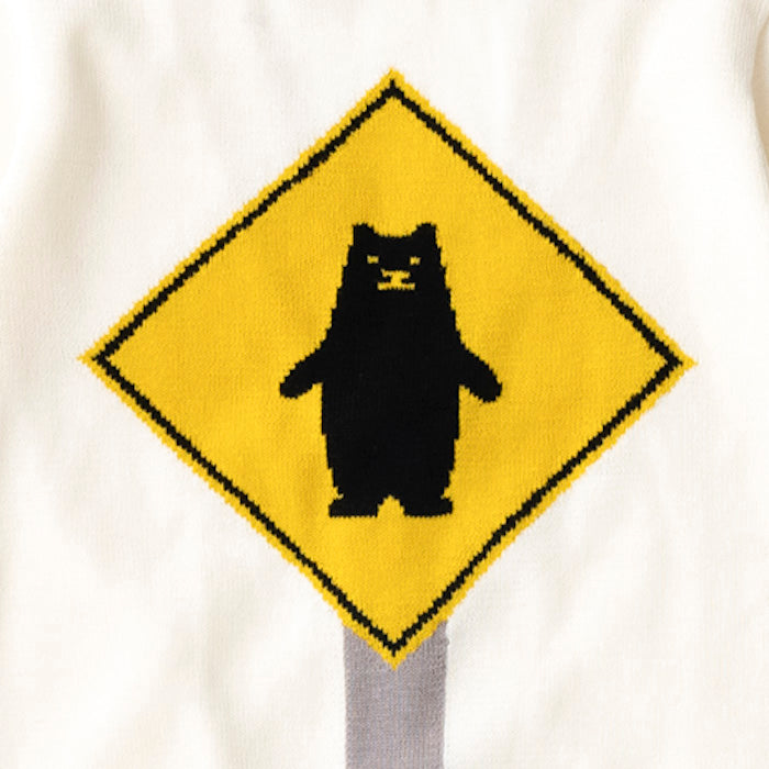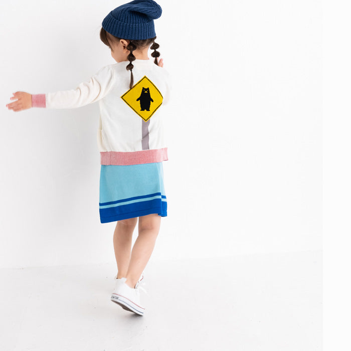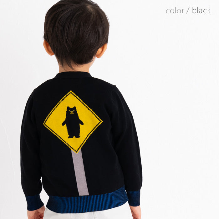 背中にシロクマ出没注意標識が編み込まれたコットンニットカーディガンです。シロクマ出没注意標識は裏に糸が渡らないインターシャ編みで編まれていますので、お着替えのときも指がひっかかりません。やわらかくて伸縮性のあるニットはお子様の身体と動きにぴったりフィットします。