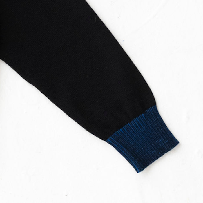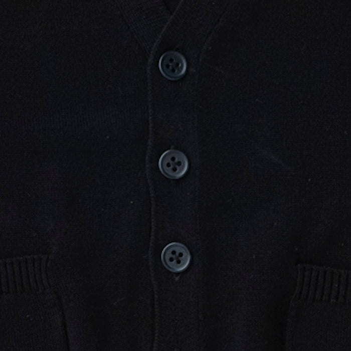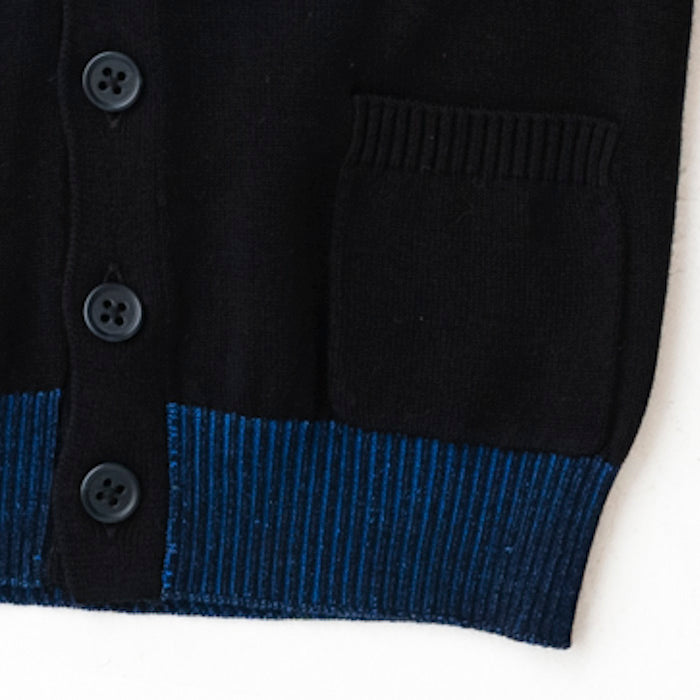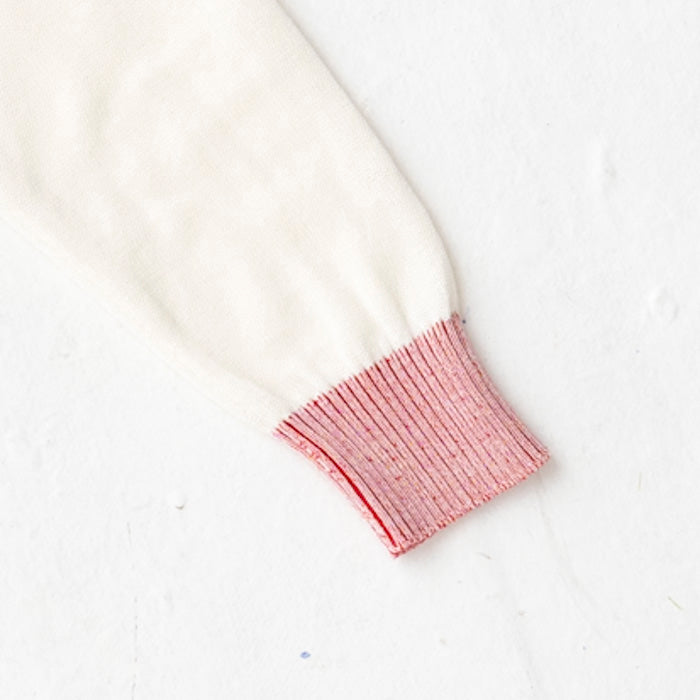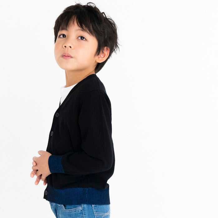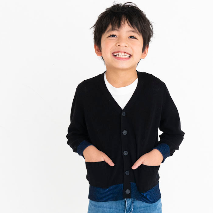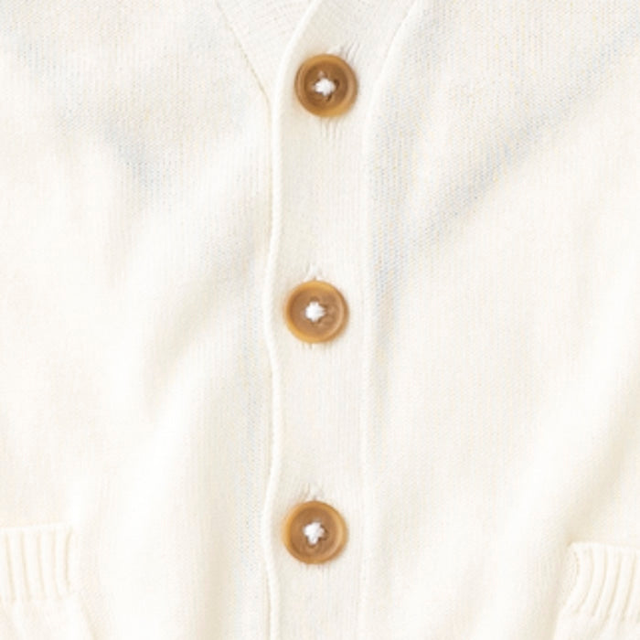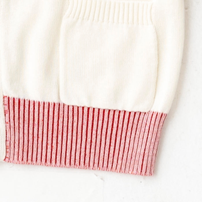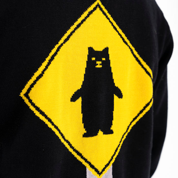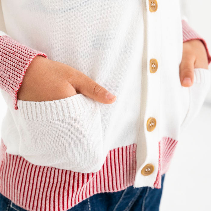 背中にシロクマ出没注意標識が編み込まれたコットンニットカーディガンです。シロクマ出没注意標識は裏に糸が渡らないインターシャ編みで編まれていますので、お着替えのときも指がひっかかりません。やわらかくて伸縮性のあるニットはお子様の身体と動きにぴったりフィットします。