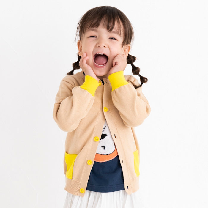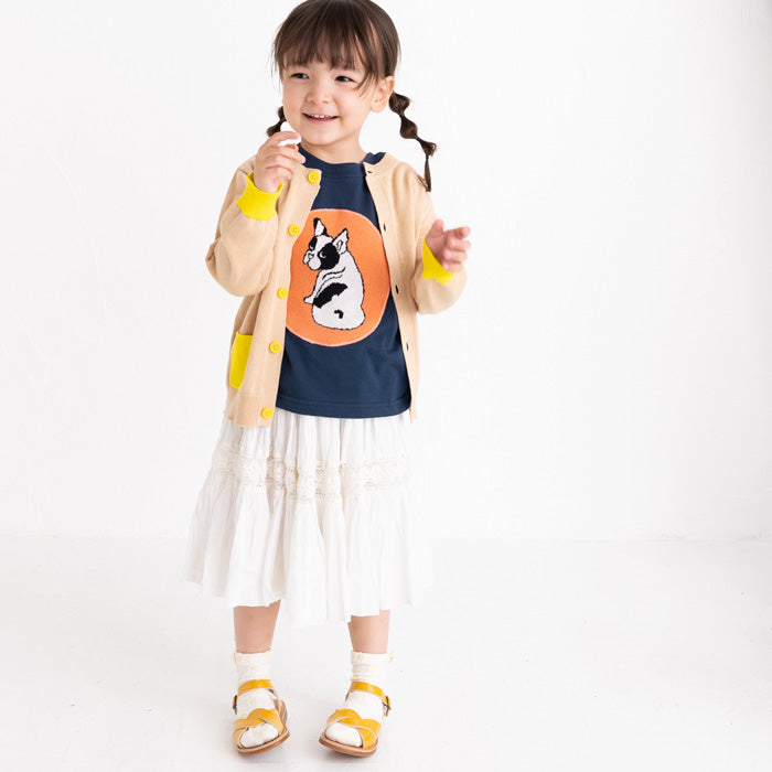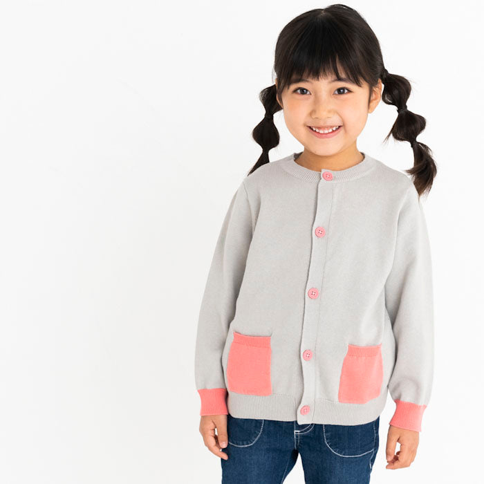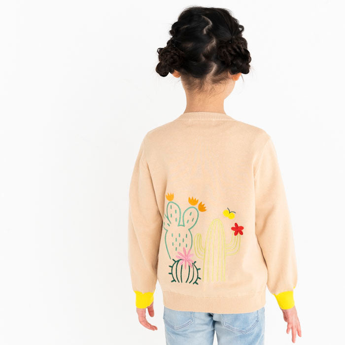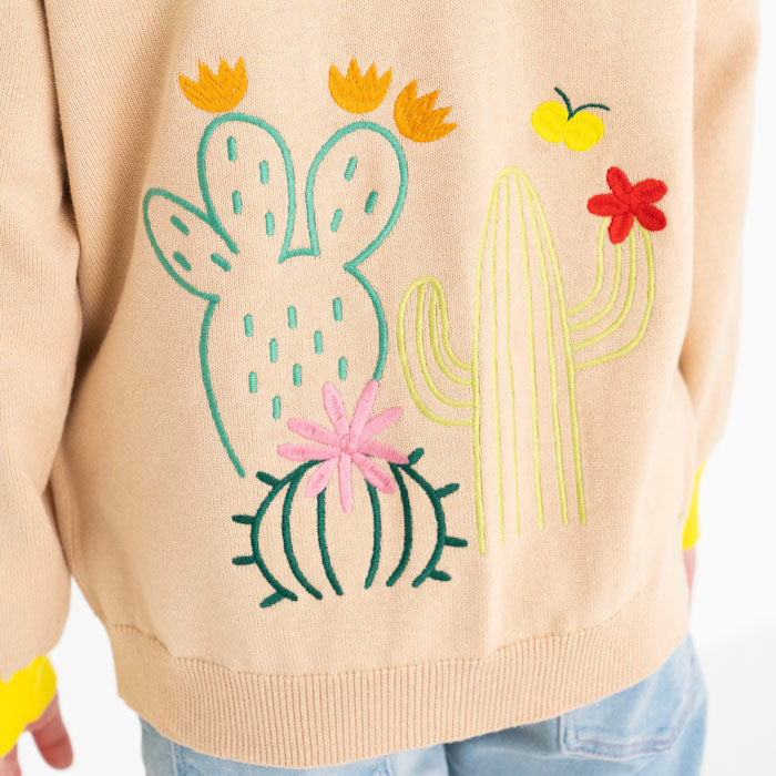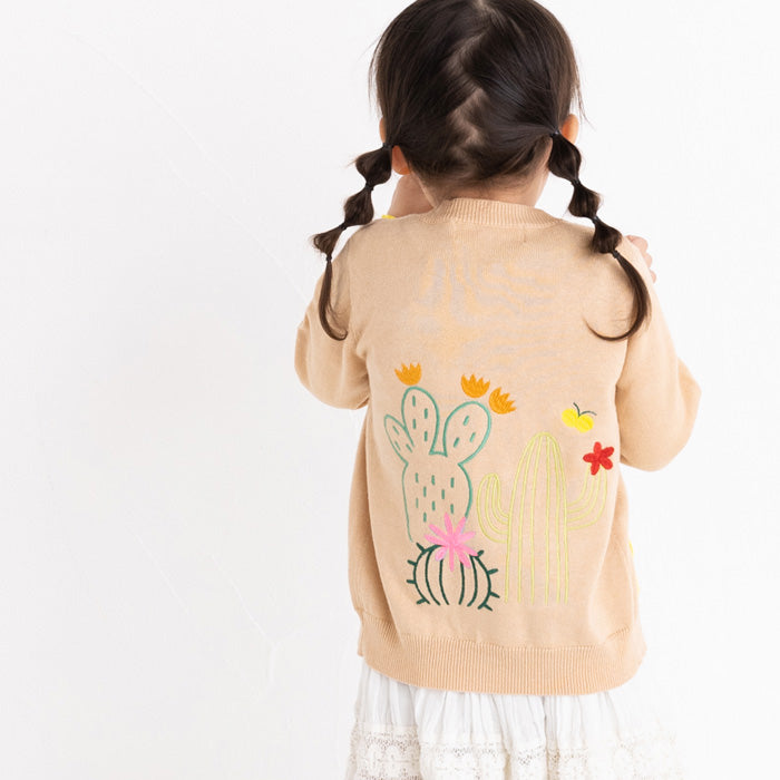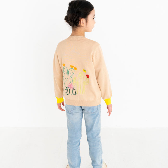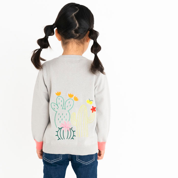 背中にサボテン、お花の刺繍が入ったコットンカーディガンです。前身頃のポケットと袖口・ボタンに異なるカラーを配色してアクセントを加えました。背中の刺繍はとてもキレイな刺繍でお子様の後ろ姿が可愛さ倍増しますよ!フリルスカートを合わせて、より女の子らしさを引き立てるコーディネートもオススメです。