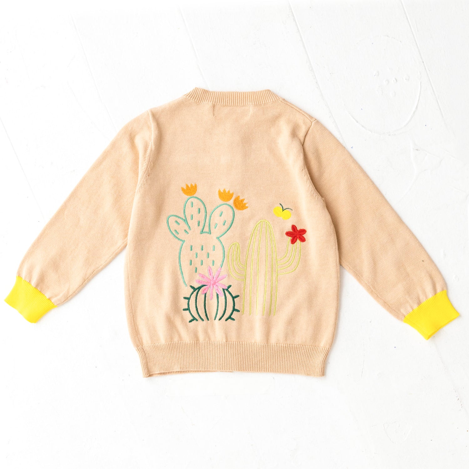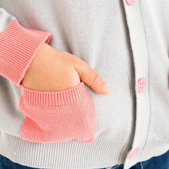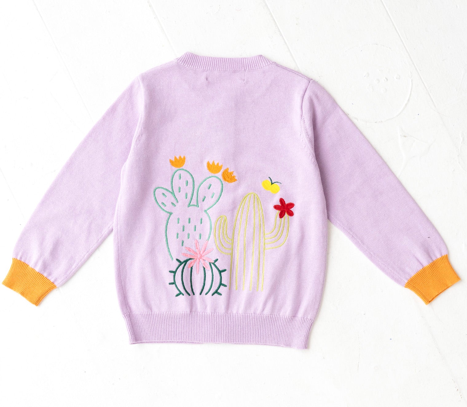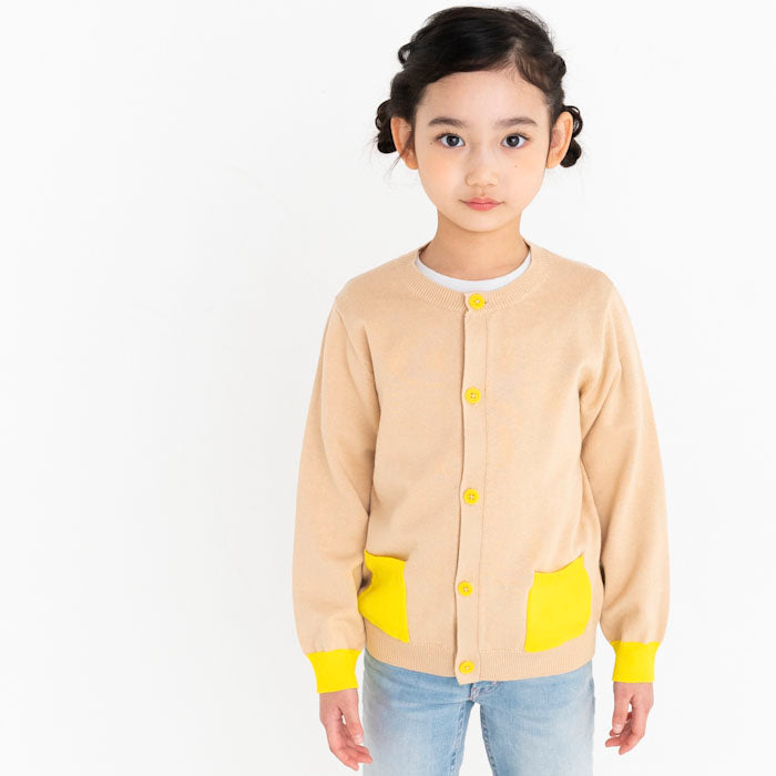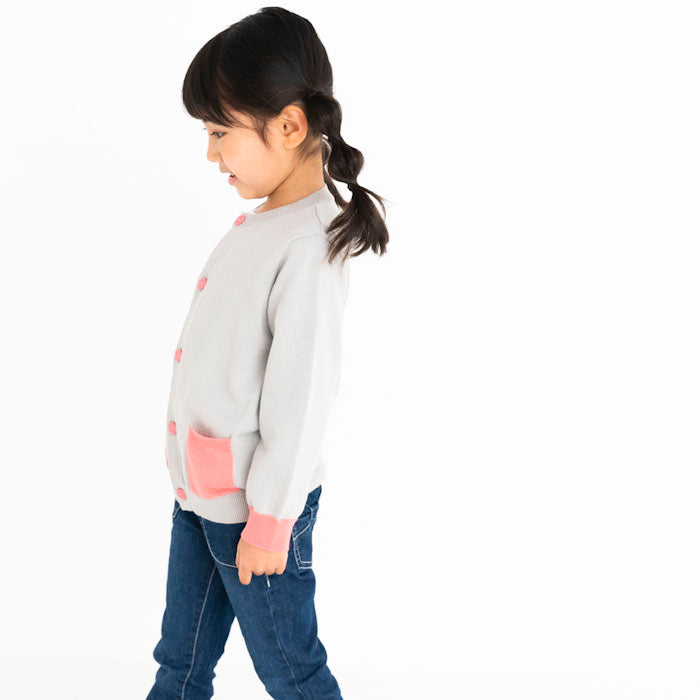 背中にサボテン、お花の刺繍が入ったコットンカーディガンです。前身頃のポケットと袖口・ボタンに異なるカラーを配色してアクセントを加えました。背中の刺繍はとてもキレイな刺繍でお子様の後ろ姿が可愛さ倍増しますよ!フリルスカートを合わせて、より女の子らしさを引き立てるコーディネートもオススメです。