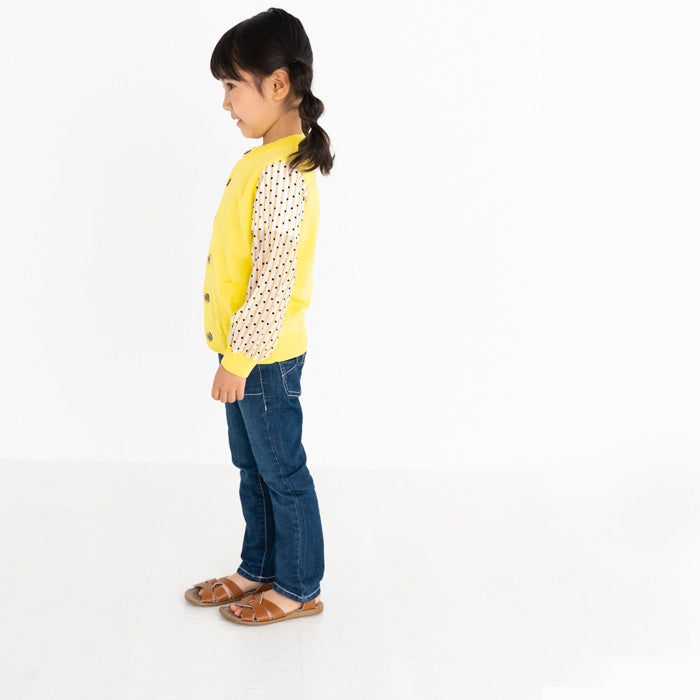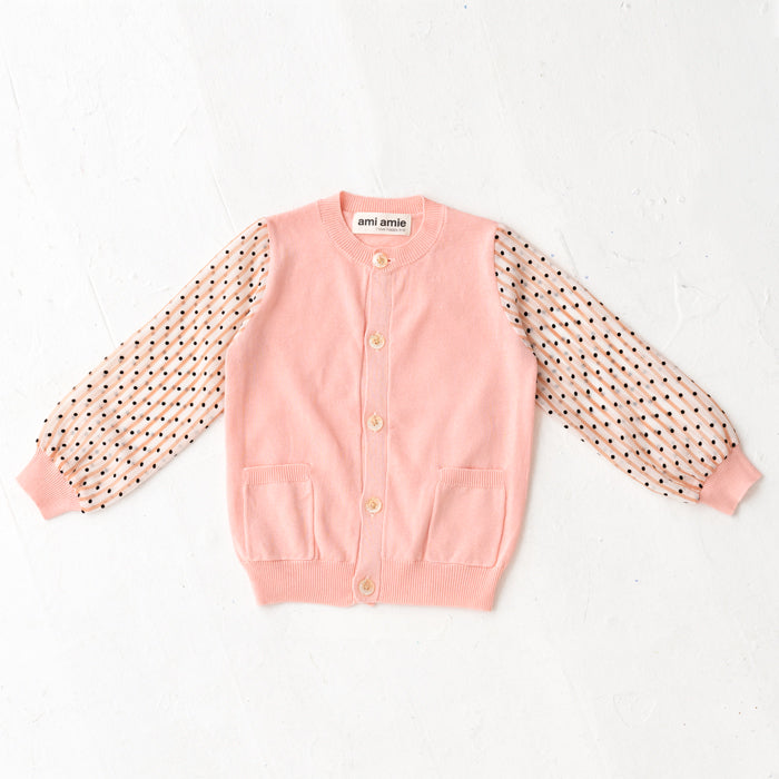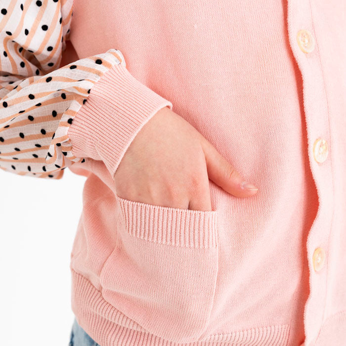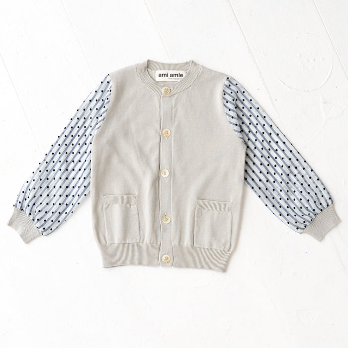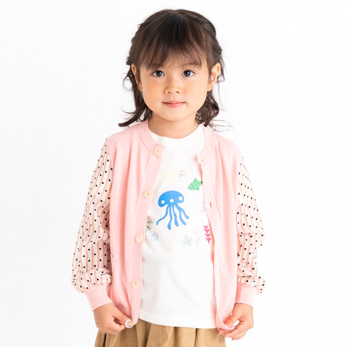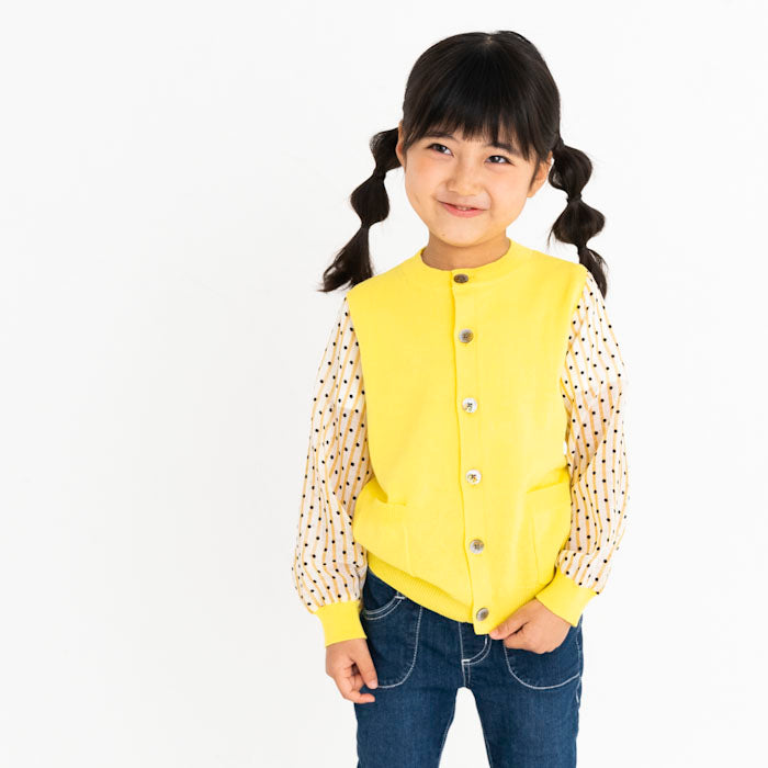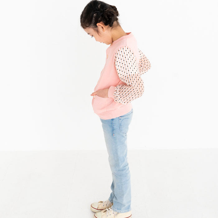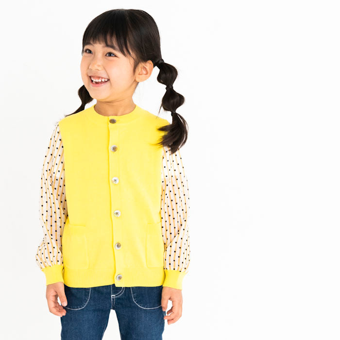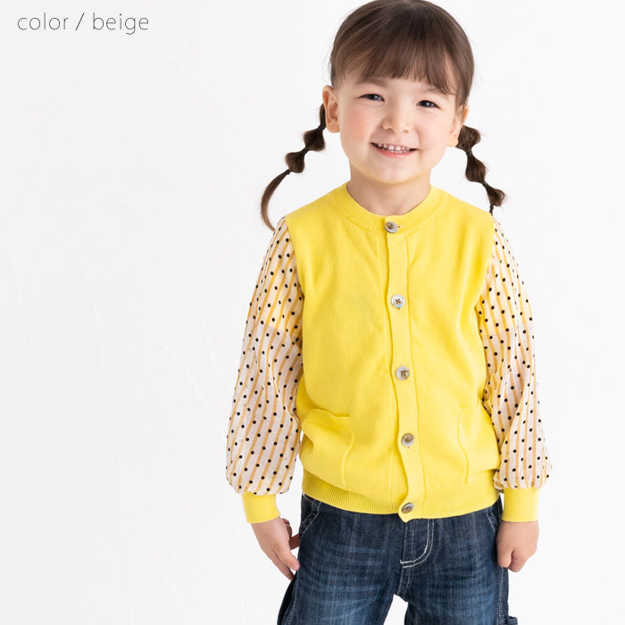 シフォンのお袖が涼しげなコットンニットカーディガンです。やわらかくて伸縮性のあるニットはお子様の身体と動きにぴったりフィットします。キラキラボタンが付いていてお子様も目を輝かせること間違いなし☆お袖のシフォン生地はドット柄×ストライプ柄です。