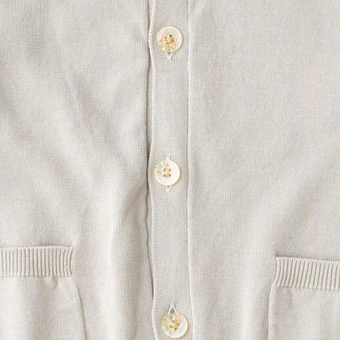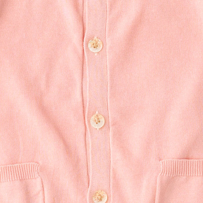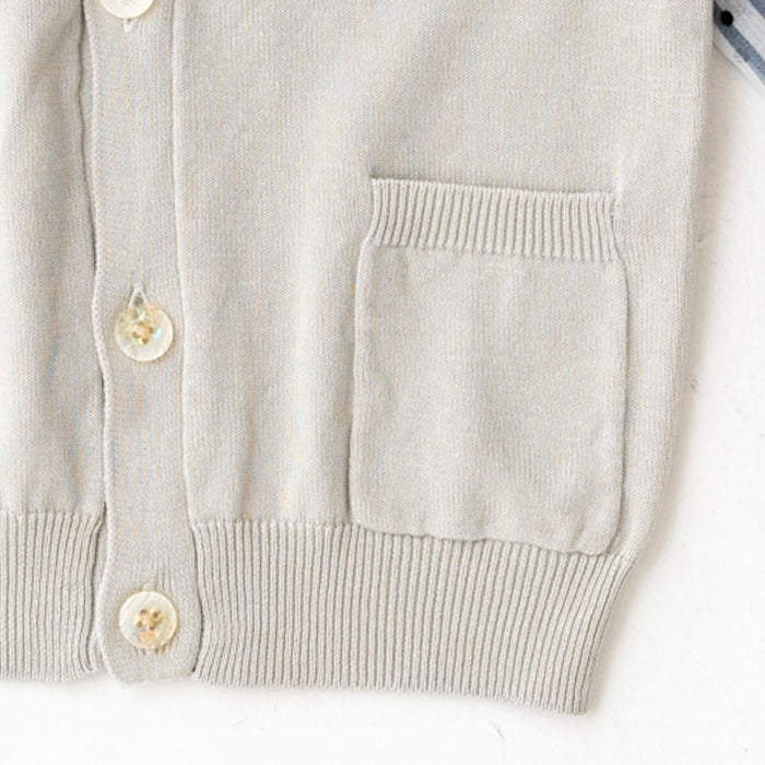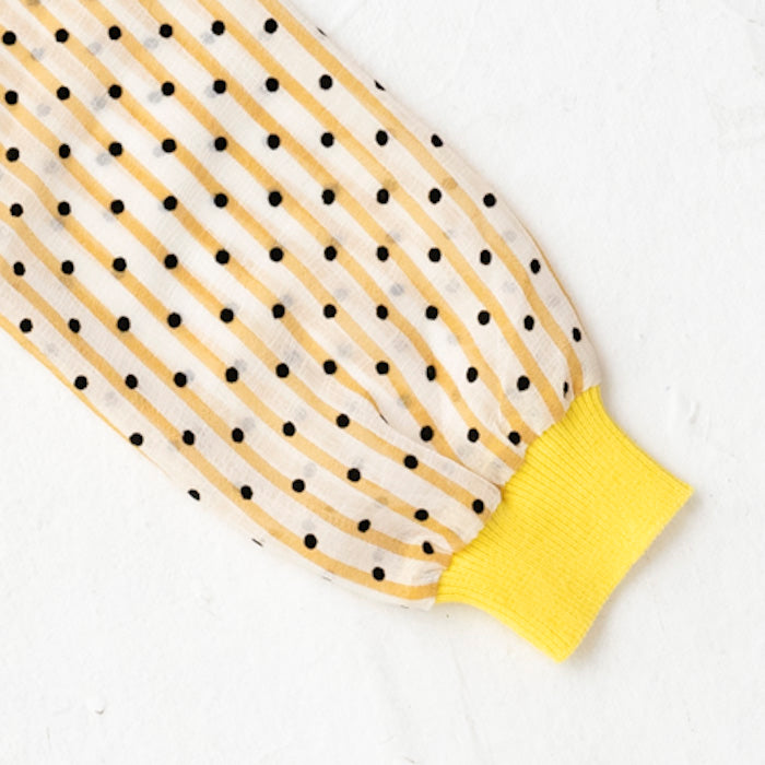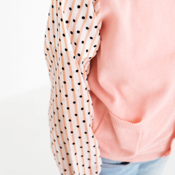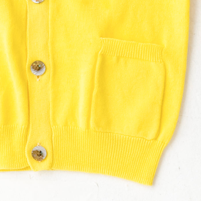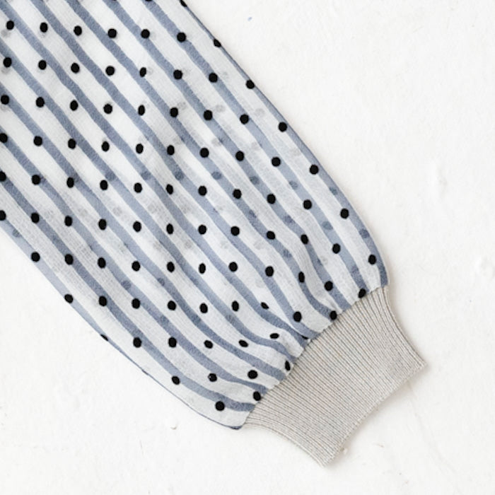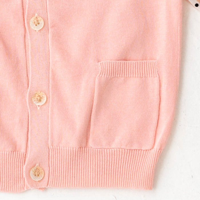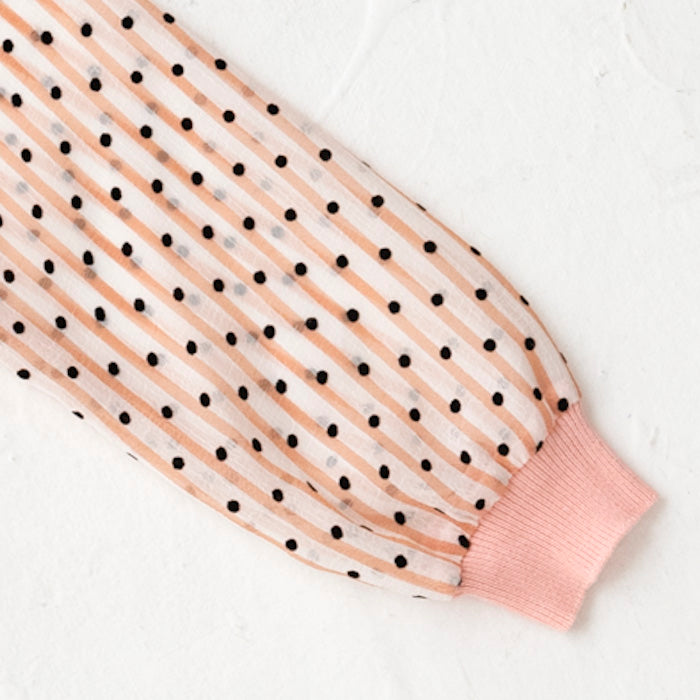 シフォンのお袖が涼しげなコットンニットカーディガンです。やわらかくて伸縮性のあるニットはお子様の身体と動きにぴったりフィットします。キラキラボタンが付いていてお子様も目を輝かせること間違いなし☆お袖のシフォン生地はドット柄×ストライプ柄です。