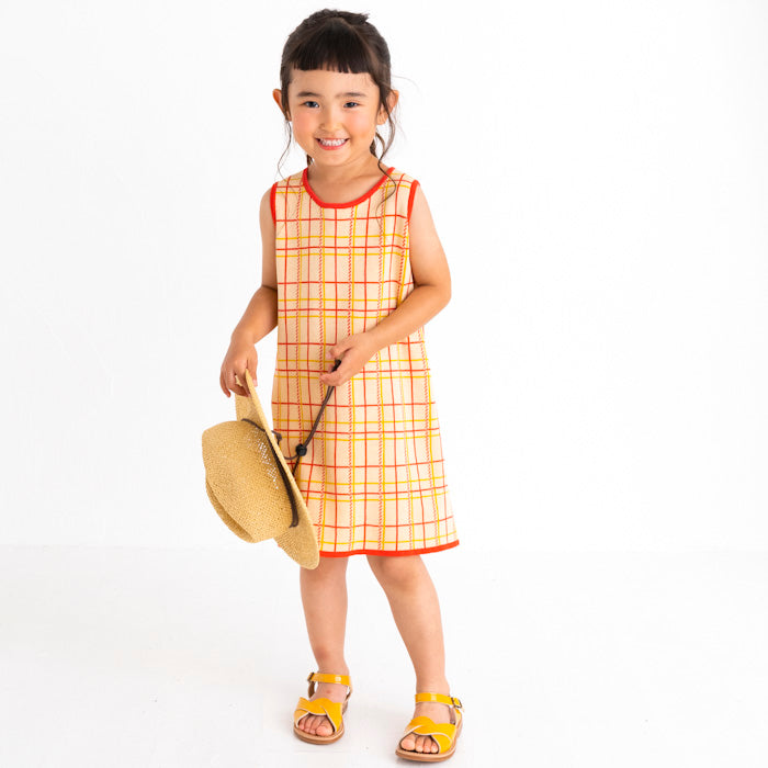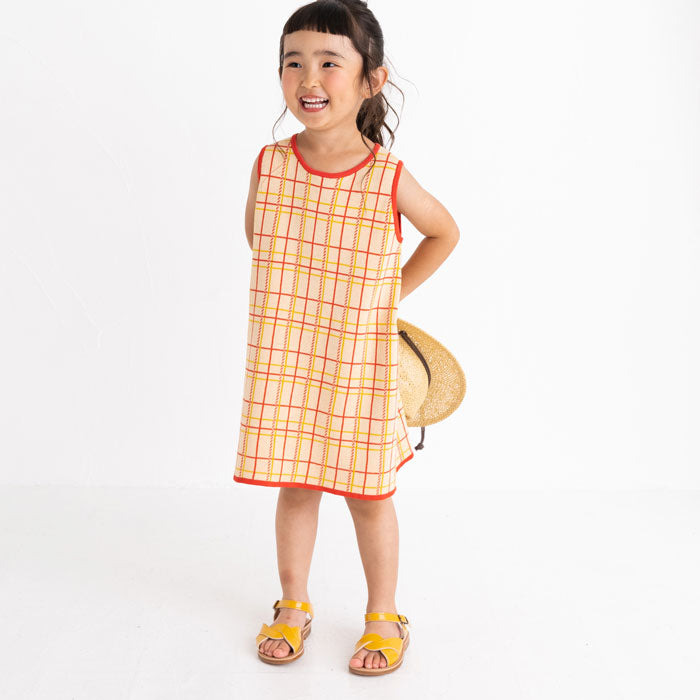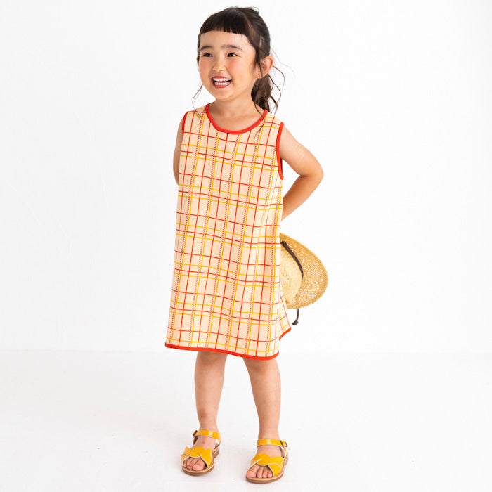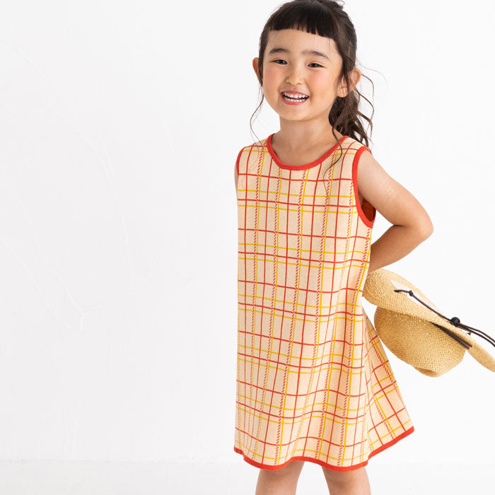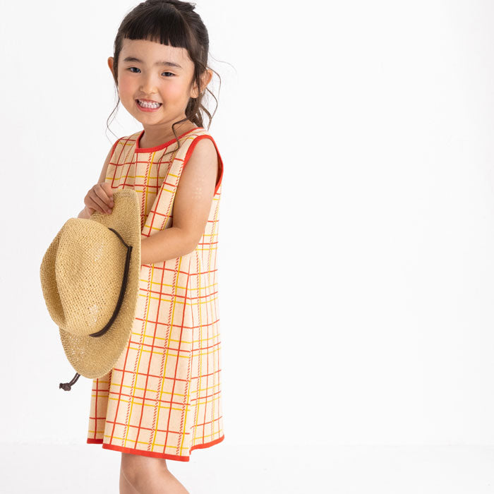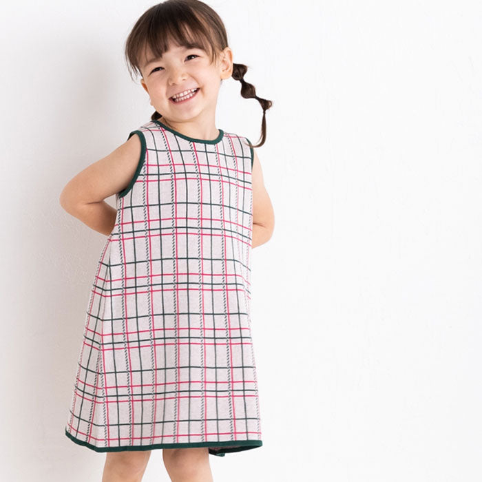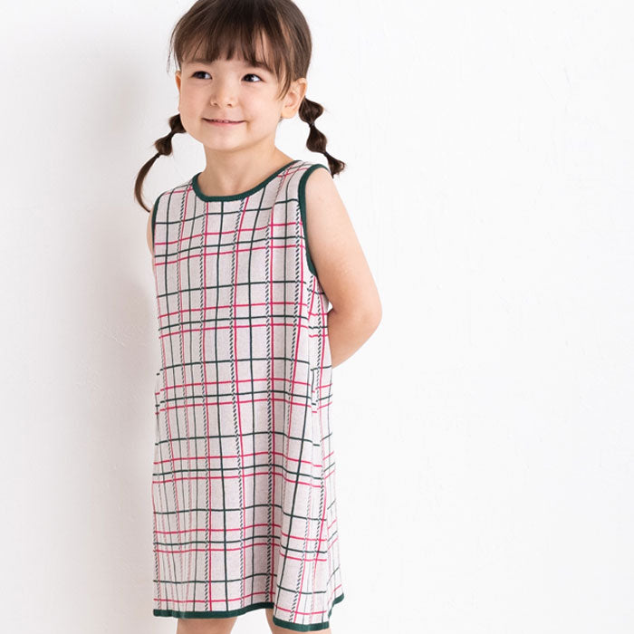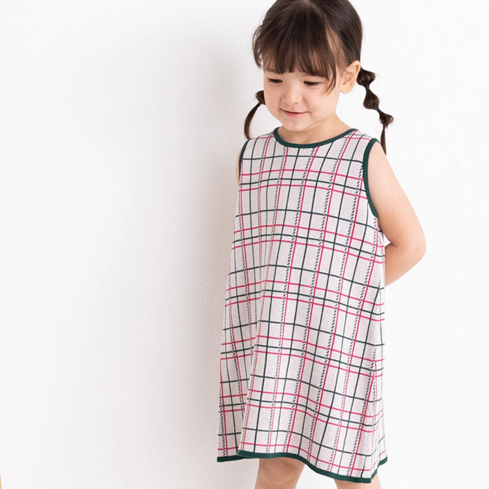 チェック柄のコットン100%のジャガードニットワンピースです。柔らかな肌ざわりで夏にも着やすく、一枚できても透けにくく、ほど良い厚みです。