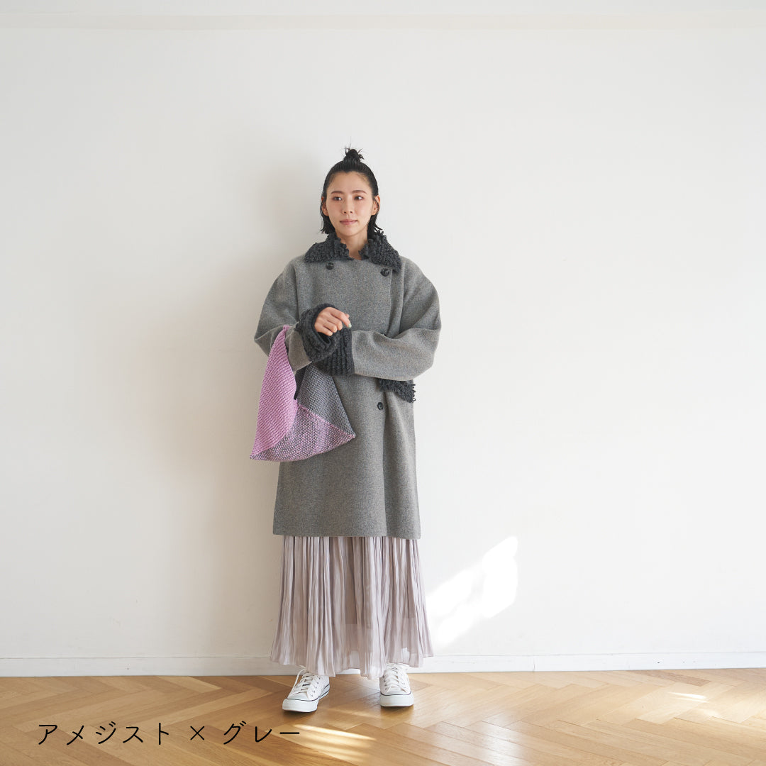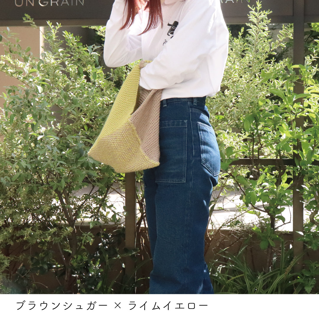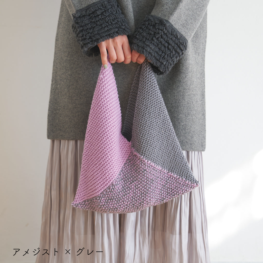 棒針編みの基礎的な編み方『ガーター編み』と『鹿の子編み』だけで可愛く仕上がります。長方形の編地をイレギュラーにはぎ合わせることでトライアングルになる工程も楽しみながら作っていただけます。2本どりで形がしっかり表現でき、さくさく編むことができますよ♪グラデーションも楽しめるのが2本取りならでは✨持ち手の部分は【プラクロッシェ】を使用しているので、春夏で手が汗ばんでも気になりにくいオールシーズン使いやすい作りになってます!色合わせ次第で全く雰囲気の違う仕上がりになるので、コーディネートに合わせて沢山作ってみてください♪