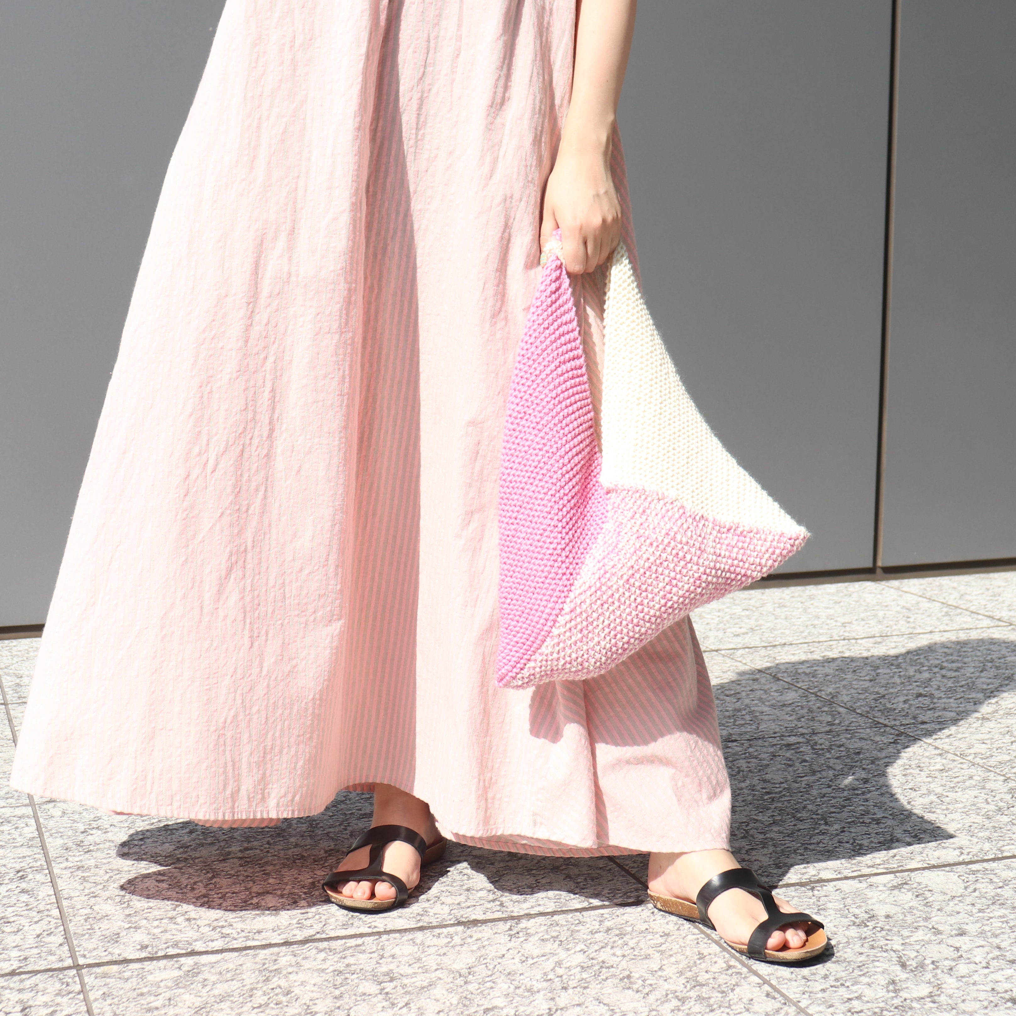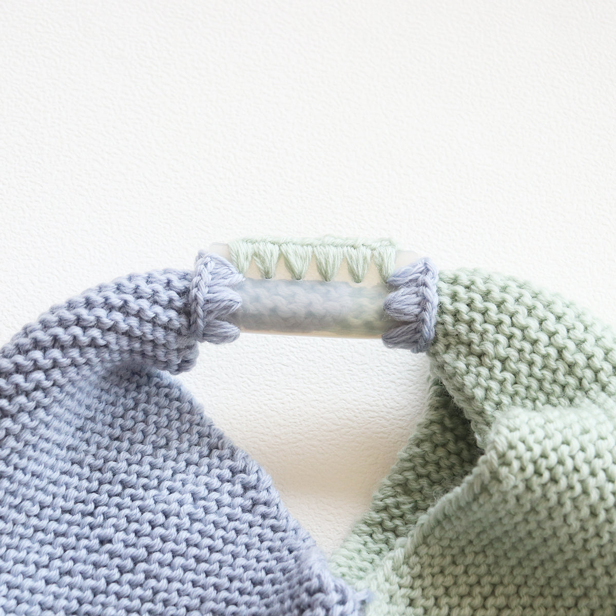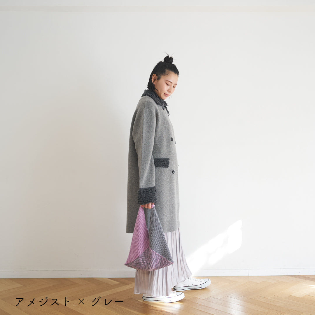 棒針編みの基礎的な編み方『ガーター編み』と『鹿の子編み』だけで可愛く仕上がります。長方形の編地をイレギュラーにはぎ合わせることでトライアングルになる工程も楽しみながら作っていただけます。2本どりで形がしっかり表現でき、さくさく編むことができますよ♪グラデーションも楽しめるのが2本取りならでは✨持ち手の部分は【プラクロッシェ】を使用しているので、春夏で手が汗ばんでも気になりにくいオールシーズン使いやすい作りになってます!色合わせ次第で全く雰囲気の違う仕上がりになるので、コーディネートに合わせて沢山作ってみてください♪