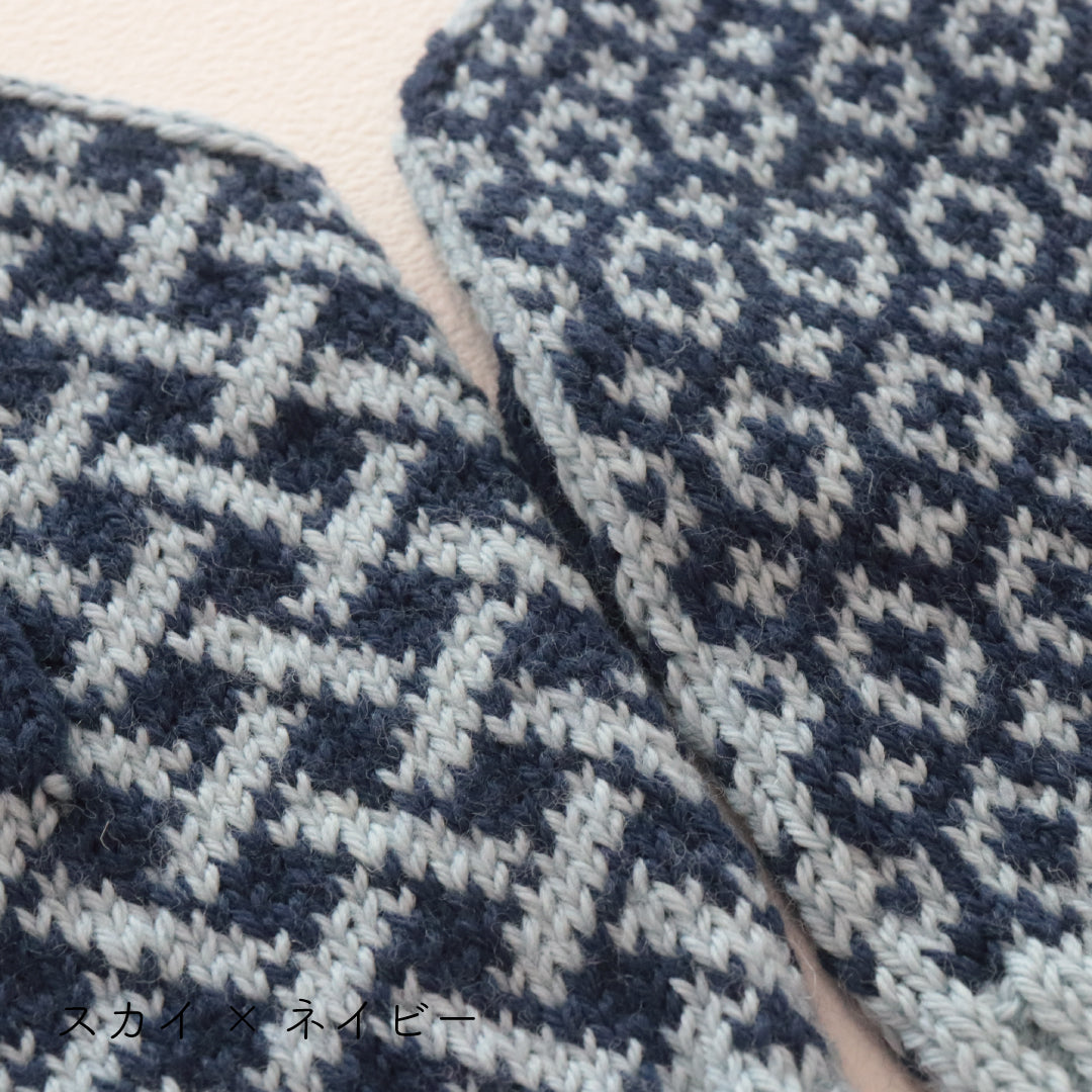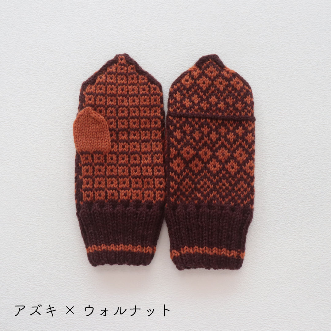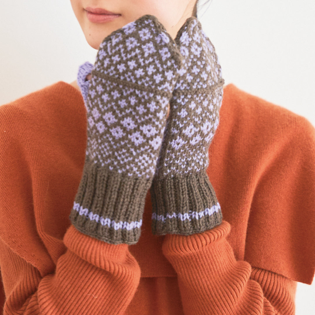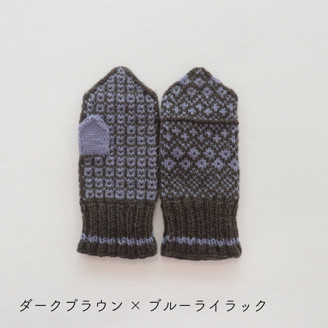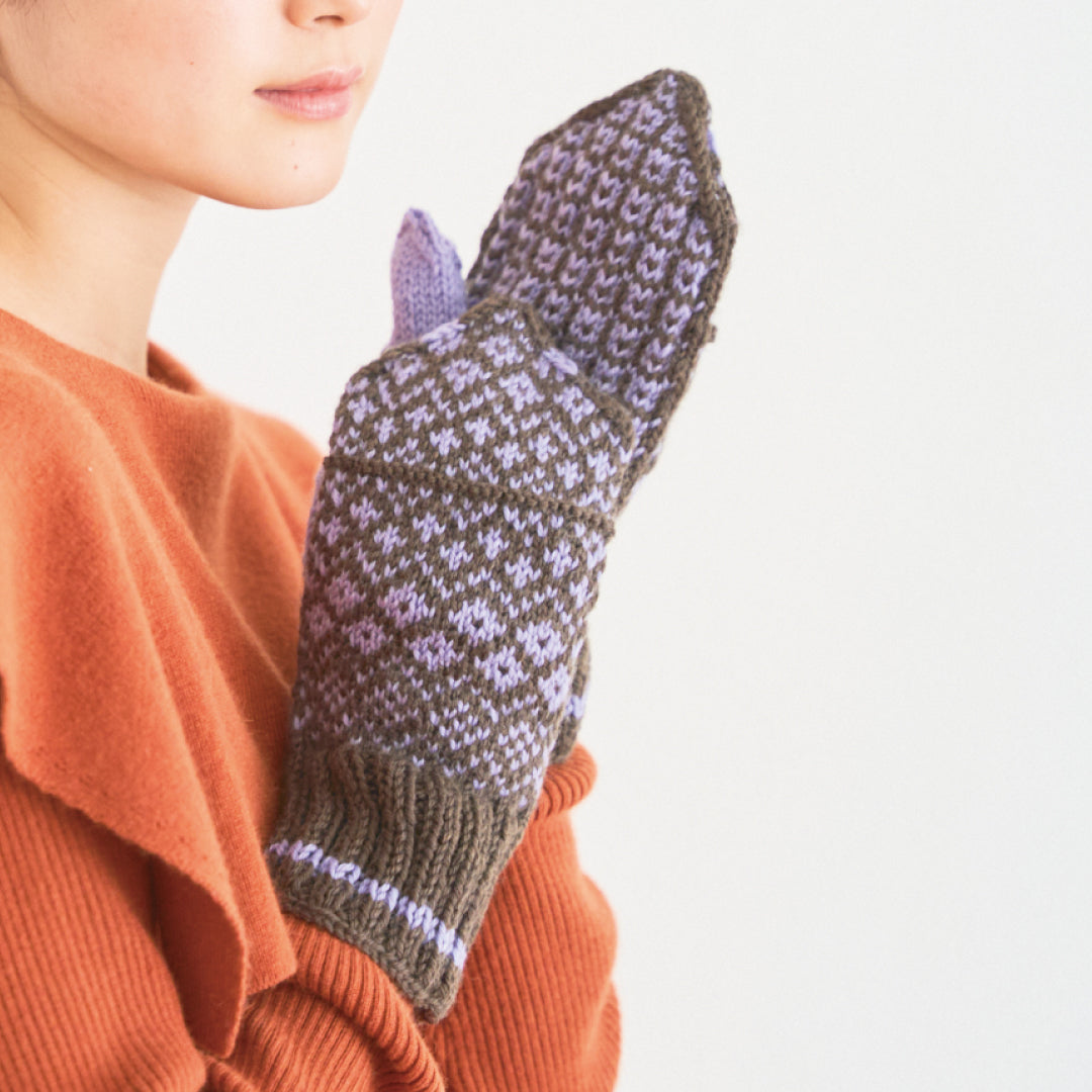手のひらと甲で違う編み込み模様で、編むのが楽しいデザインにしました。親指にはスマホ操作ができるよう小さな穴を開けています。スマートフォンを使うたびにミトンを外すのは面倒くさい…でも大きく指が出るデザインだと寒い…そんな時には親指をちょっとだけ出せるこのミトンがピッタリです!