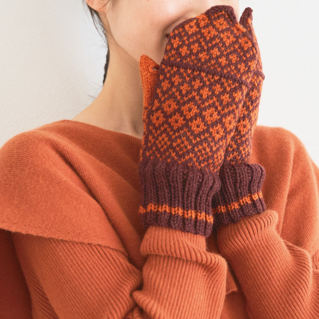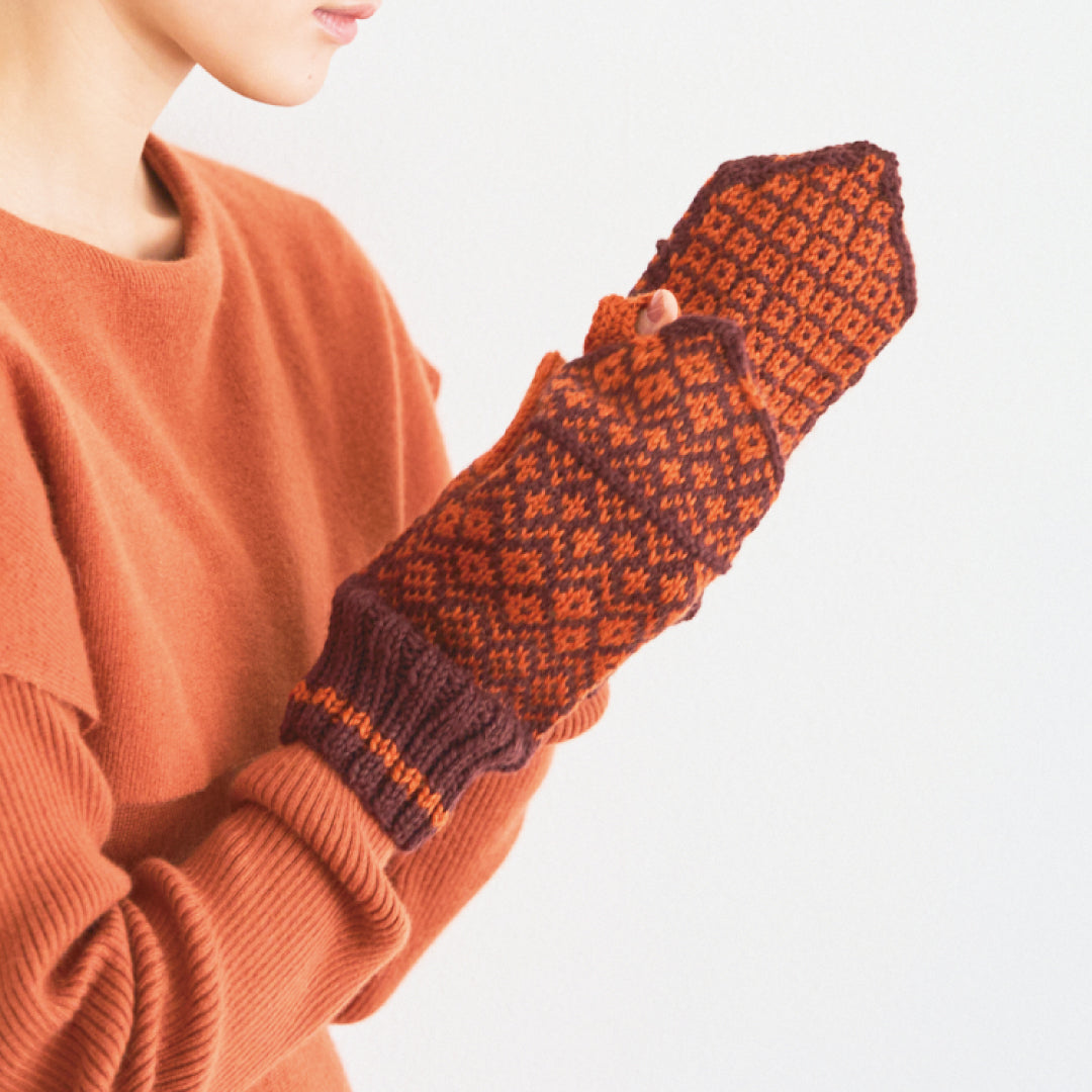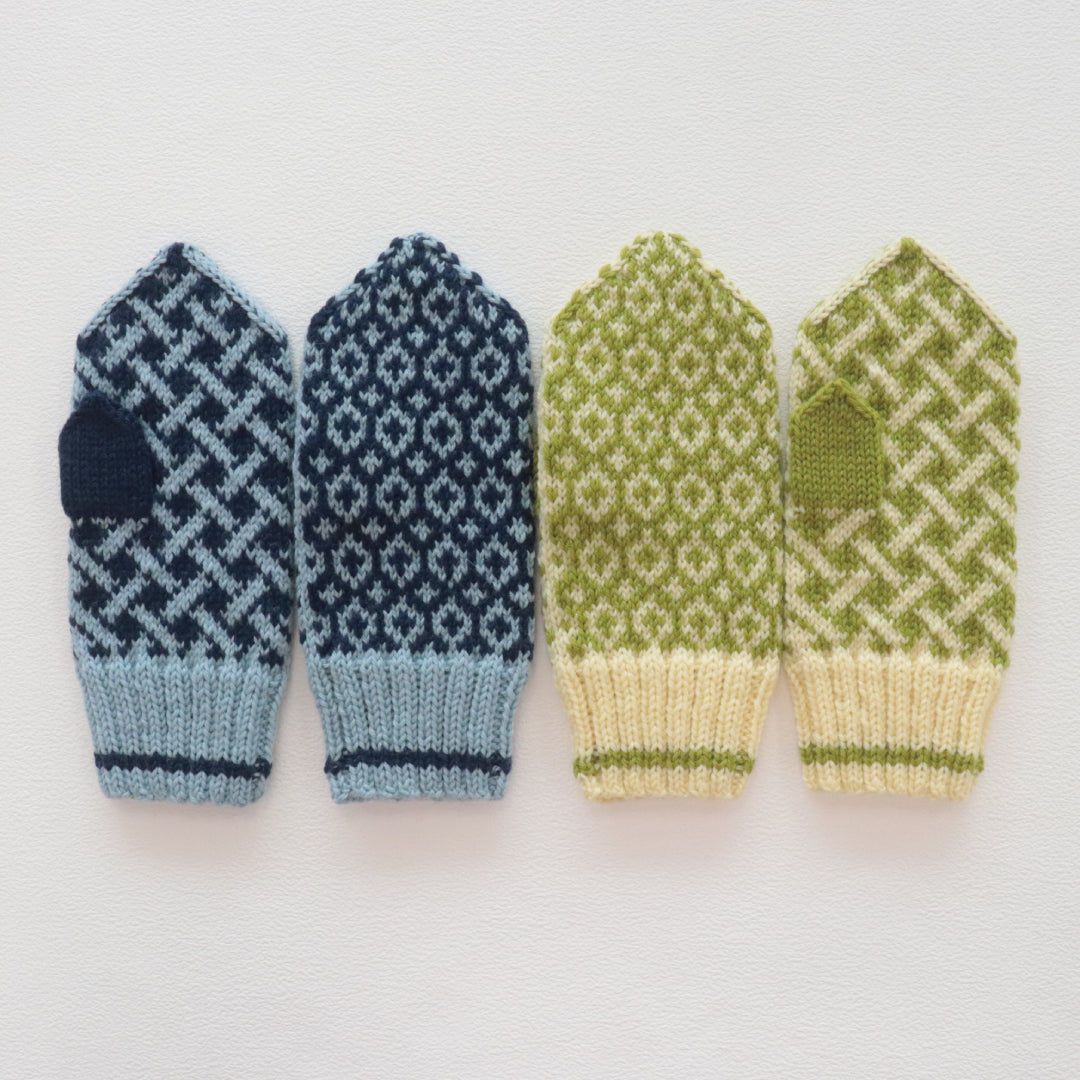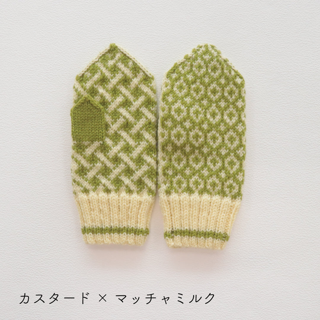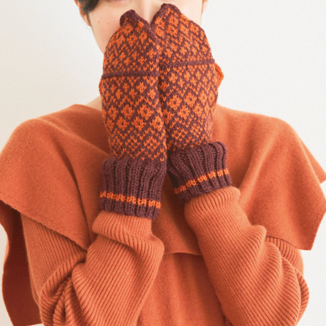 手のひらと甲で違う編み込み模様で、編むのが楽しいデザインにしました。親指にはスマホ操作ができるよう小さな穴を開けています。スマートフォンを使うたびにミトンを外すのは面倒くさい…でも大きく指が出るデザインだと寒い…そんな時には親指をちょっとだけ出せるこのミトンがピッタリです!