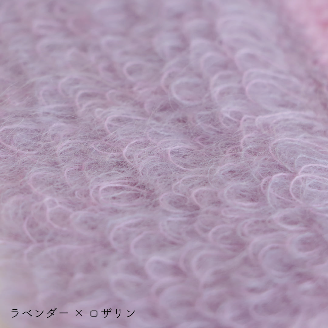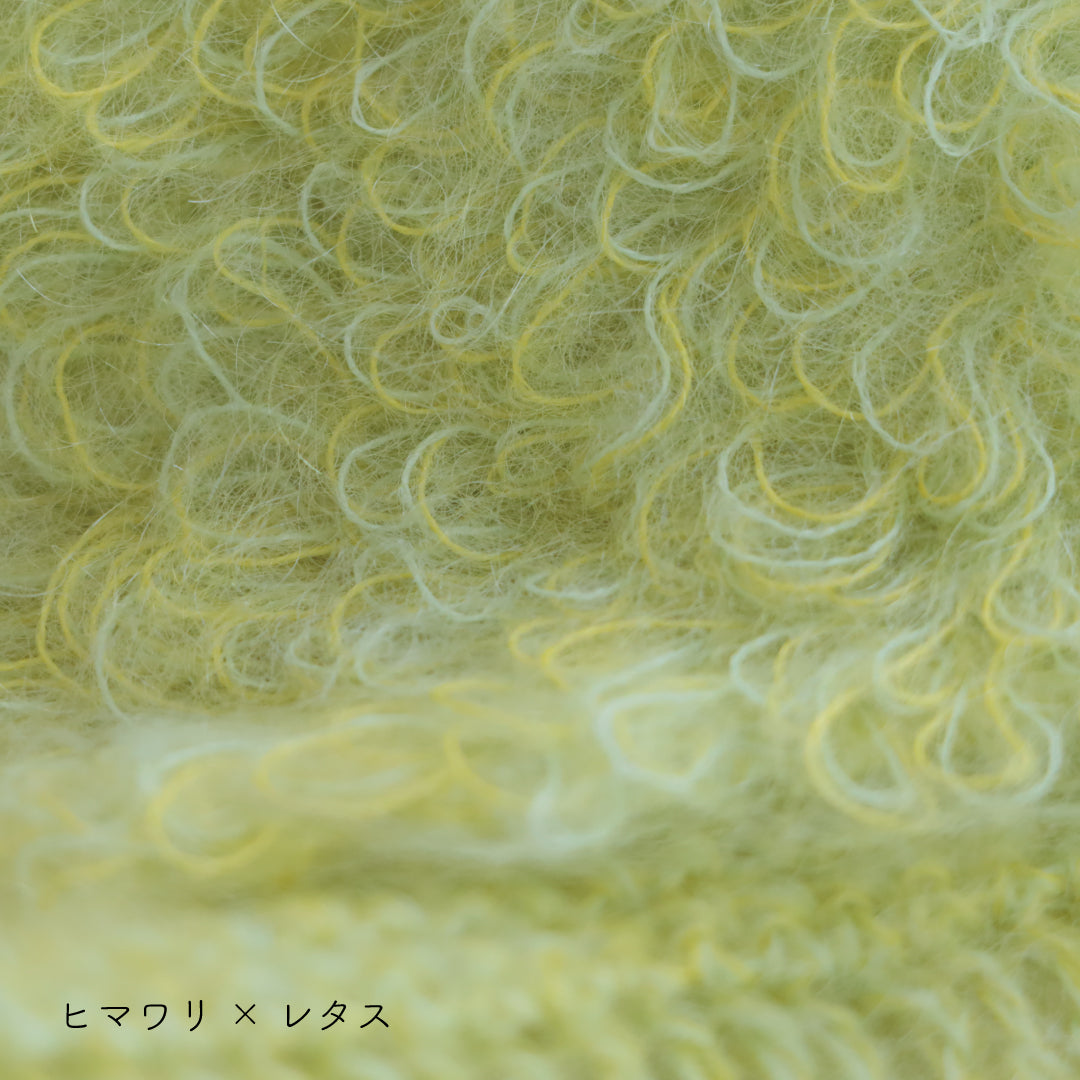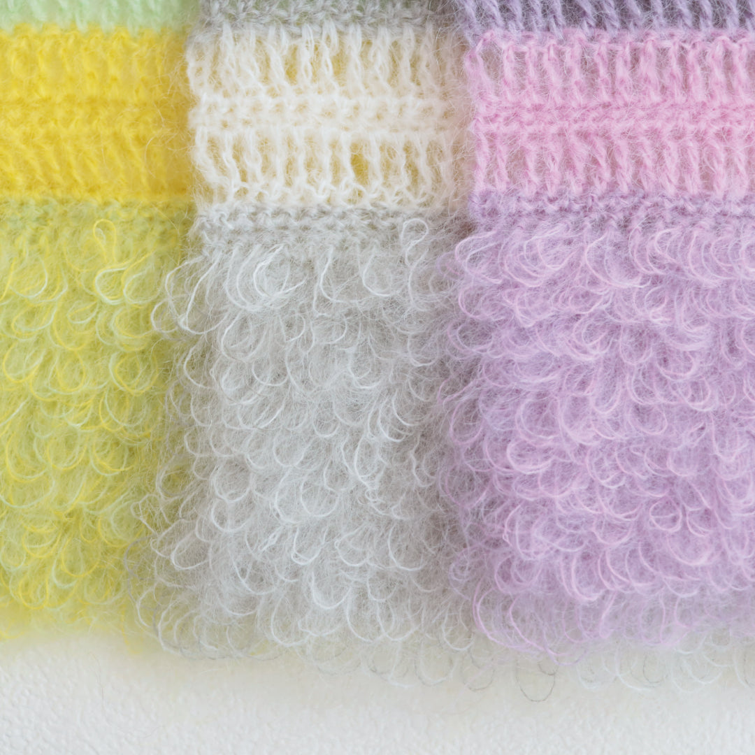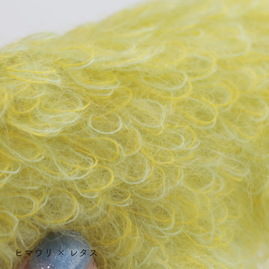 糸を起毛することでモヘヤの毛足を出し、素材本来の良さを際立たせたこの糸は手触りが滑らかで上品な光沢が特徴です。