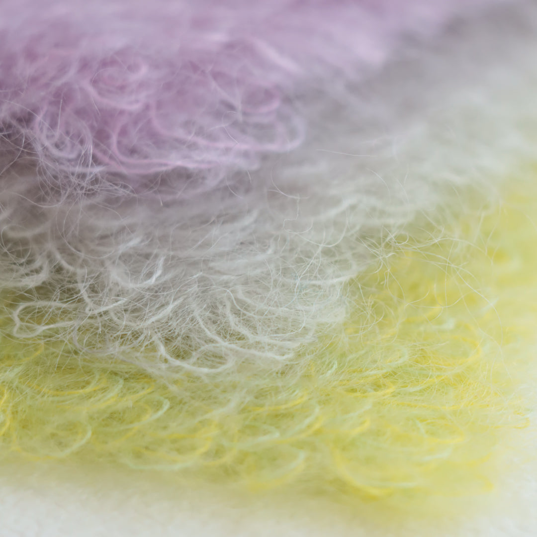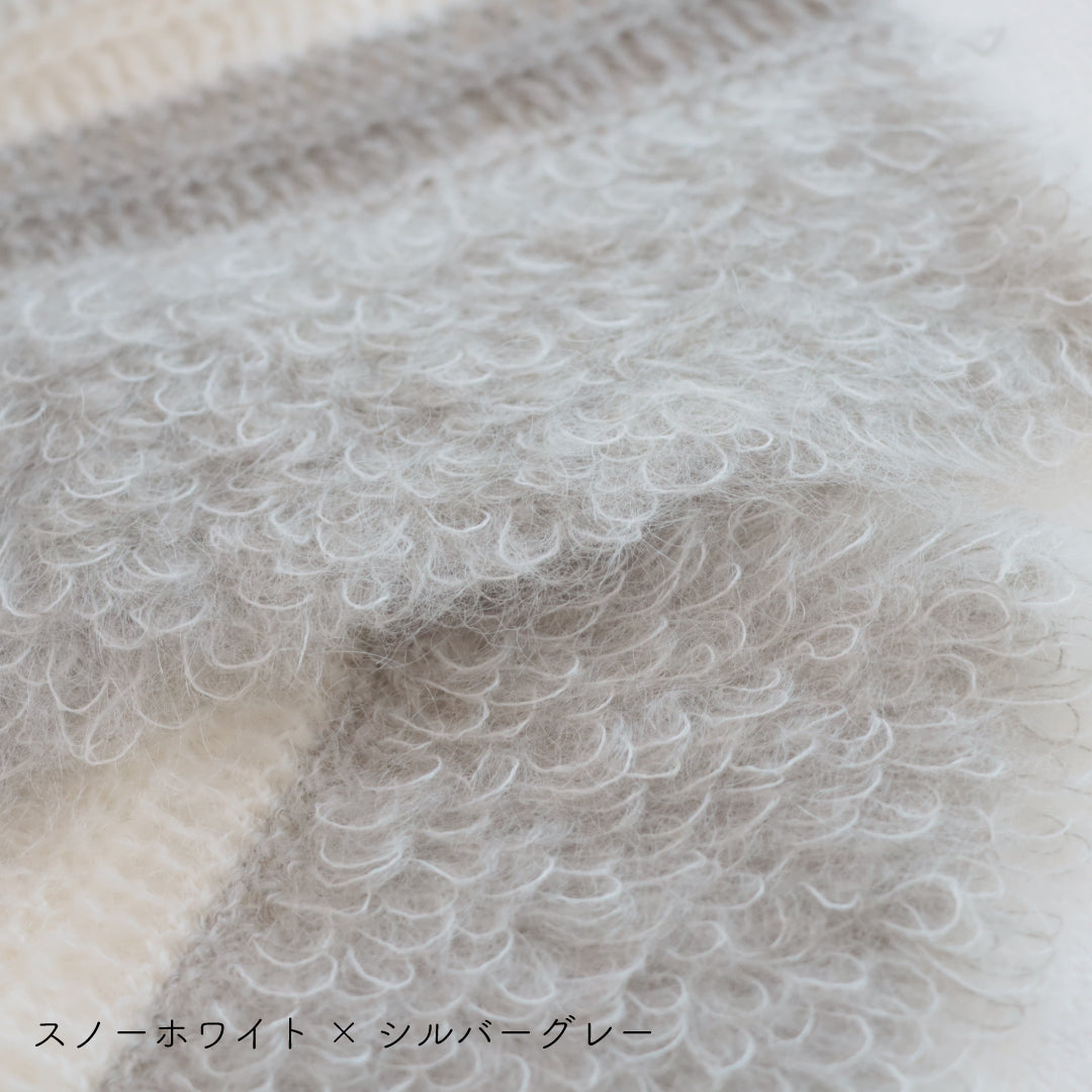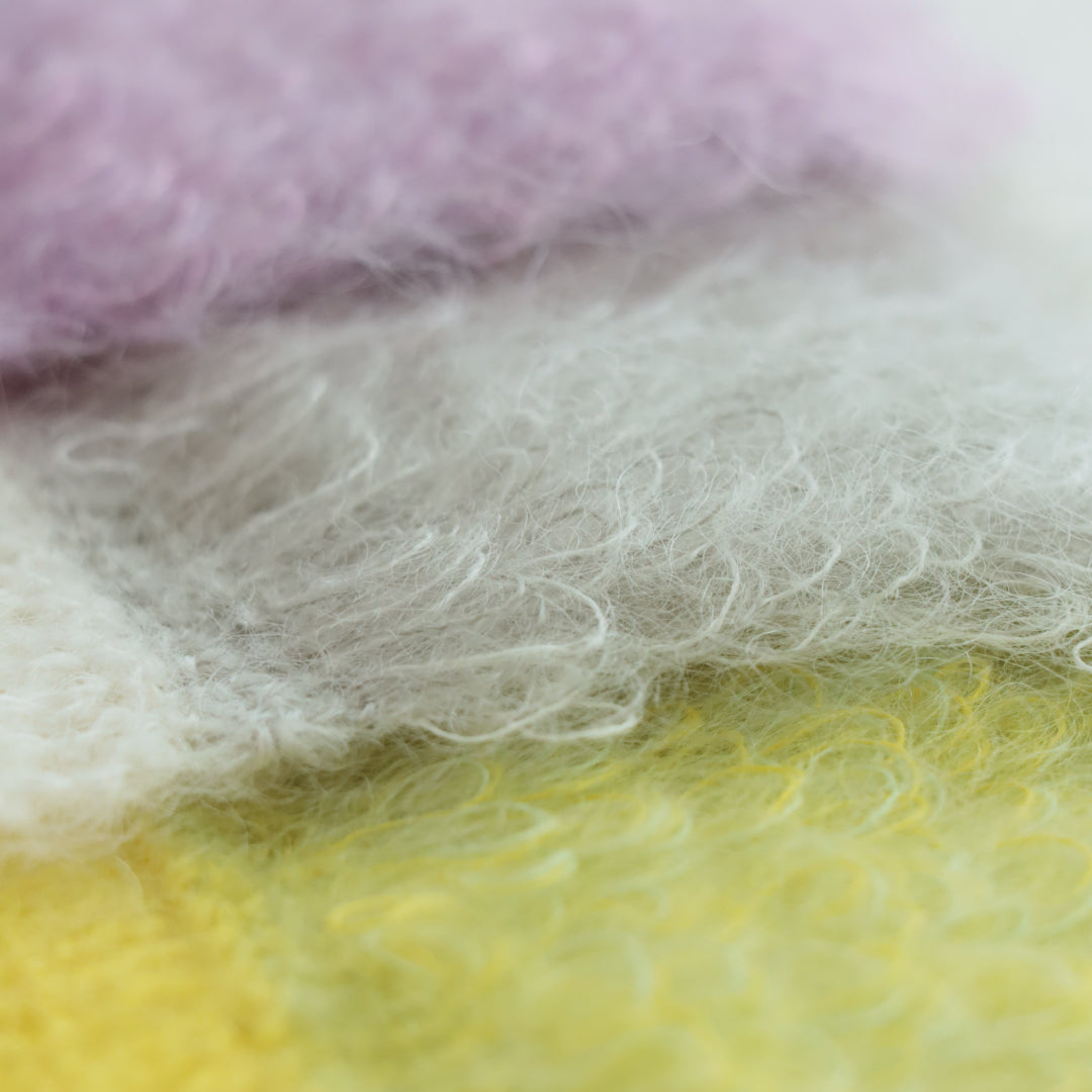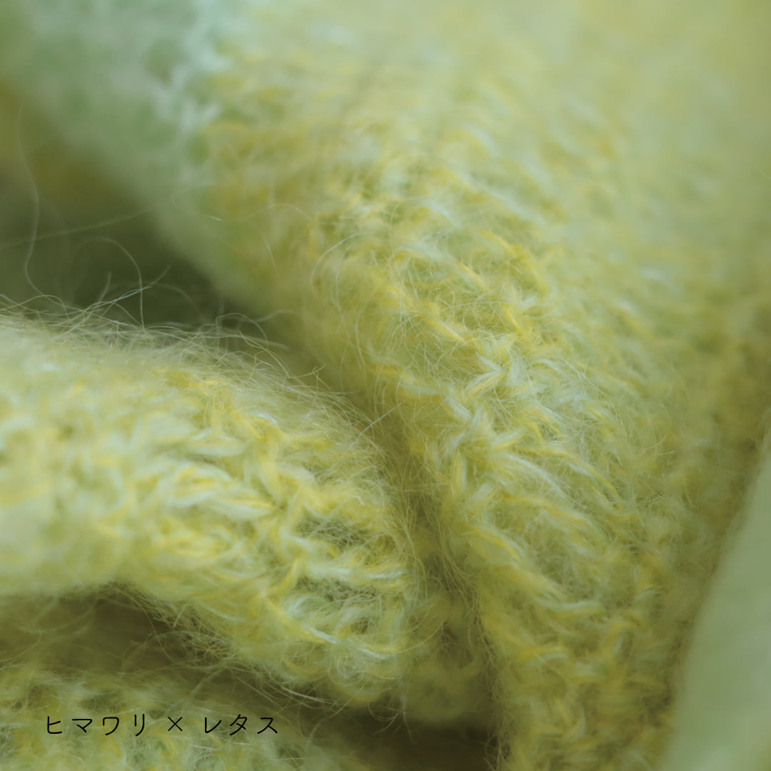 糸を起毛することでモヘヤの毛足を出し、素材本来の良さを際立たせたこの糸は手触りが滑らかで上品な光沢が特徴です。
