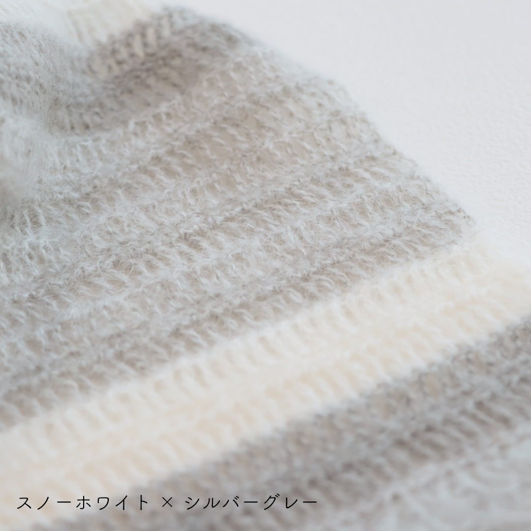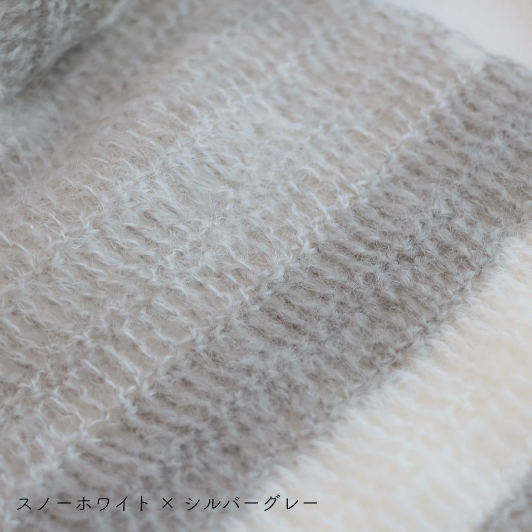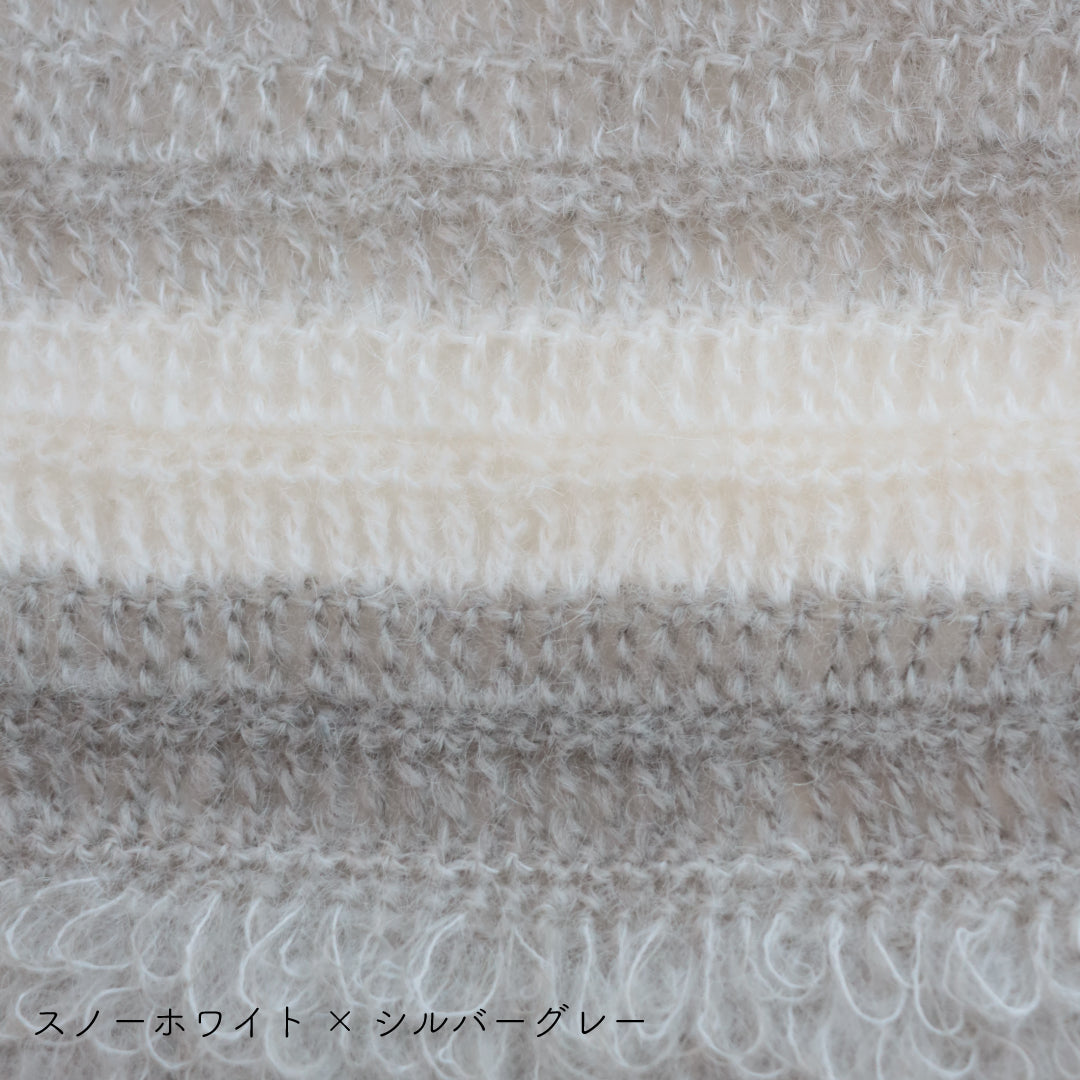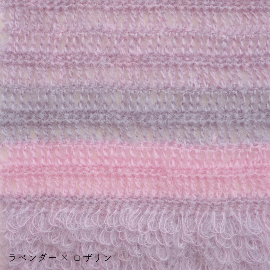 本体の編地も長々編みと細編みでボーダーを表現したデザインがポイントです。マフラーの両端にはボリュームのあるリング編みでより糸のふんわり感をお楽しみいただけます。