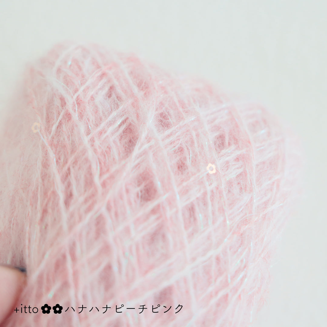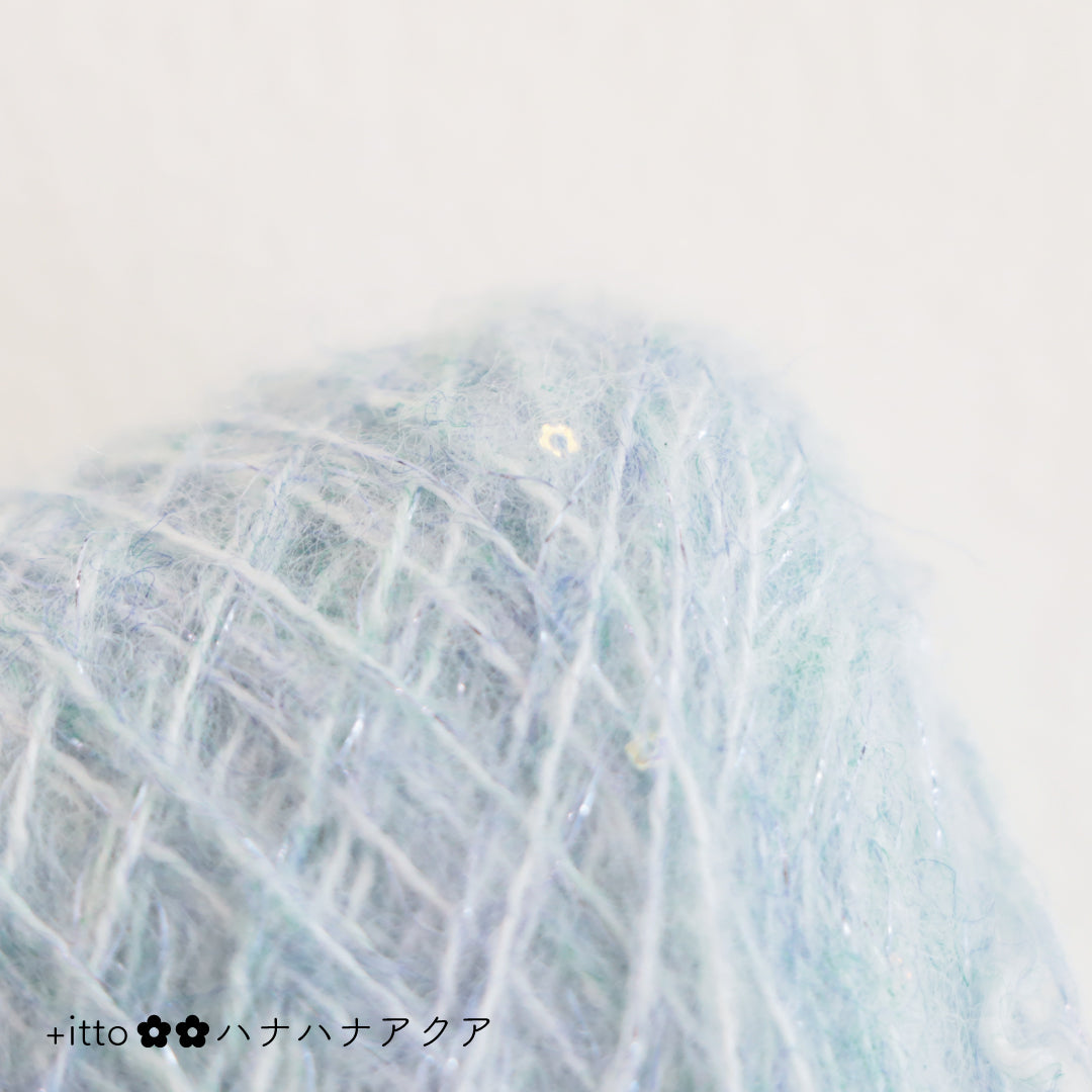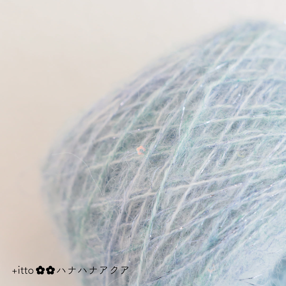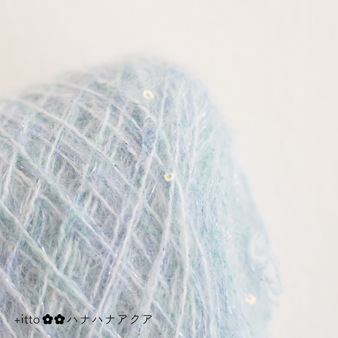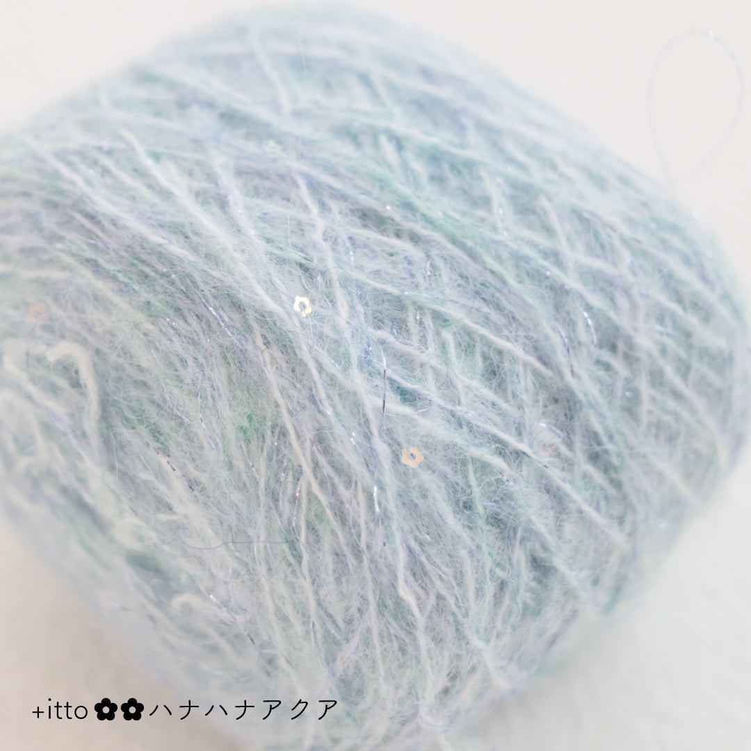 絵画のような淡く繊細なグラデーションとラメの糸が撚糸された糸に、点々と小さなお花のスパンコールが輝く「+ittoハナハナ」