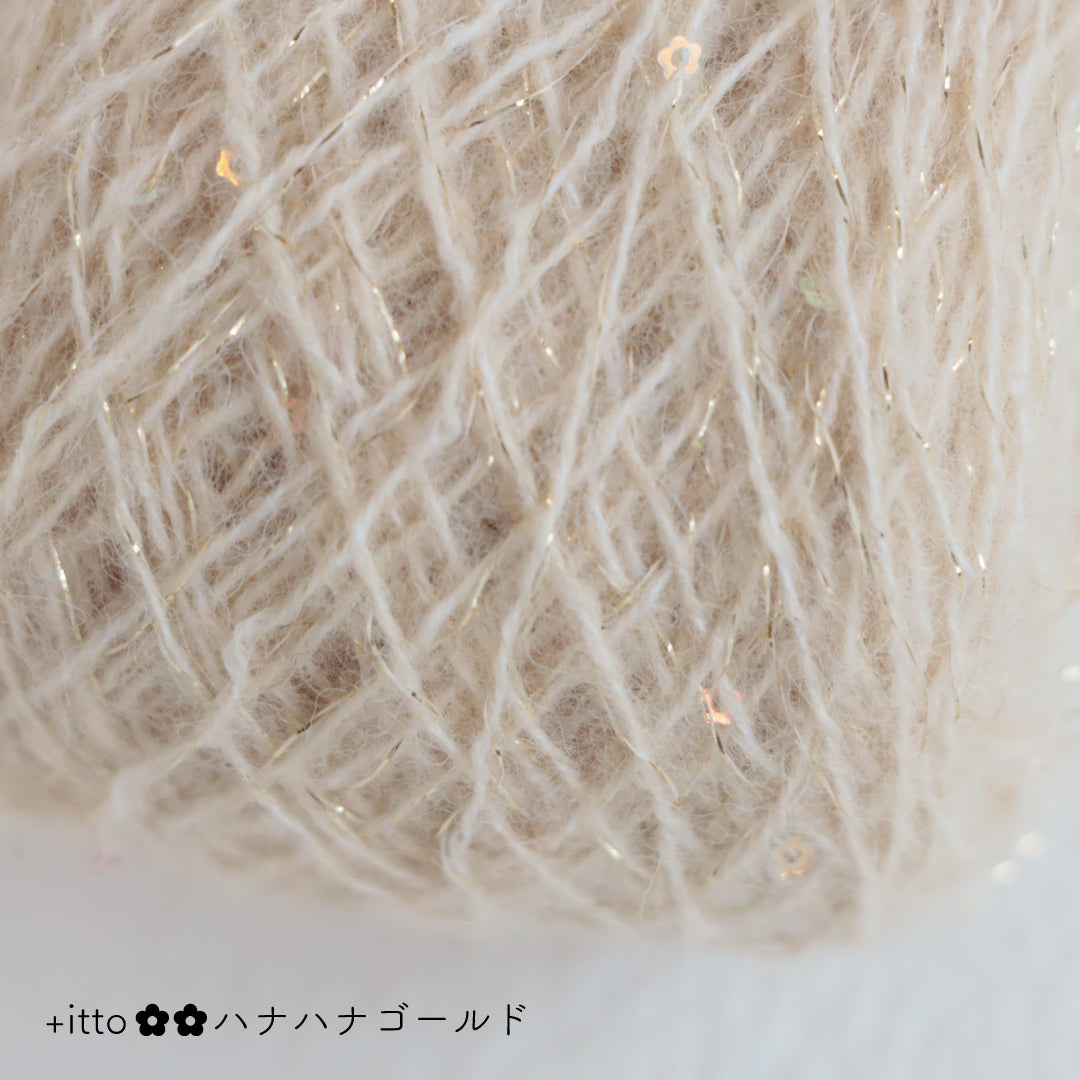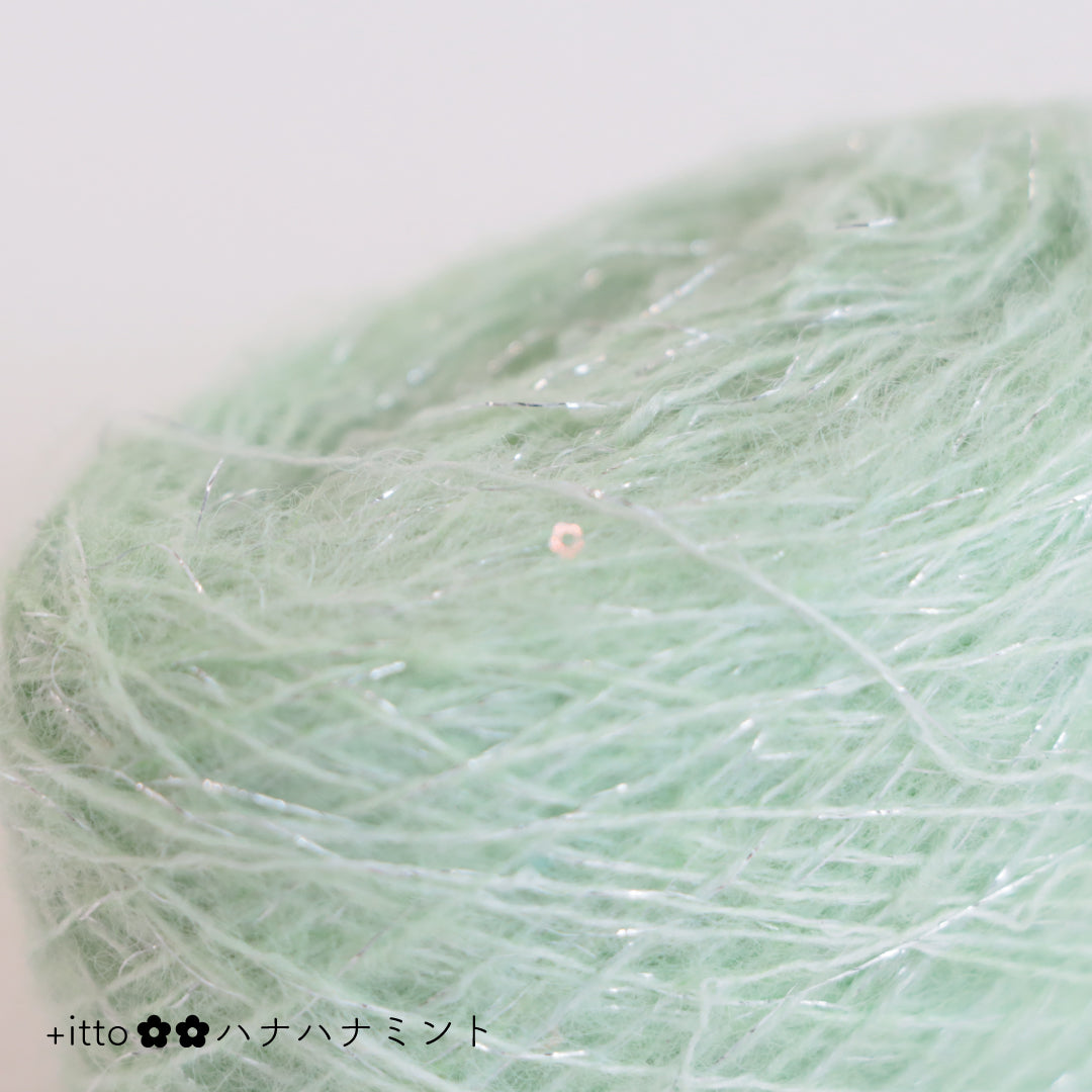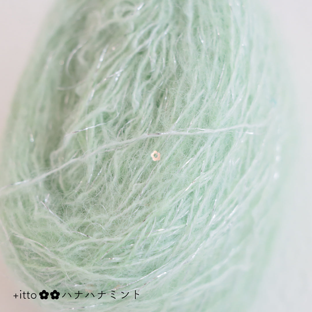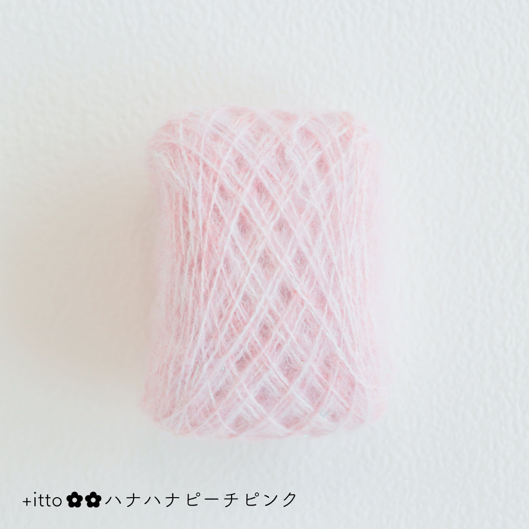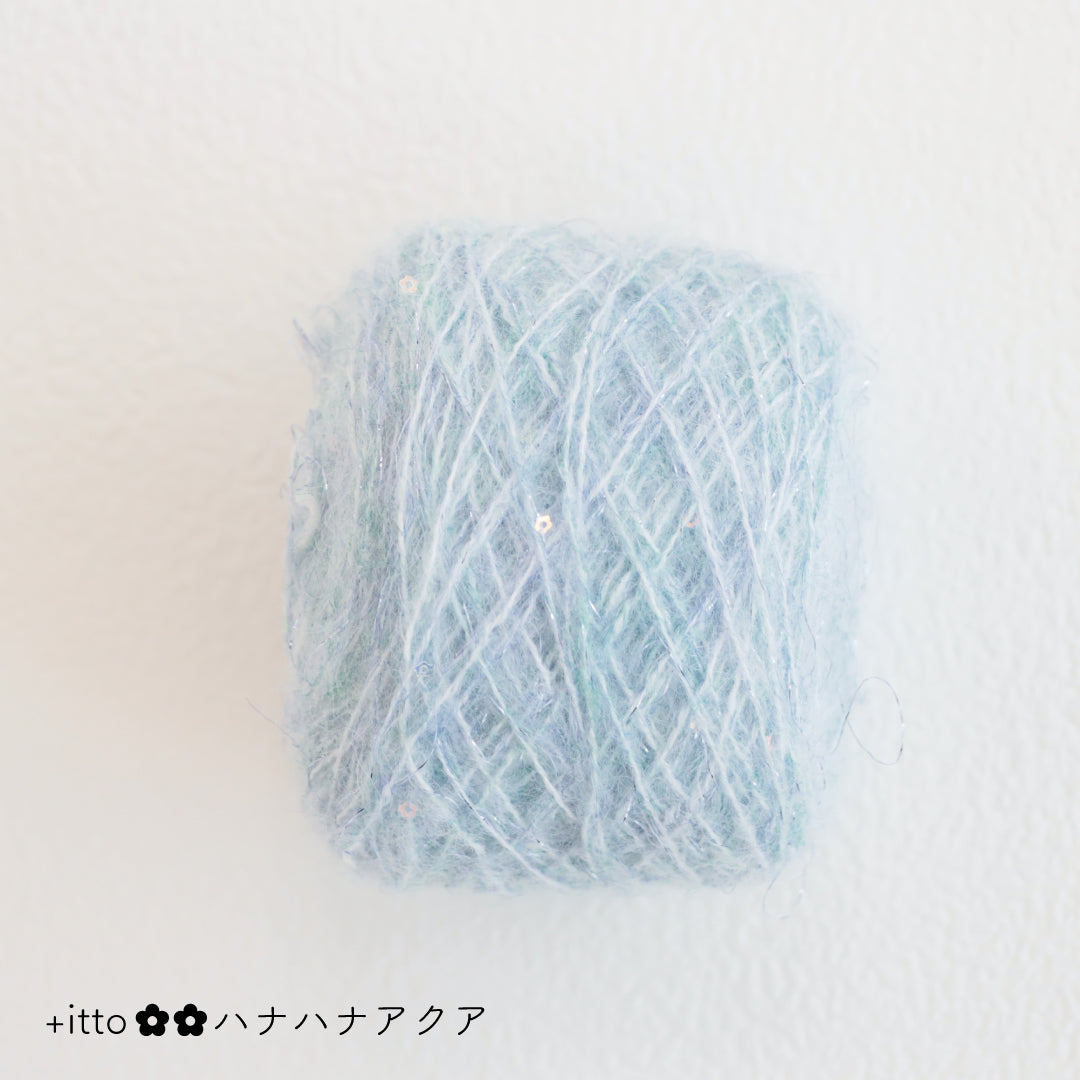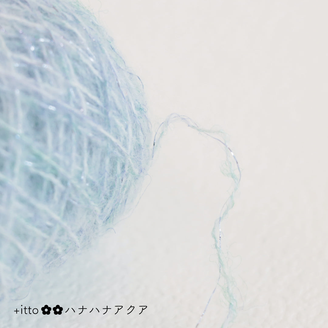 絵画のような淡く繊細なグラデーションとラメの糸が撚糸された糸に、点々と小さなお花のスパンコールが輝く「+ittoハナハナ」