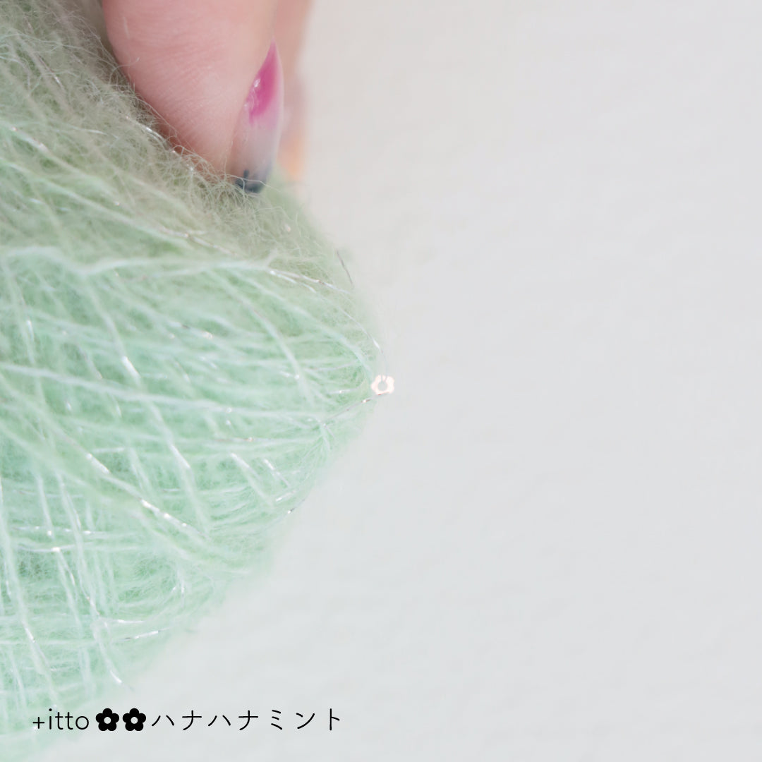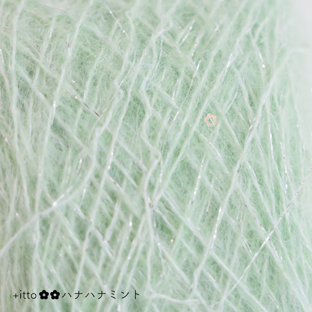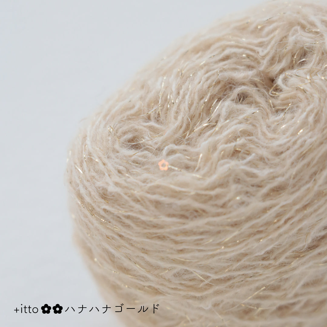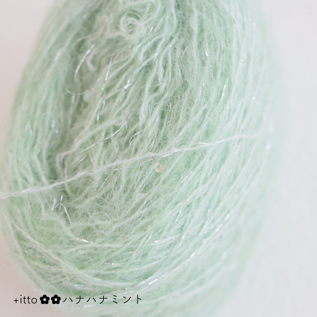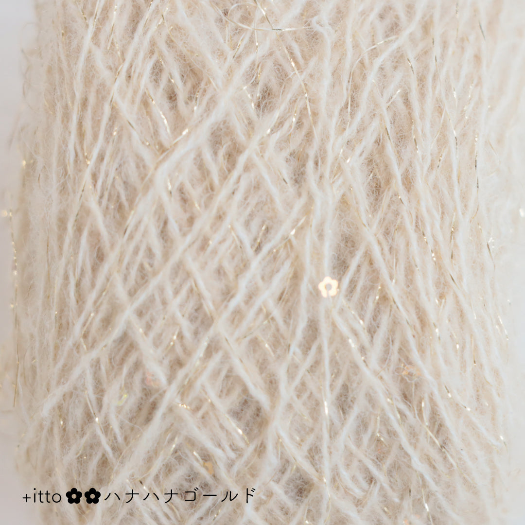絵画のような淡く繊細なグラデーションとラメの糸が撚糸された糸に、点々と小さなお花のスパンコールが輝く「+ittoハナハナ」