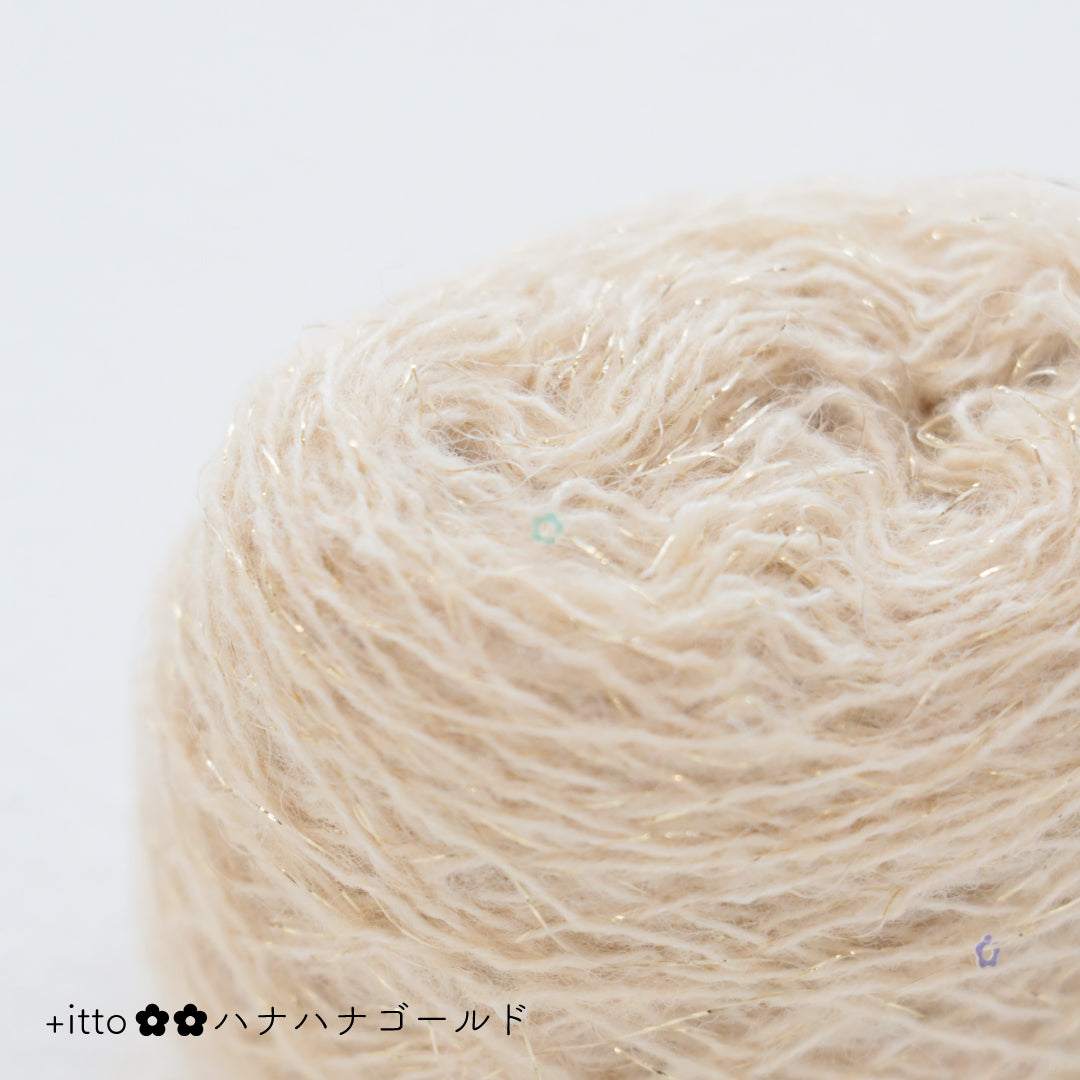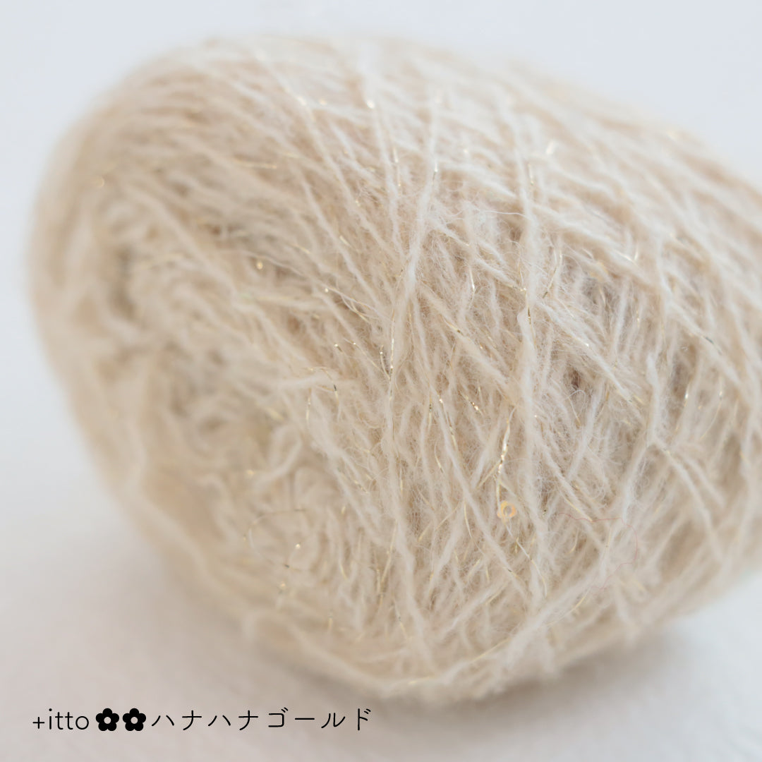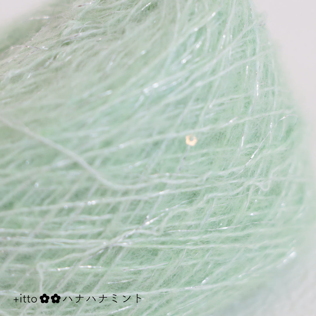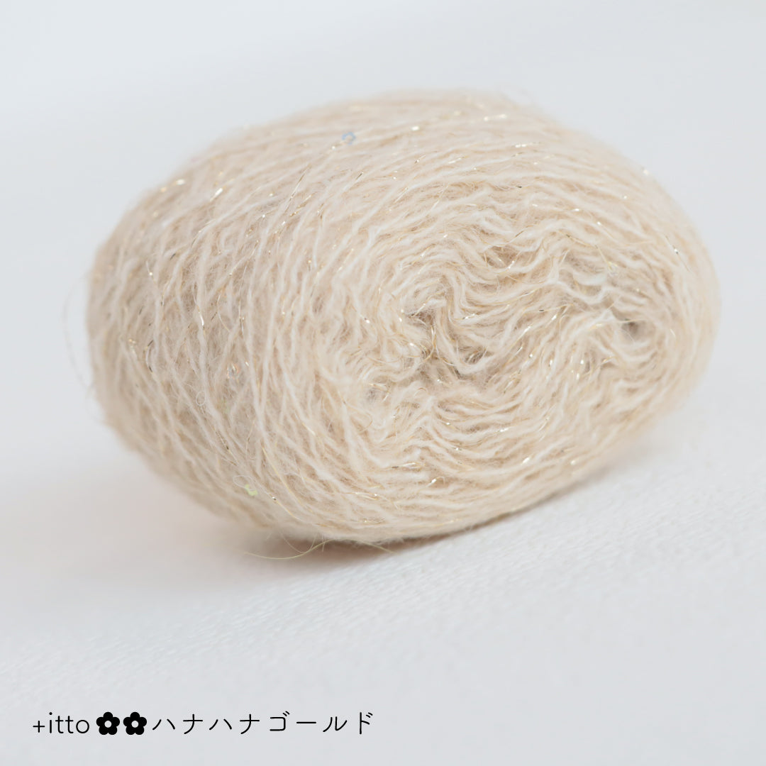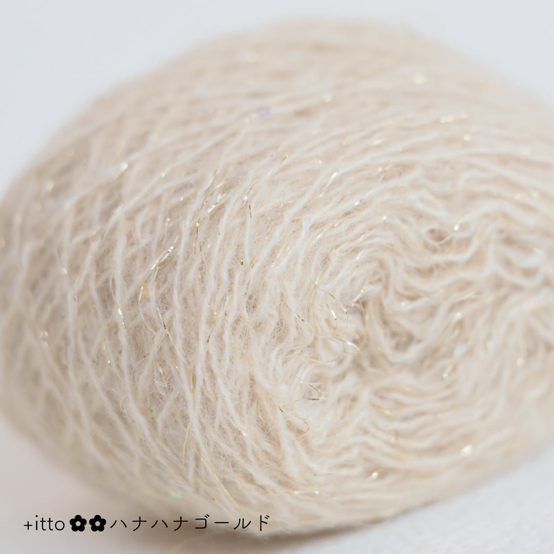 絵画のような淡く繊細なグラデーションとラメの糸が撚糸された糸に、点々と小さなお花のスパンコールが輝く「+ittoハナハナ」