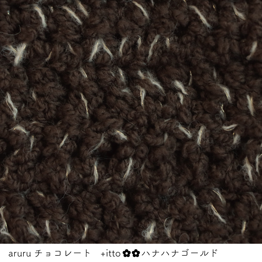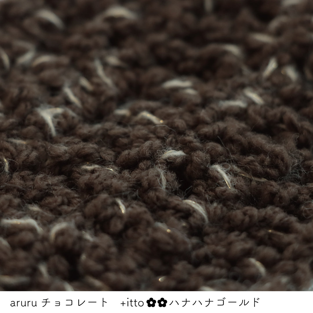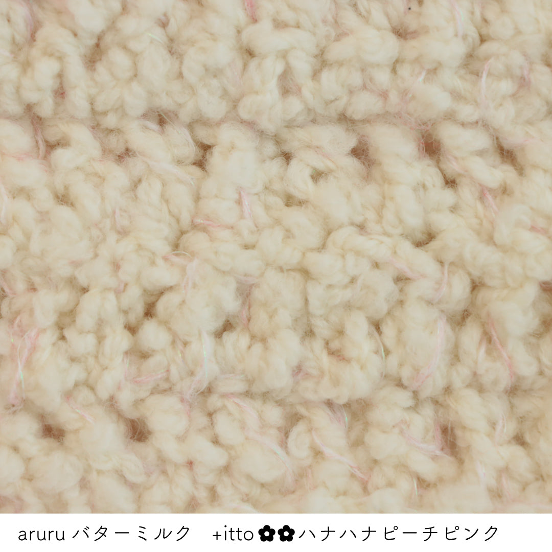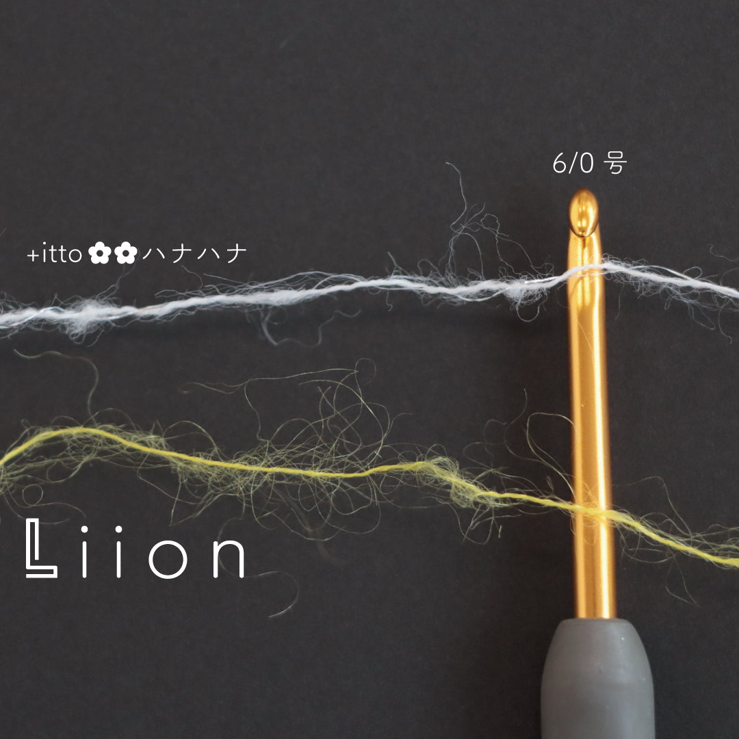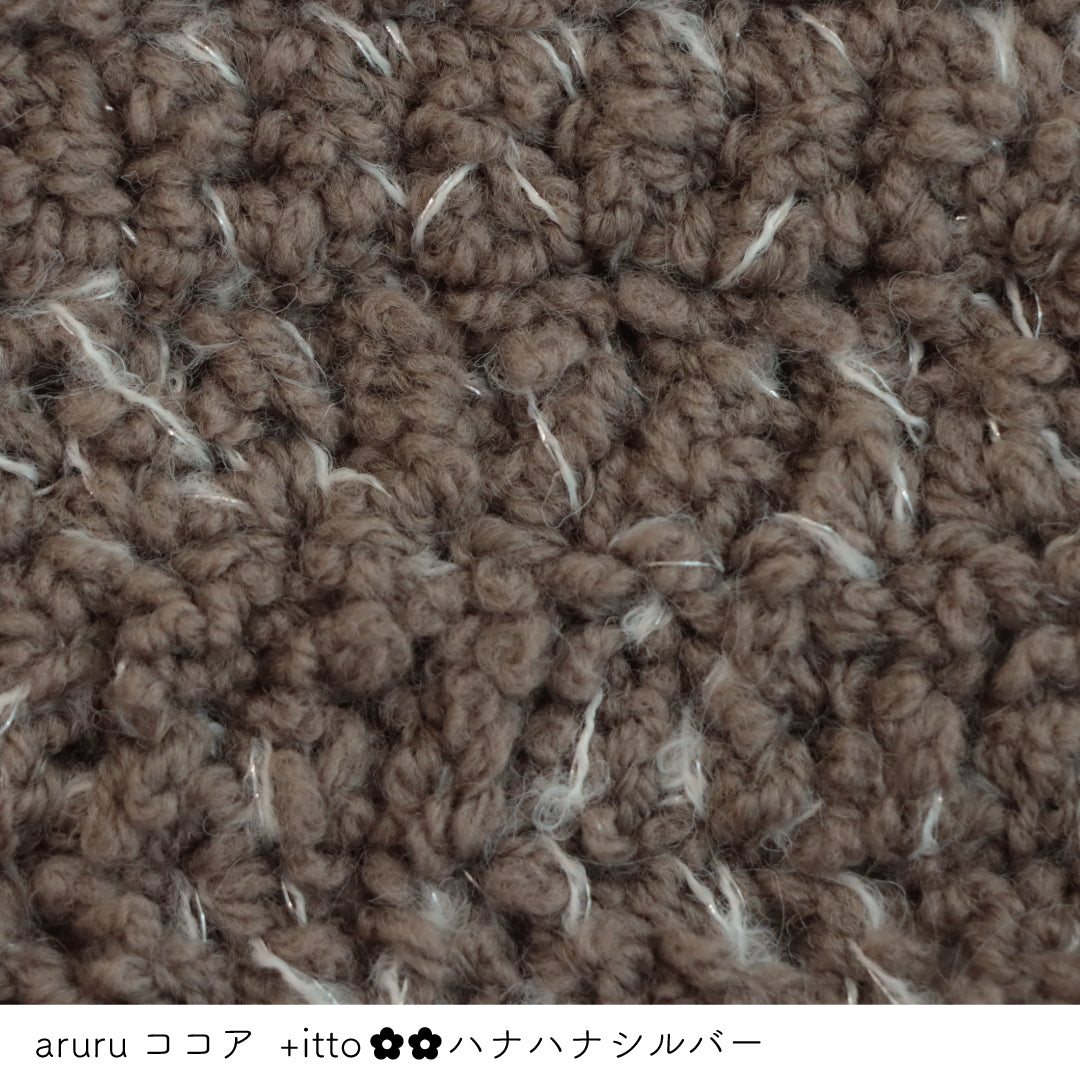 糸を起毛加工した少し毛羽立ちのあるストレート糸なので引き揃えて編む糸とくっついて馴染みやすくバラバラになりがちな引き揃えでも比較的編みやすくなっています。