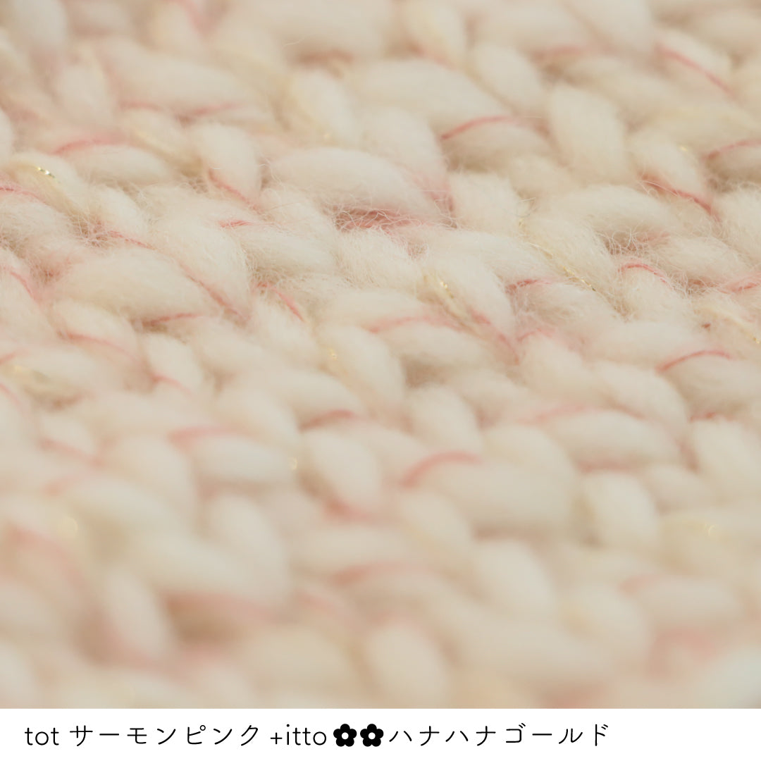 一緒に撚糸されているラメ糸はピーチピンクがオーロララメ、アクア/ミント/シルバーがシルバーラメ、ゴールドはゴールドラメと色に合わせたカラーが使われており上品に輝きます。