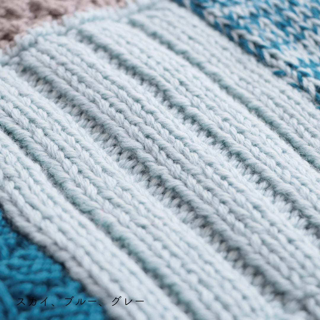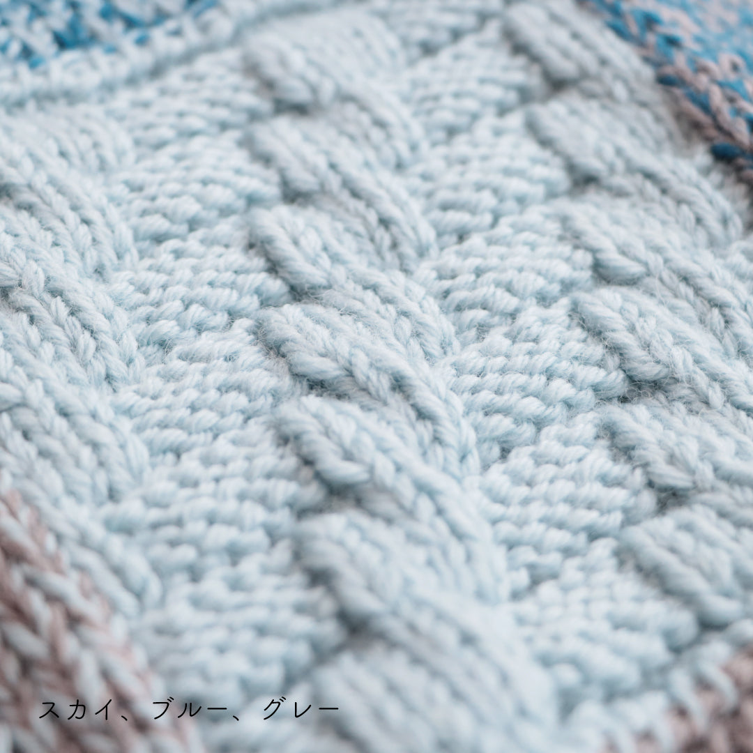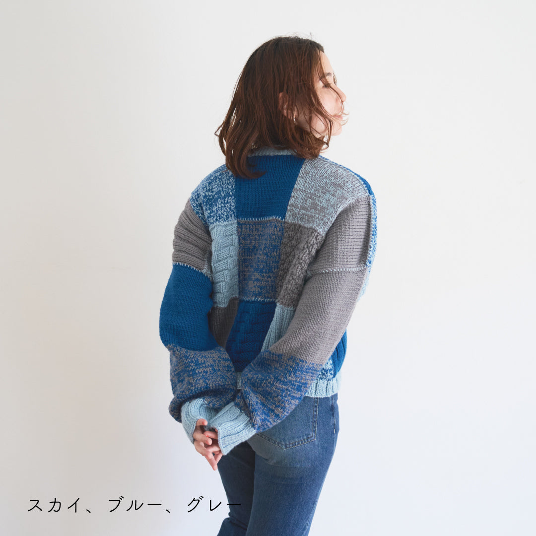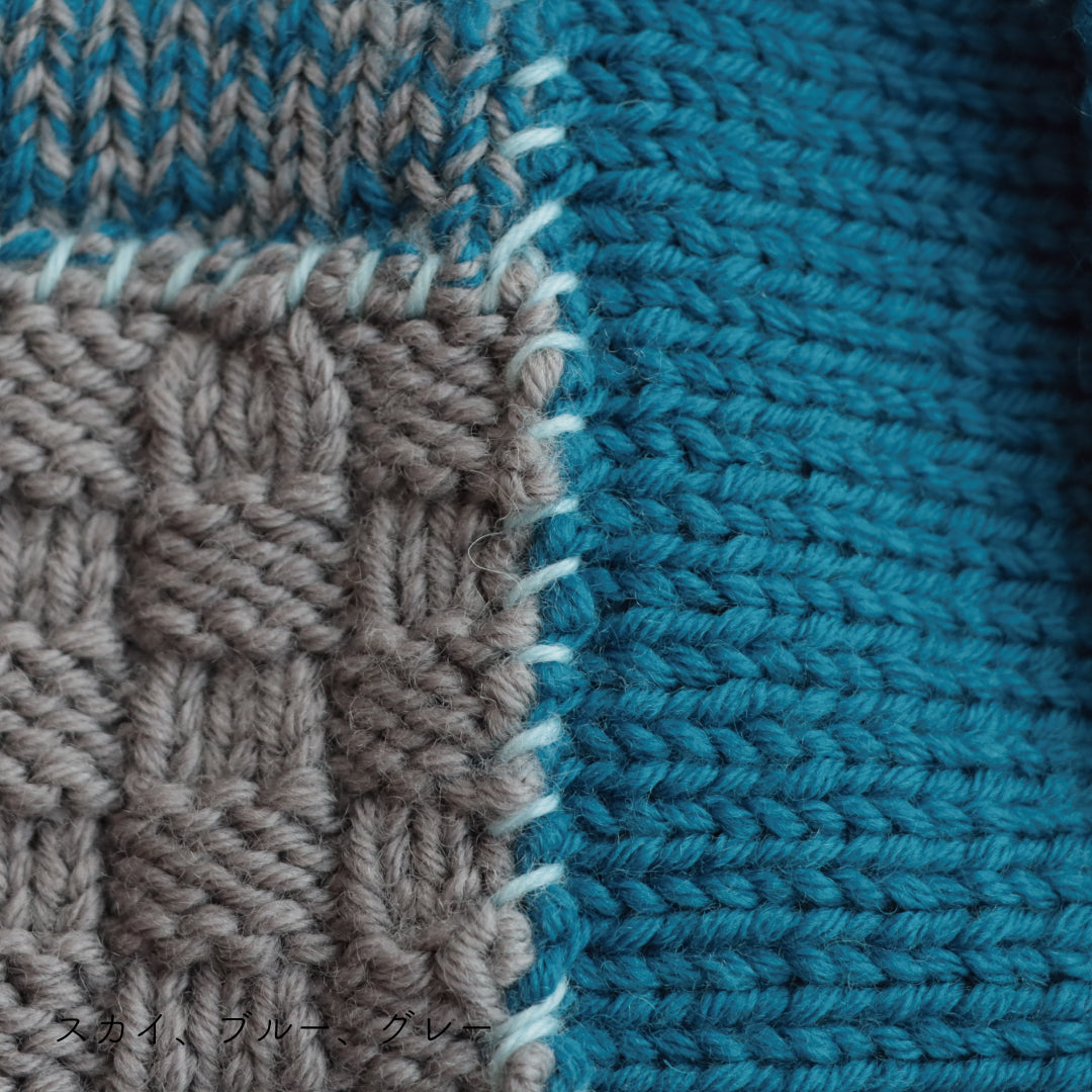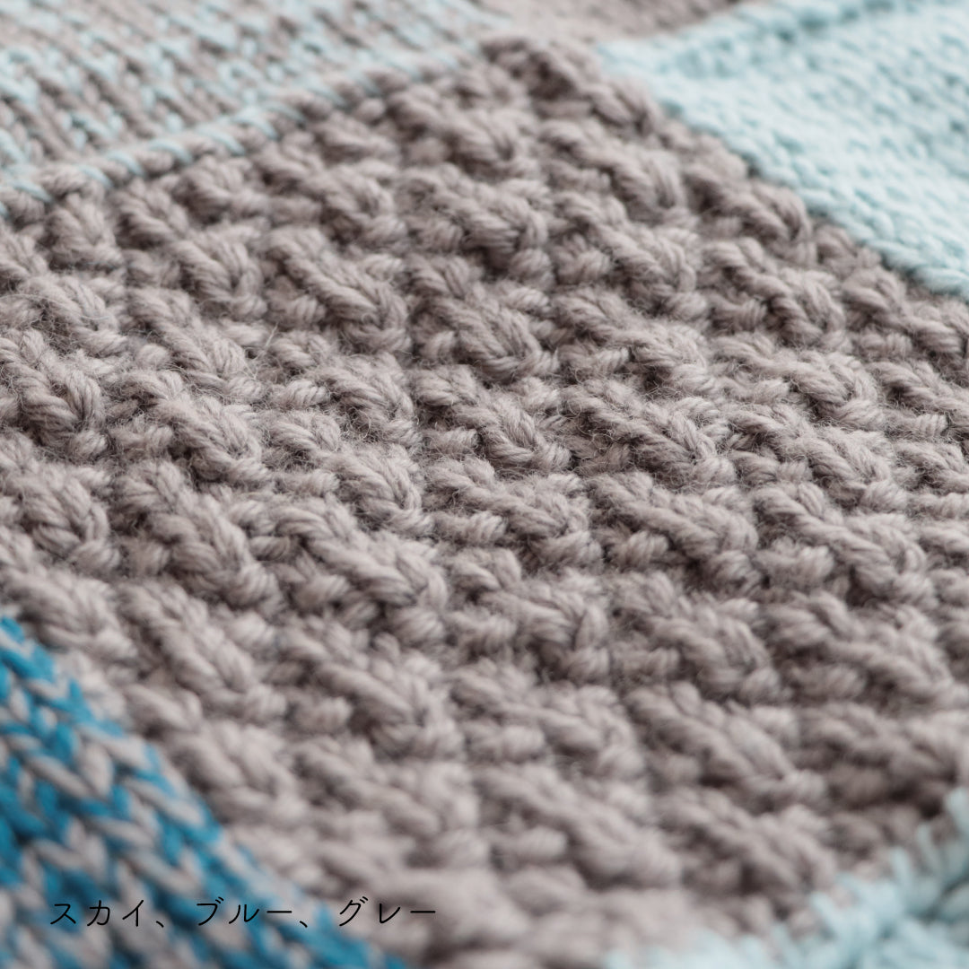 身頃は表編みと裏編みで凹凸のある編地や配色の引き揃えなど、27枚の編み地を一枚ずつ丁寧につなげて形を作っていく過程は、パズルのようにお楽しみいただけすはず。