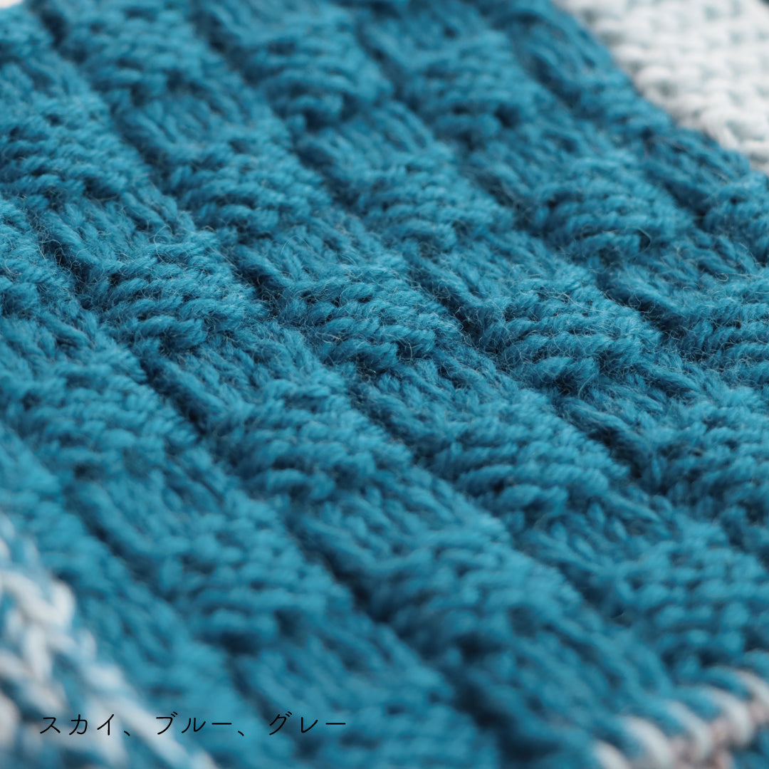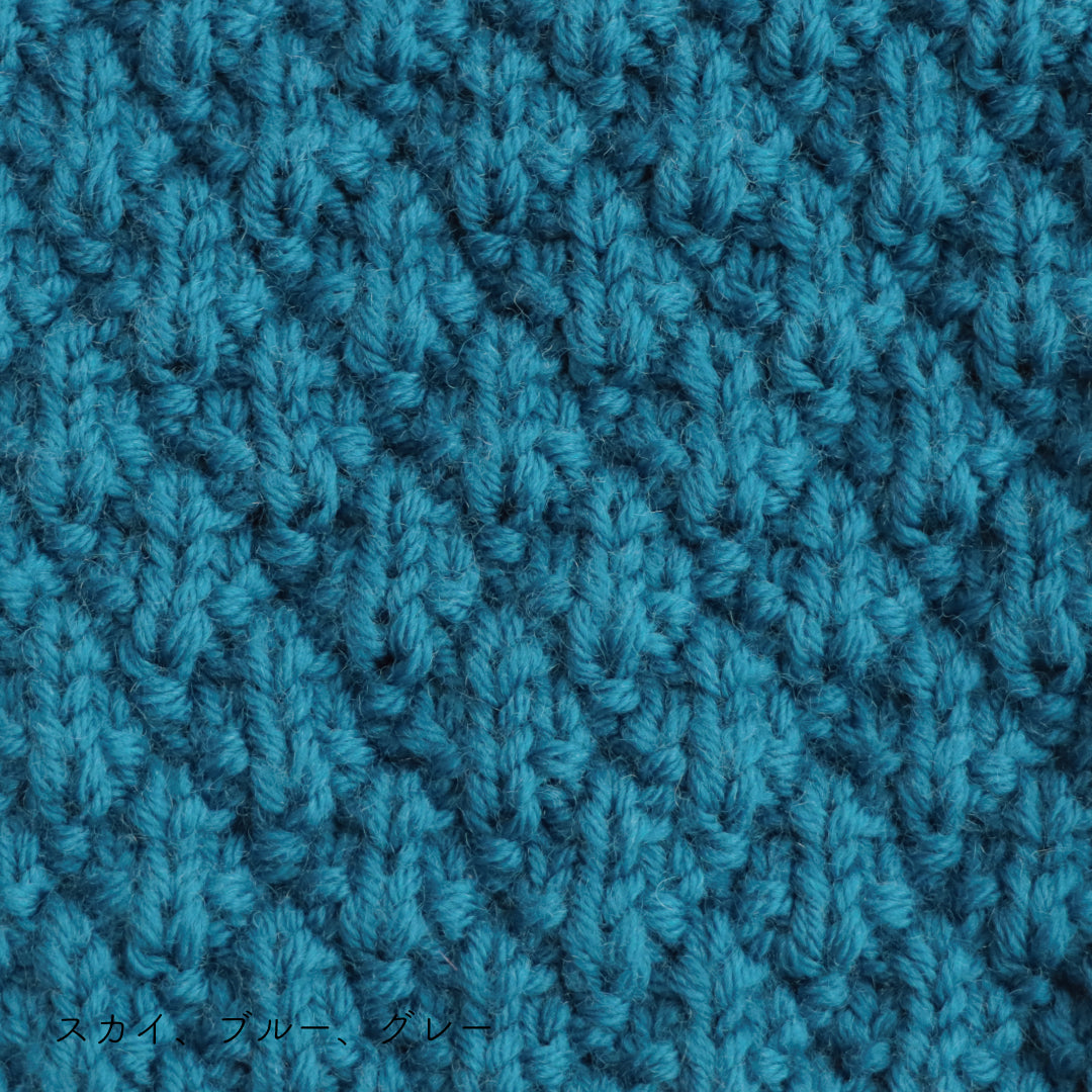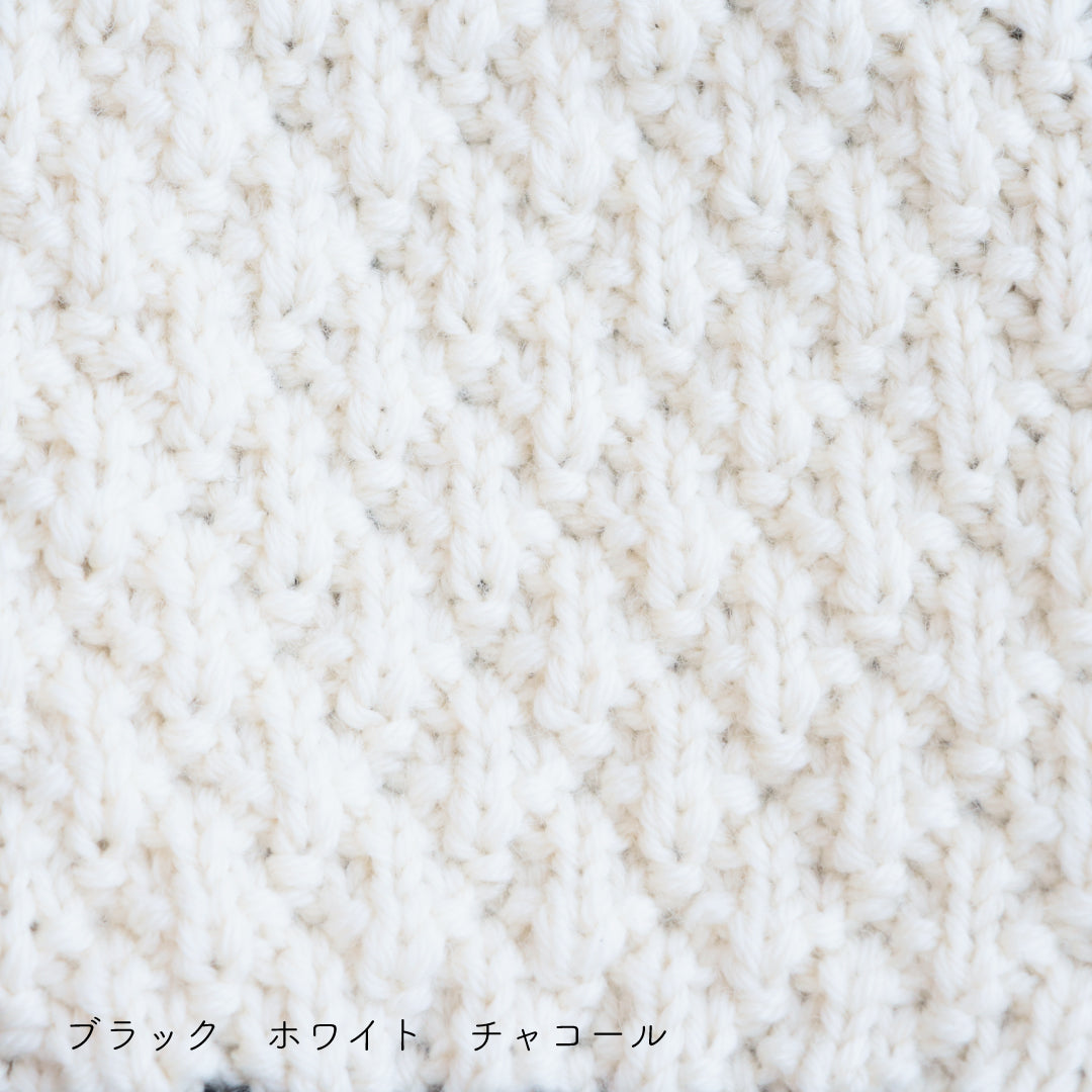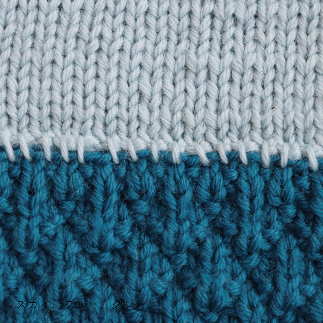 身頃は表編みと裏編みで凹凸のある編地や配色の引き揃えなど、27枚の編み地を一枚ずつ丁寧につなげて形を作っていく過程は、パズルのようにお楽しみいただけすはず。