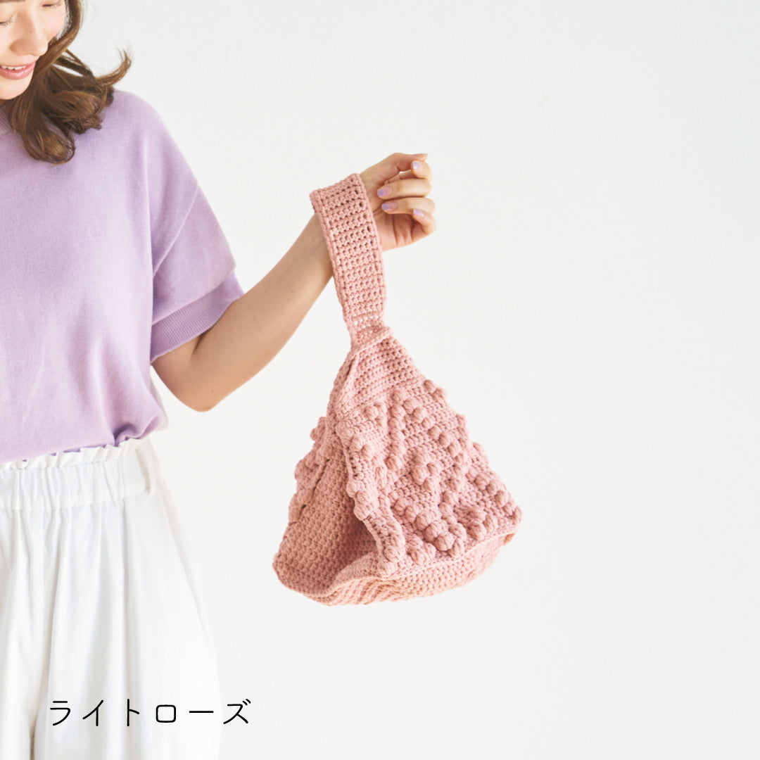どこかにおでかけしたくなるようなワンハンドルバッグ。バッグ口が大きく、底が四角なのでお弁当がすっぽり入れることができるデザインがポイントです。底から立ち上げて側面を編み、立体的に編み進めるバッグです。玉編みを規則的に配置することでダイヤ柄の模様が浮かび上がってきます。