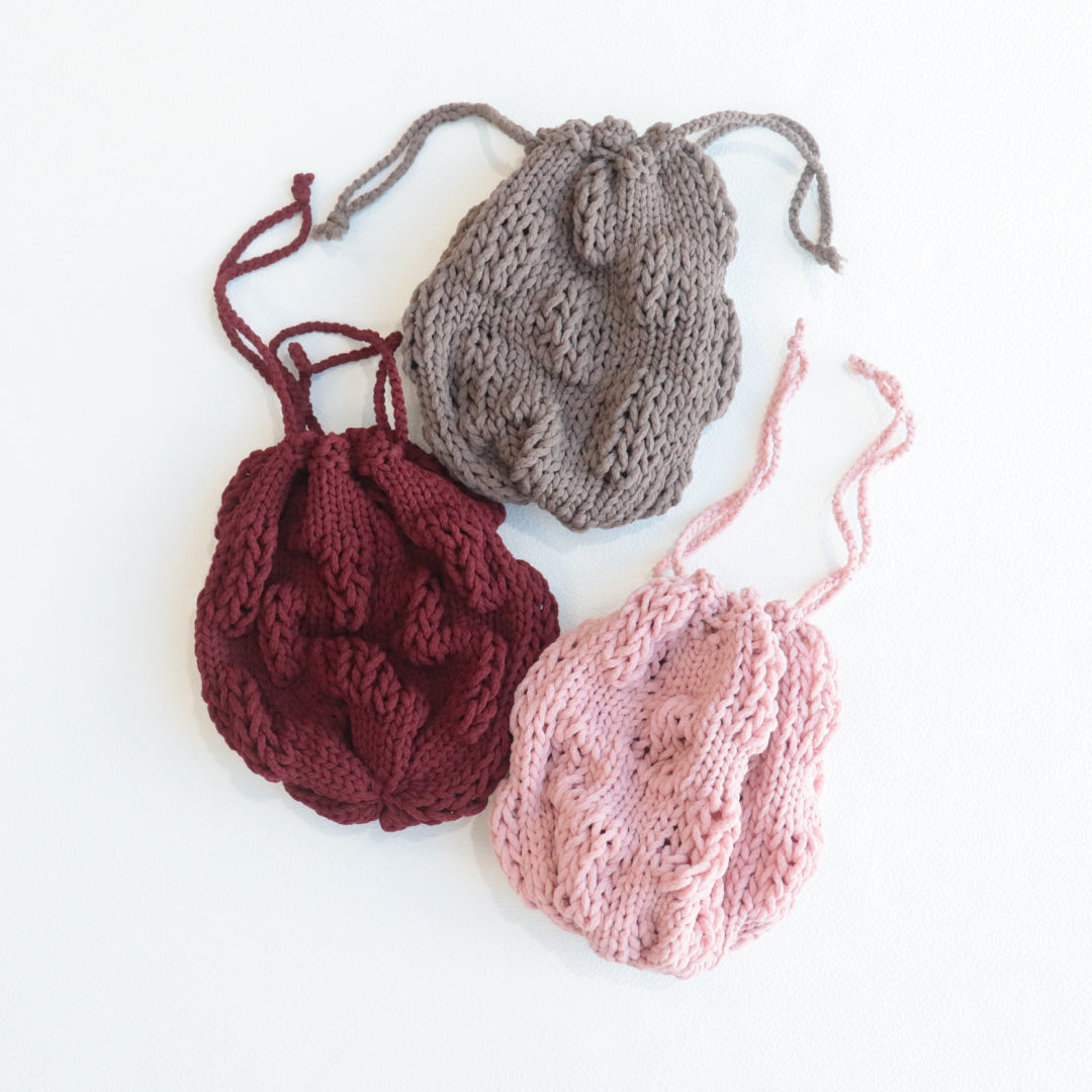 表目、裏目に慣れてきた方へステップアップができる不思議な編地のキットです。棒針の作品に慣れてきた方はぜひ輪針にも挑戦してみてください。かぎ針は巾着の紐部分に使用し、本体は輪針でぐるぐる編みます。輪針に慣れていない方は難しいかもしれません。よく伸びる素材なので、見た目より大容量です