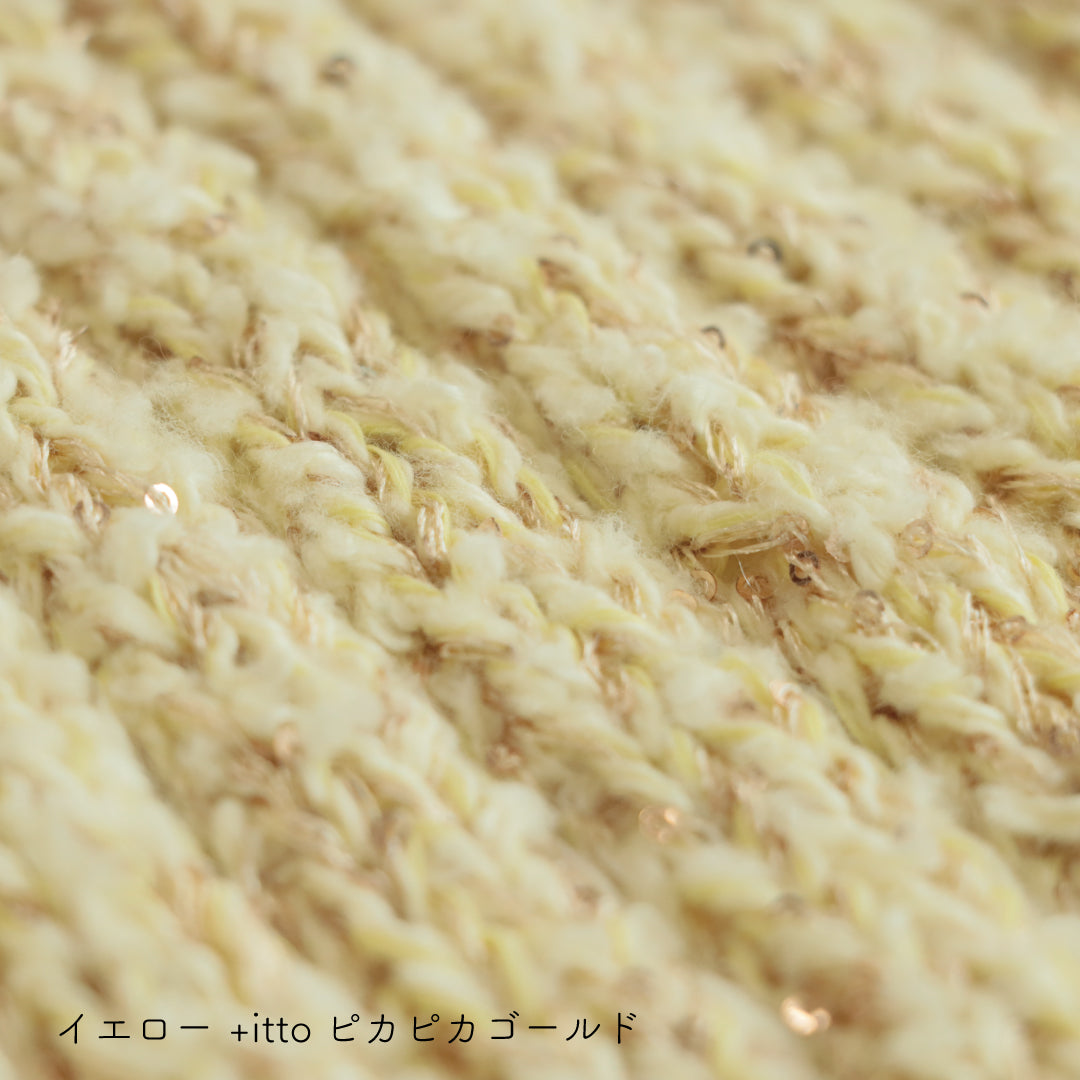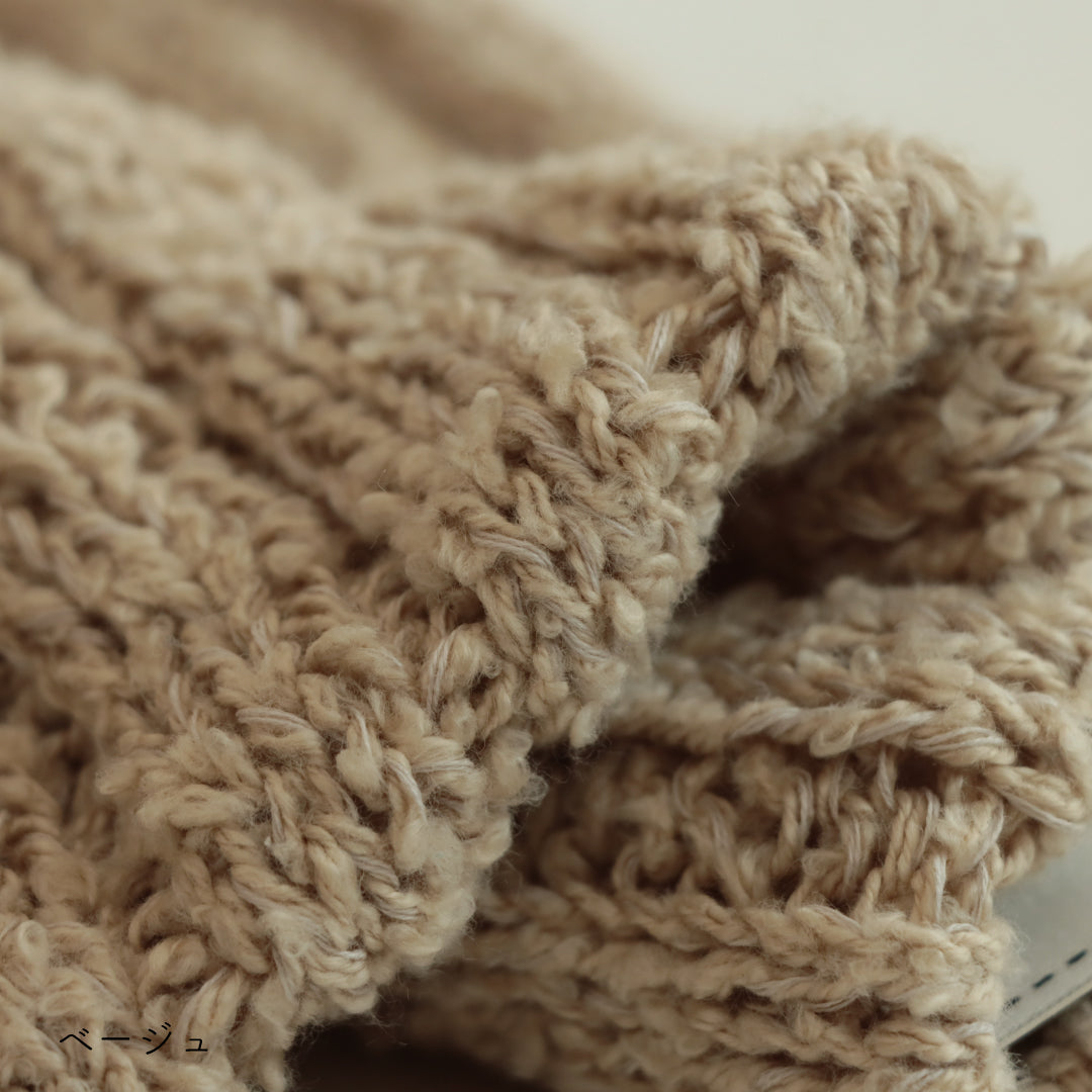 ふわふわのブークレ糸に麻に似せたしっかりと張りのあるコットン糸を撚糸しているため、柔らかいのにハリのある編地に仕上がります。