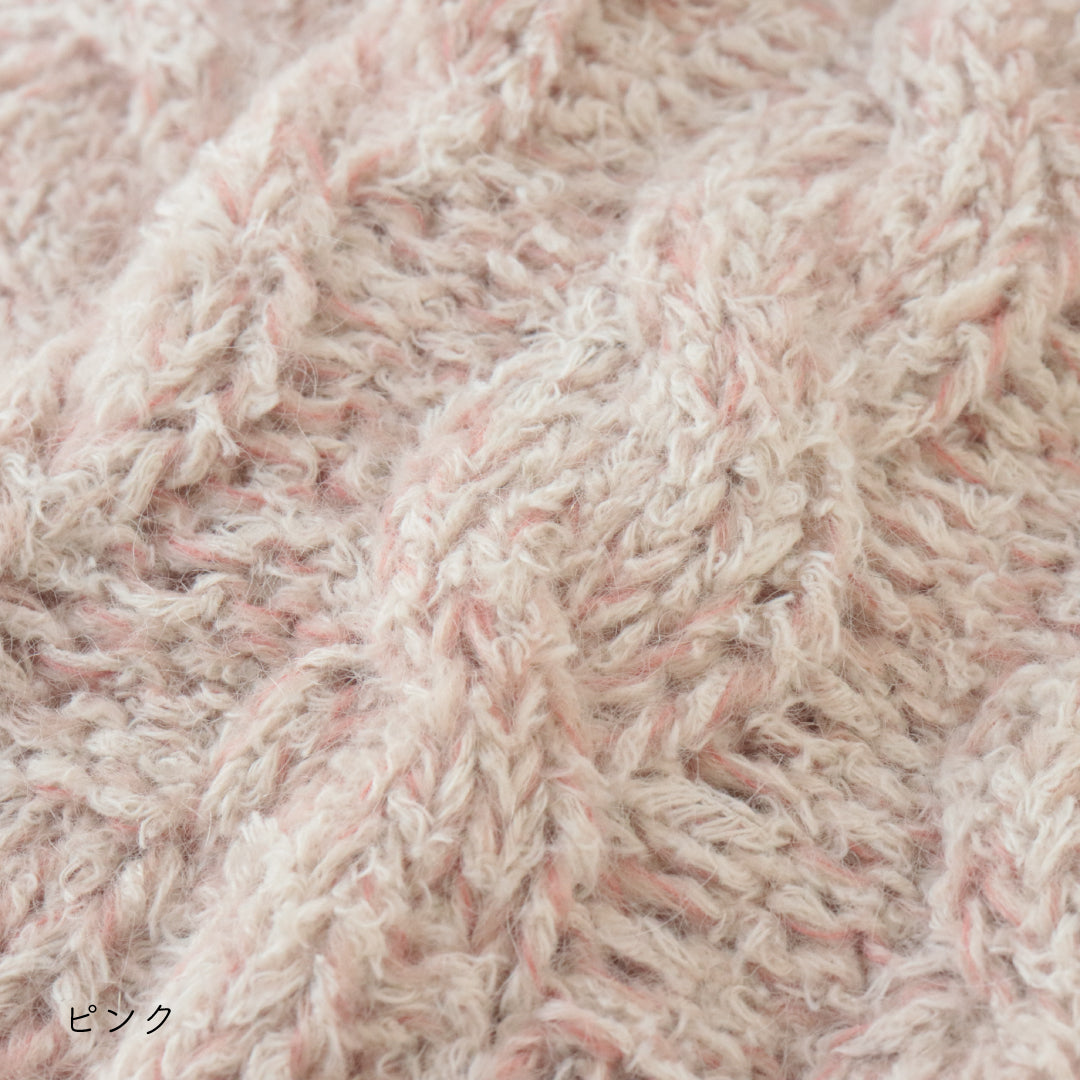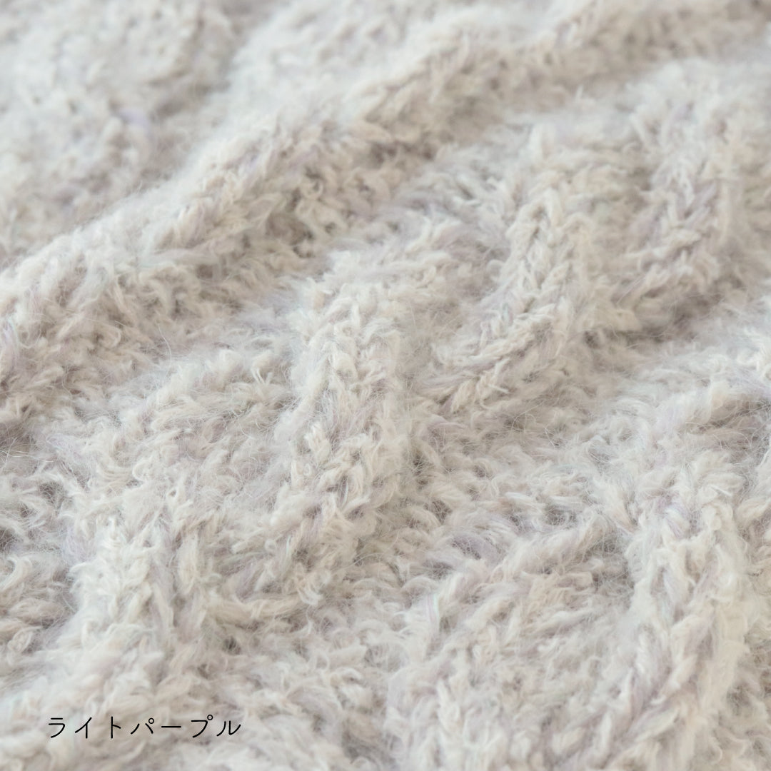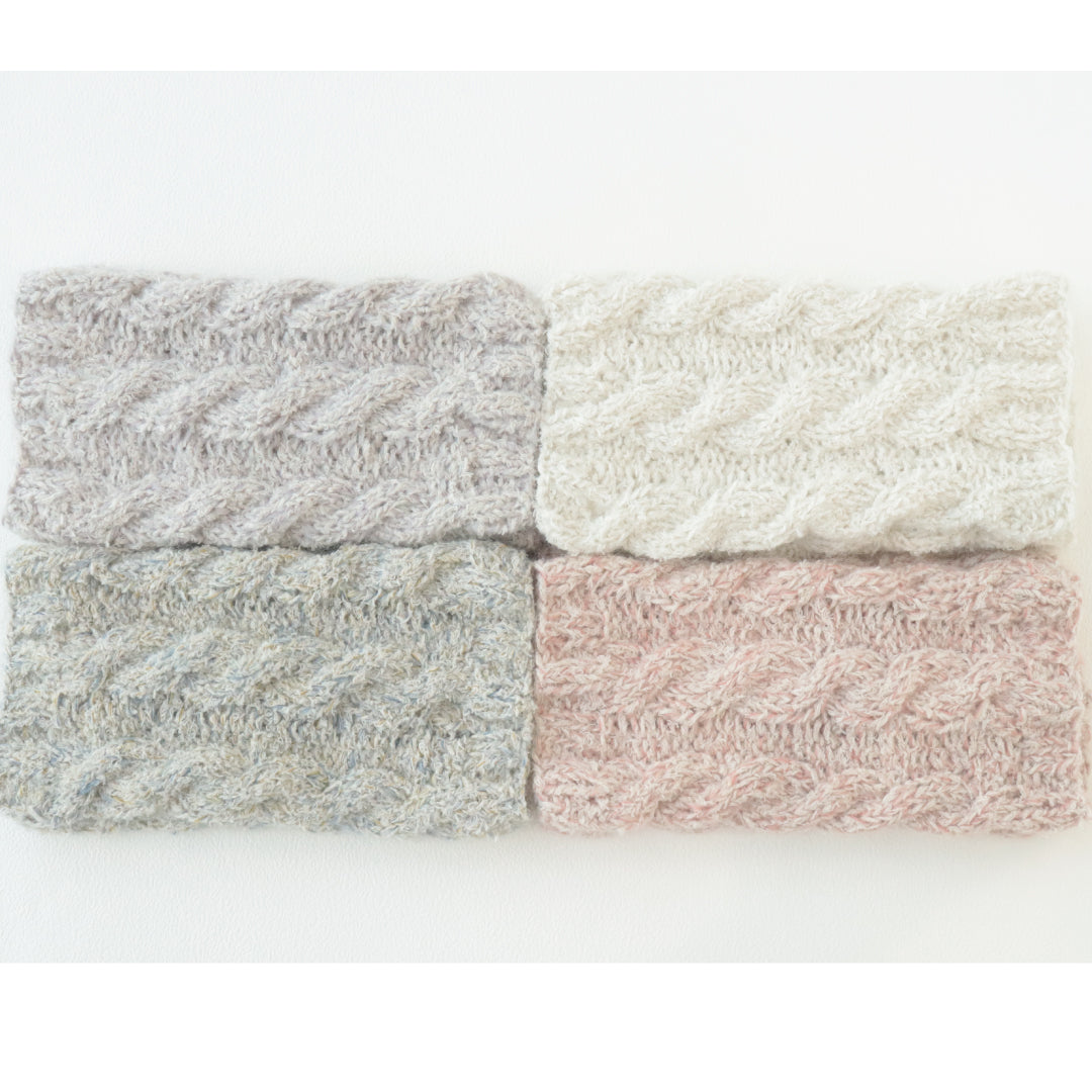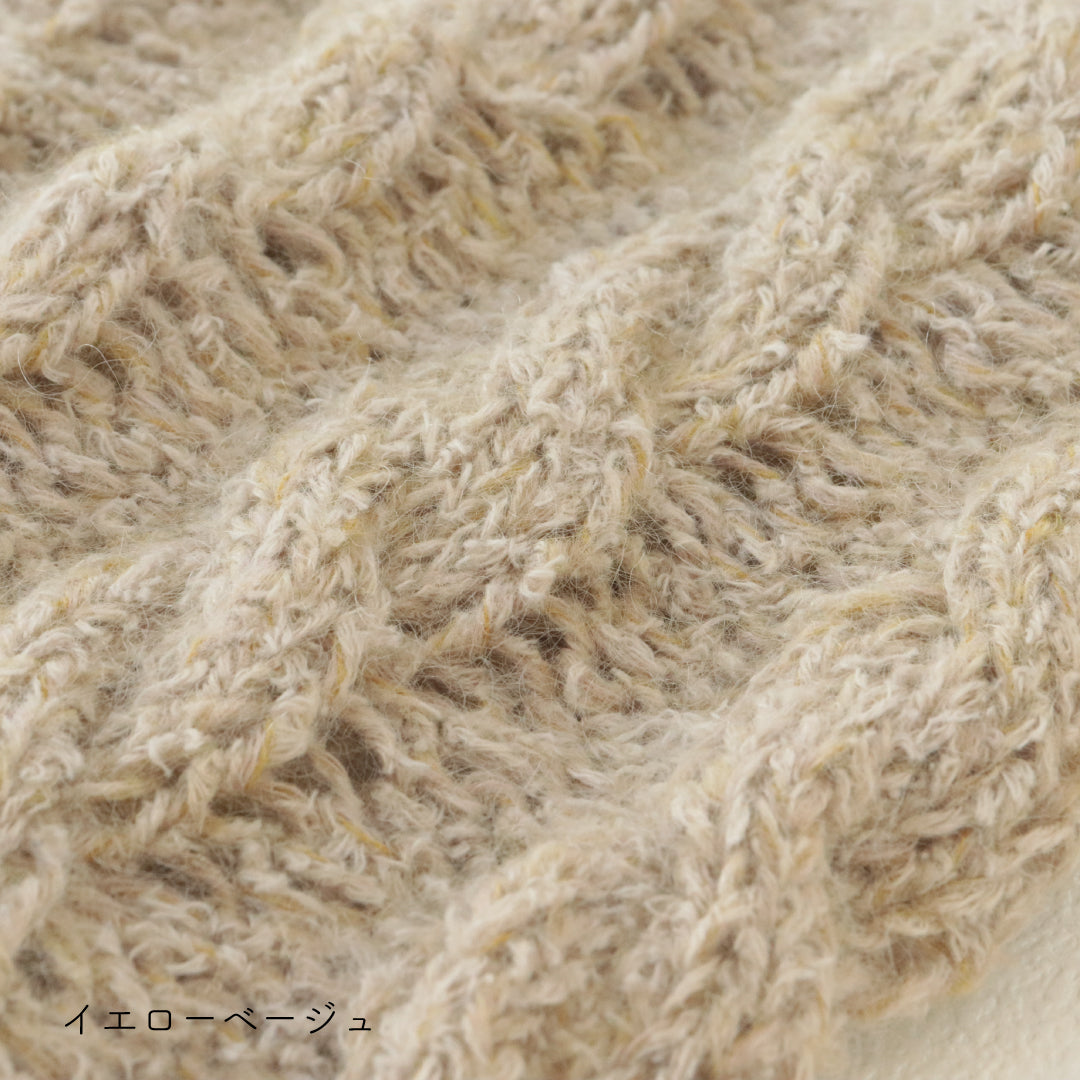 ケーブル模様(縄編み)を取り入れたシンプルなデザインで、飽きのこない優しい印象に仕上がります。棒針10号を使用するので、細い号数よりかは編みやすく、ケーブル編みが初めての方でも取り組みやすいキットです。