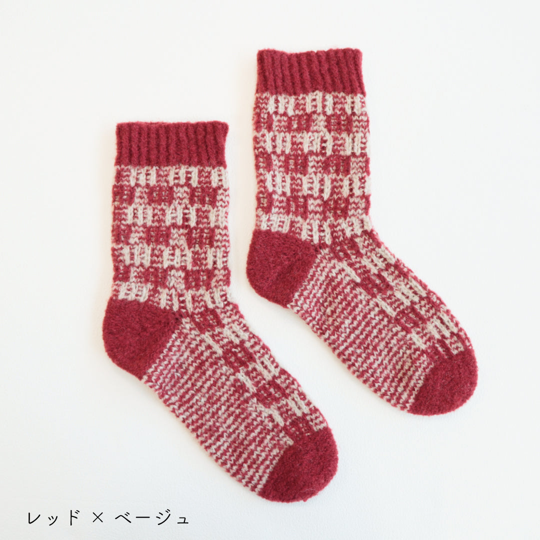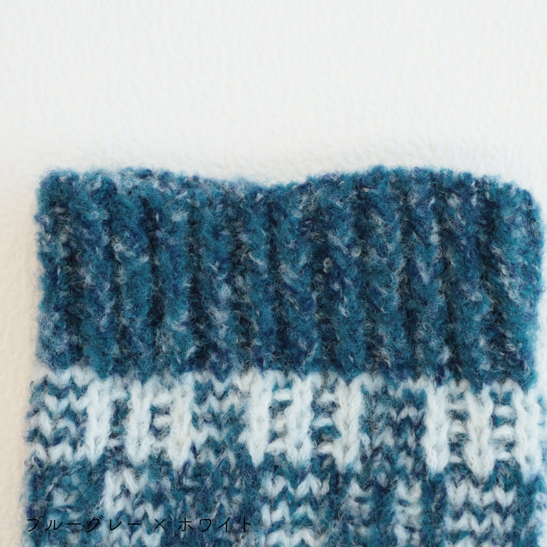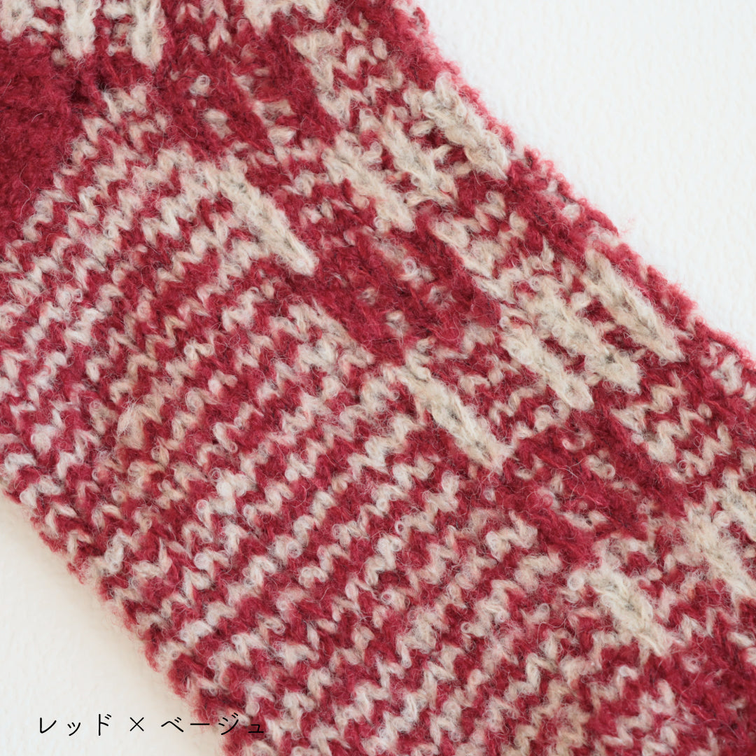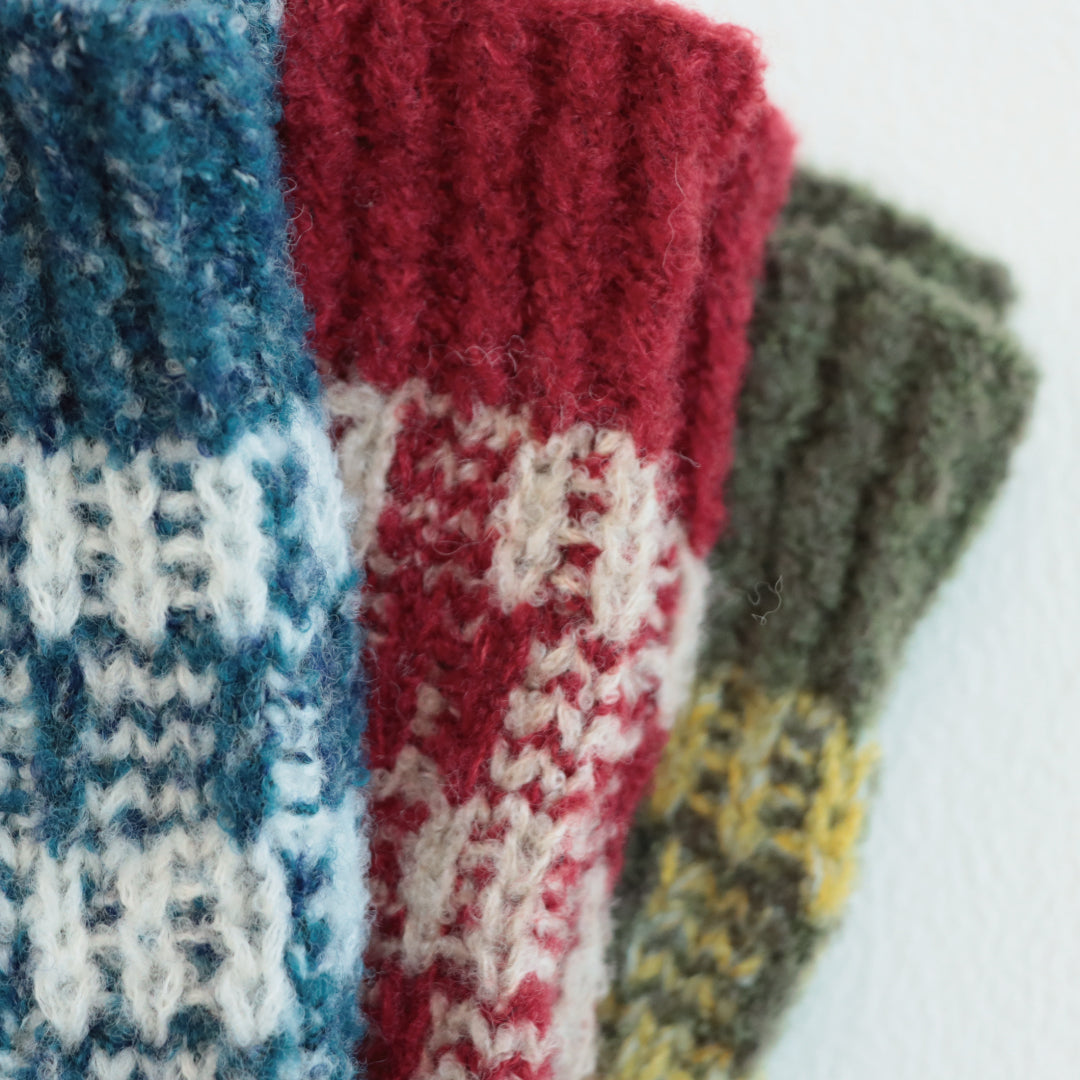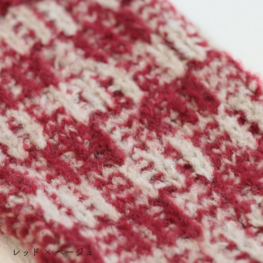 2色が優しく馴染むように工夫されたこのチェック柄は一見むずかしそうに見える模様ですが、1段の中で糸を変える必要はなく実は2色の糸を交互に編んで柄を作っていけるよう工夫されたデザインです。配色次第で雰囲気がガラッと変わるので、色選びも大きな楽しみのひとつ。