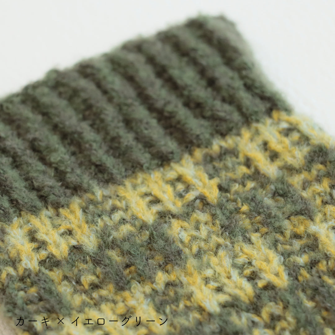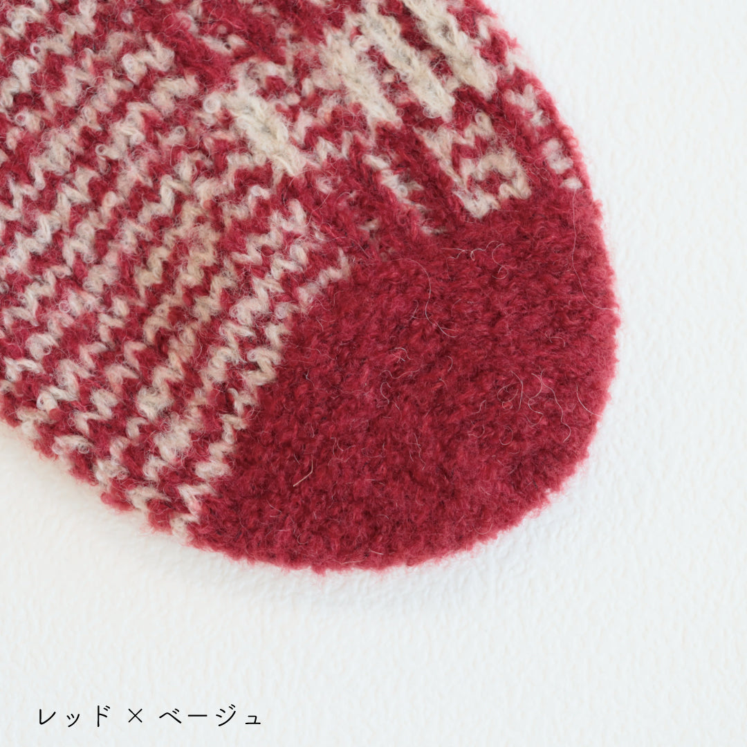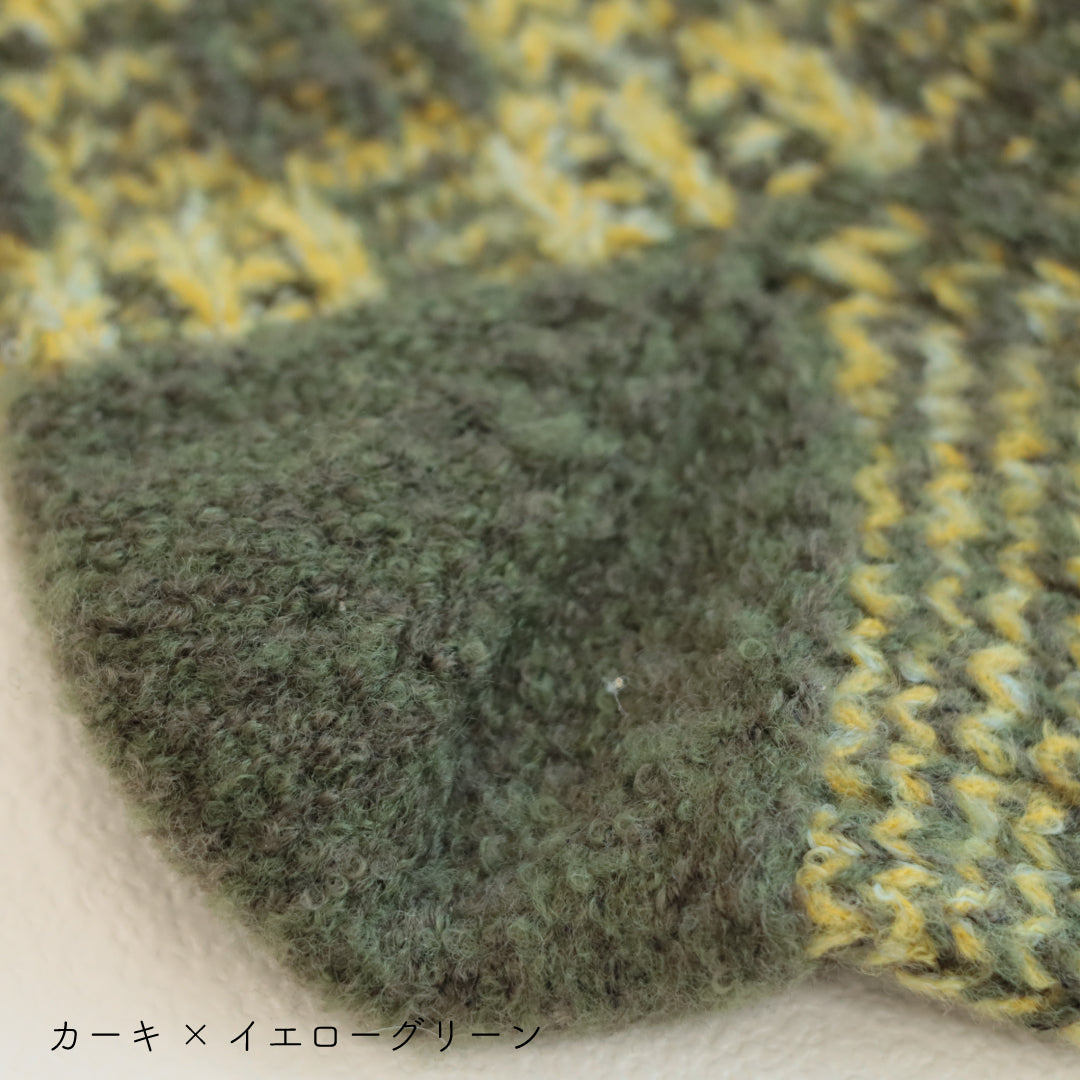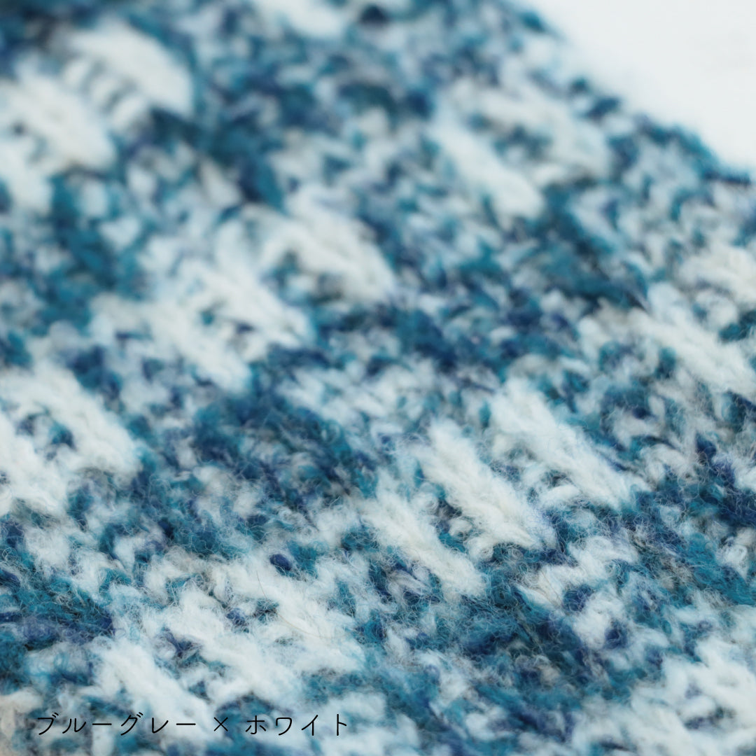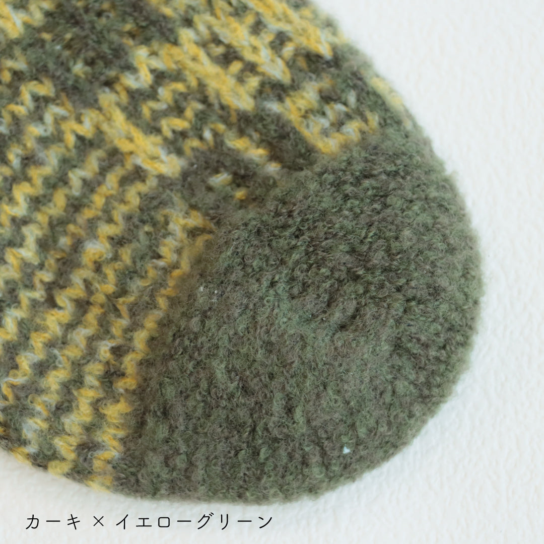 2色が優しく馴染むように工夫されたこのチェック柄は一見むずかしそうに見える模様ですが、1段の中で糸を変える必要はなく実は2色の糸を交互に編んで柄を作っていけるよう工夫されたデザインです。配色次第で雰囲気がガラッと変わるので、色選びも大きな楽しみのひとつ。