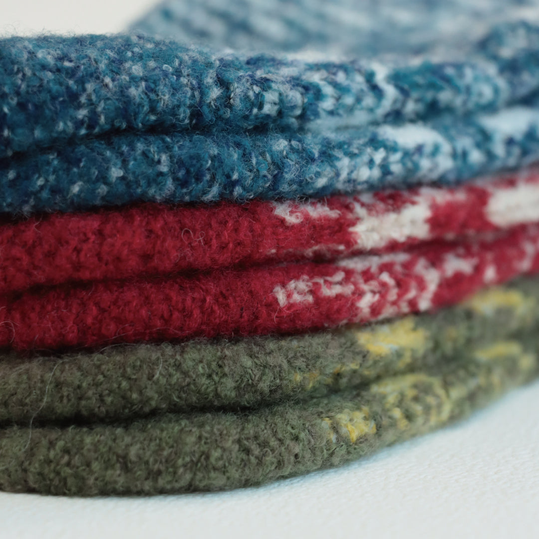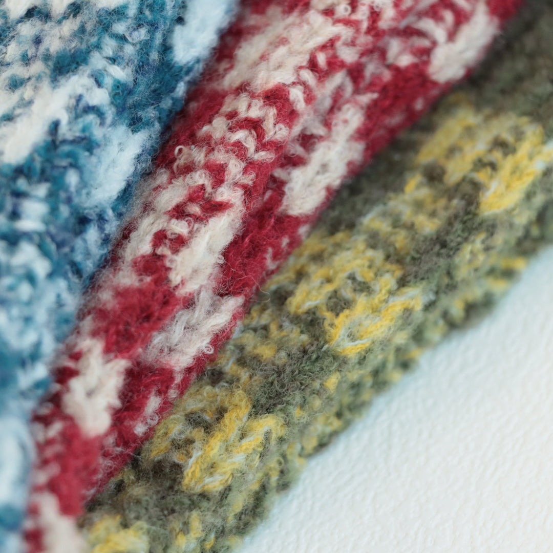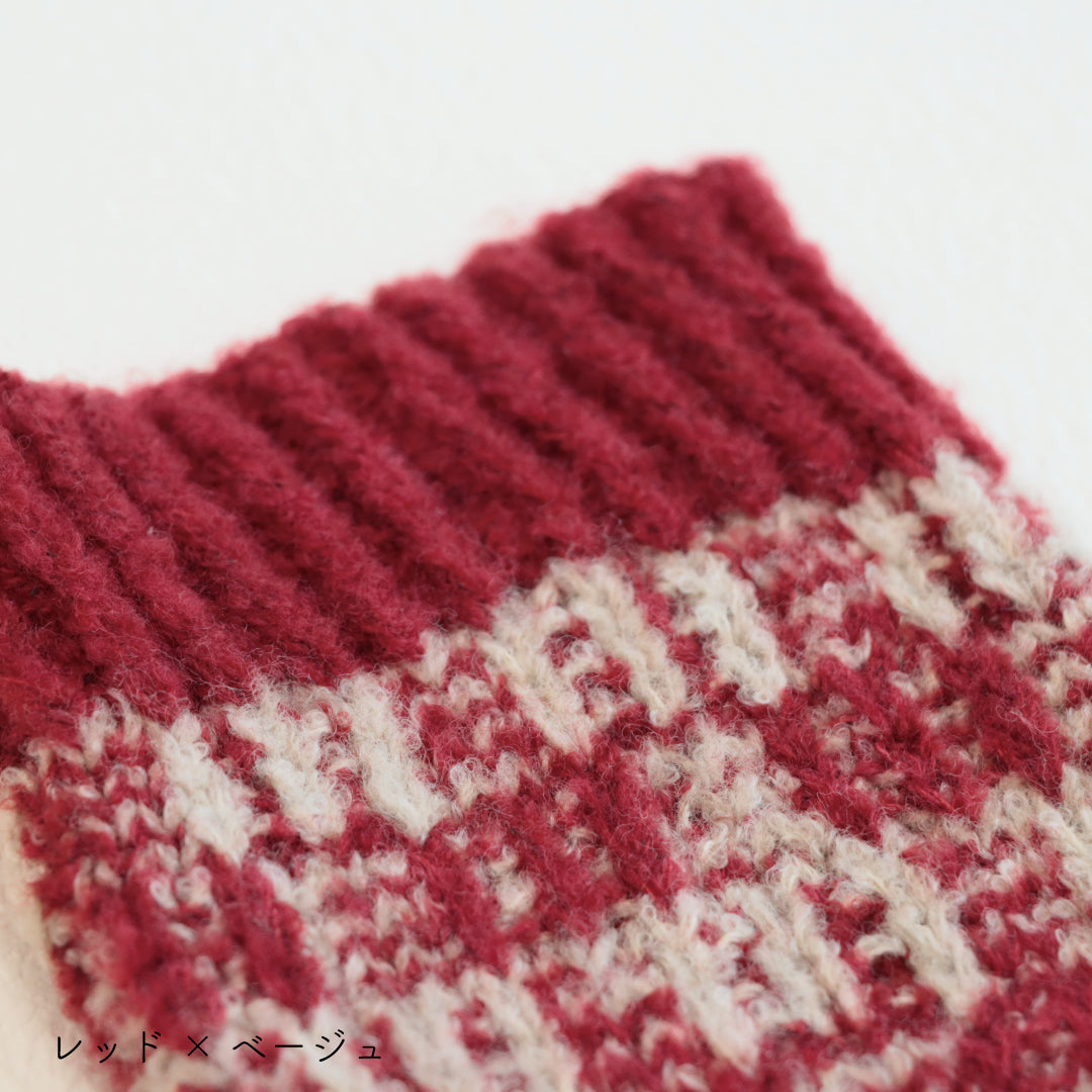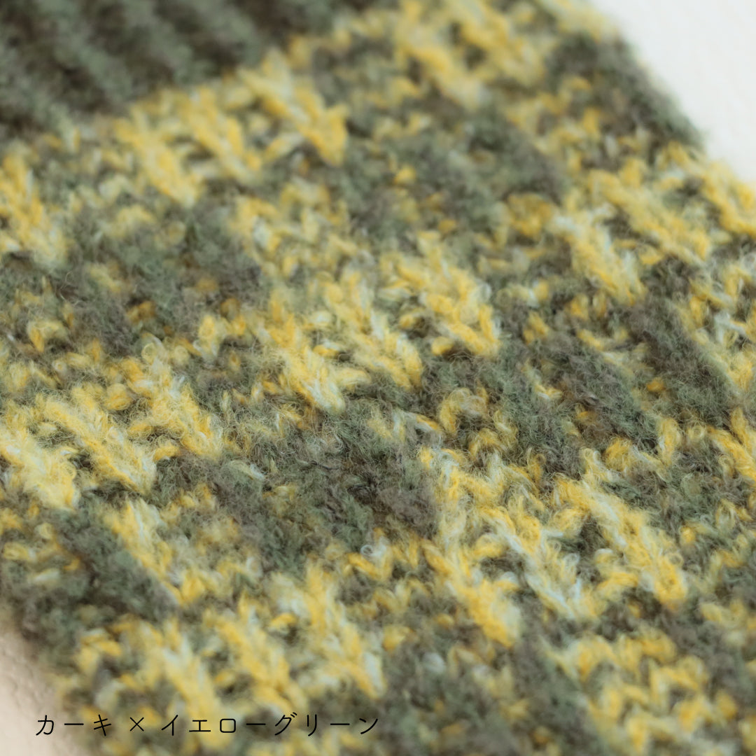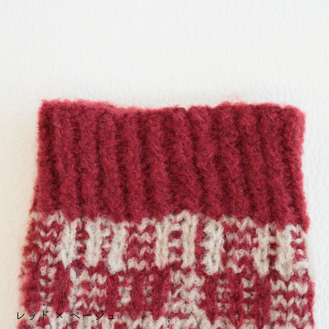 2色が優しく馴染むように工夫されたこのチェック柄は一見むずかしそうに見える模様ですが、1段の中で糸を変える必要はなく実は2色の糸を交互に編んで柄を作っていけるよう工夫されたデザインです。配色次第で雰囲気がガラッと変わるので、色選びも大きな楽しみのひとつ。