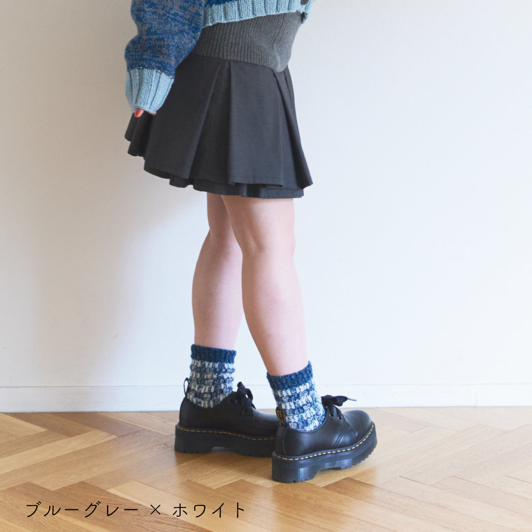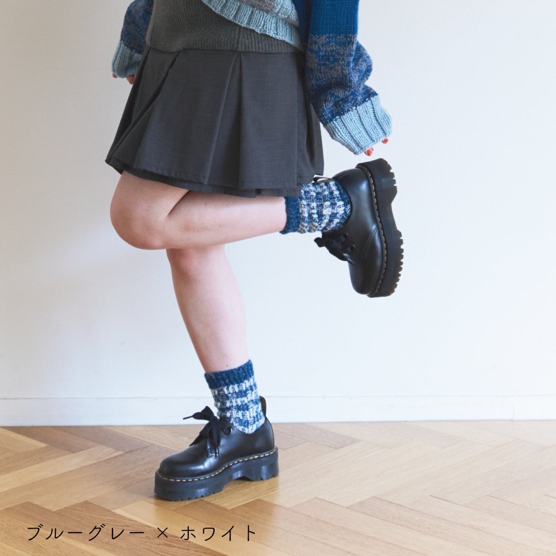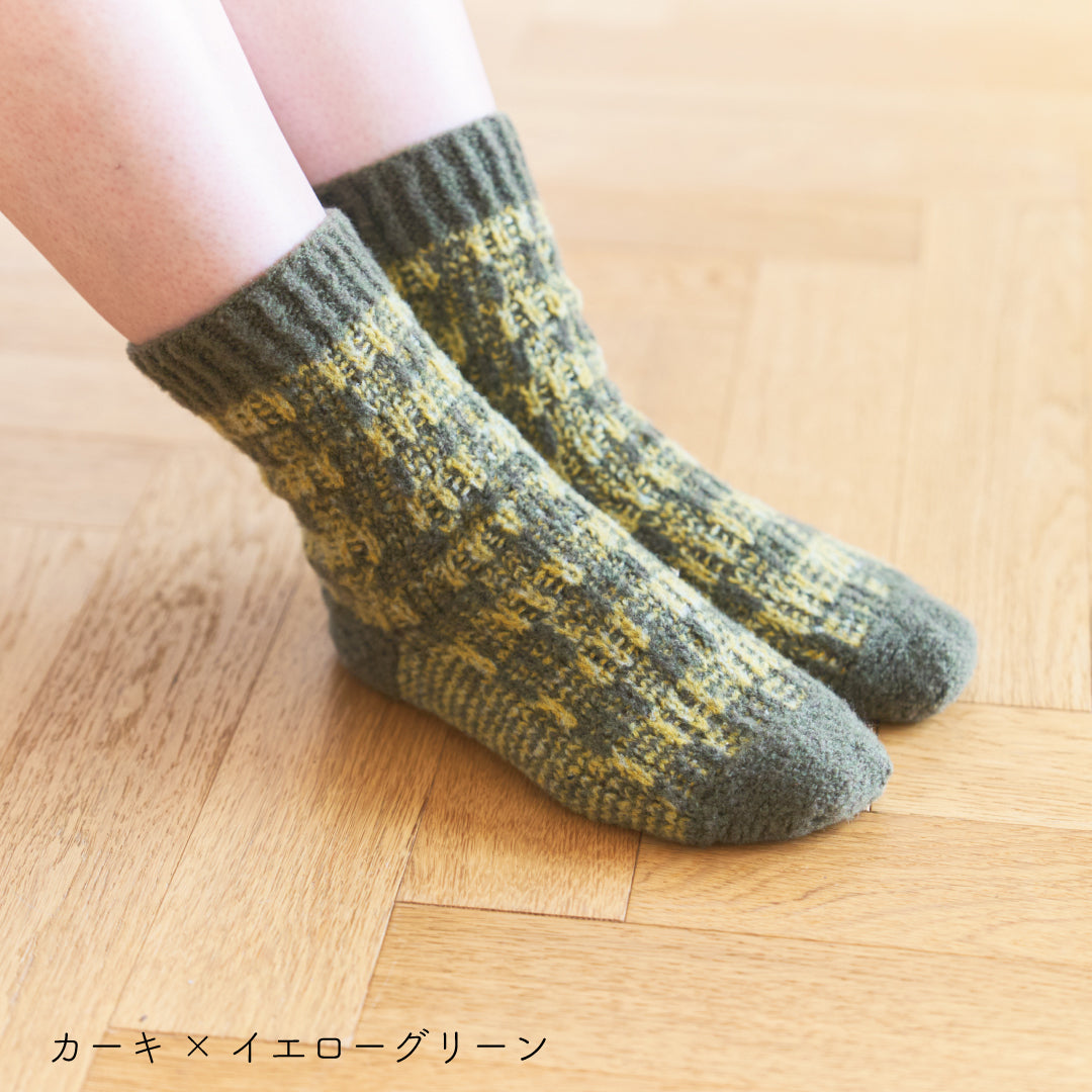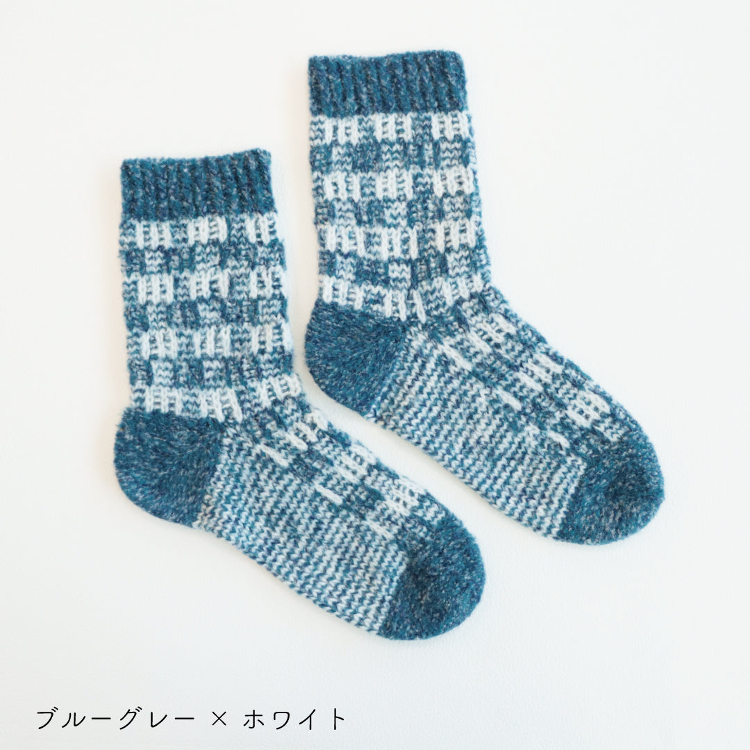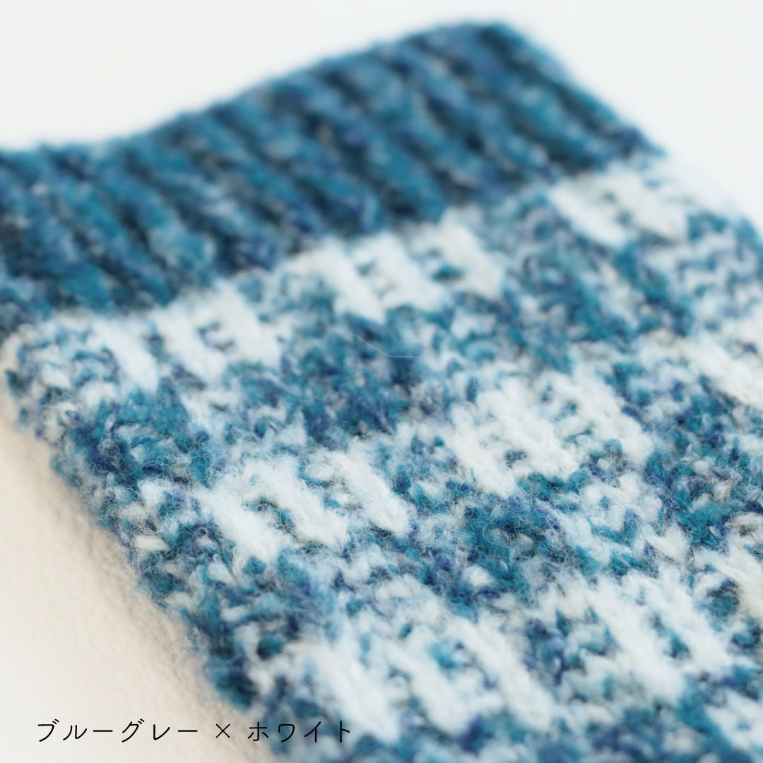 エクストラファインメリノウールを贅沢に使用しふんわり柔らかく、しっとりと肌に寄り添うような心地よさが魅力の糸【moo】で編む、ギンガムチェック柄ソックスキットです。