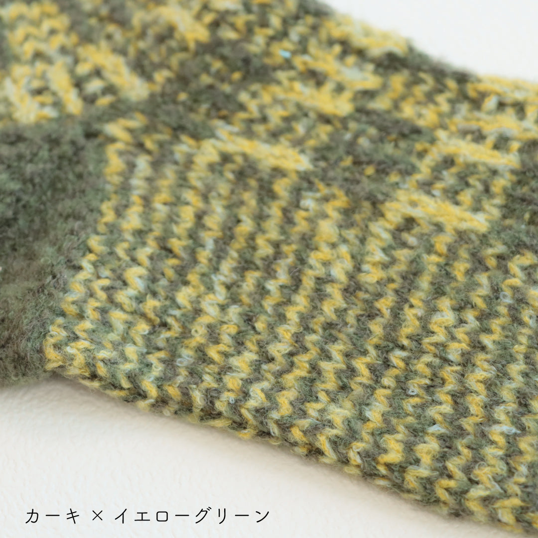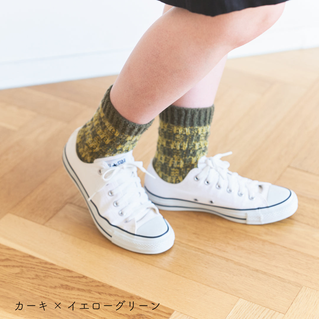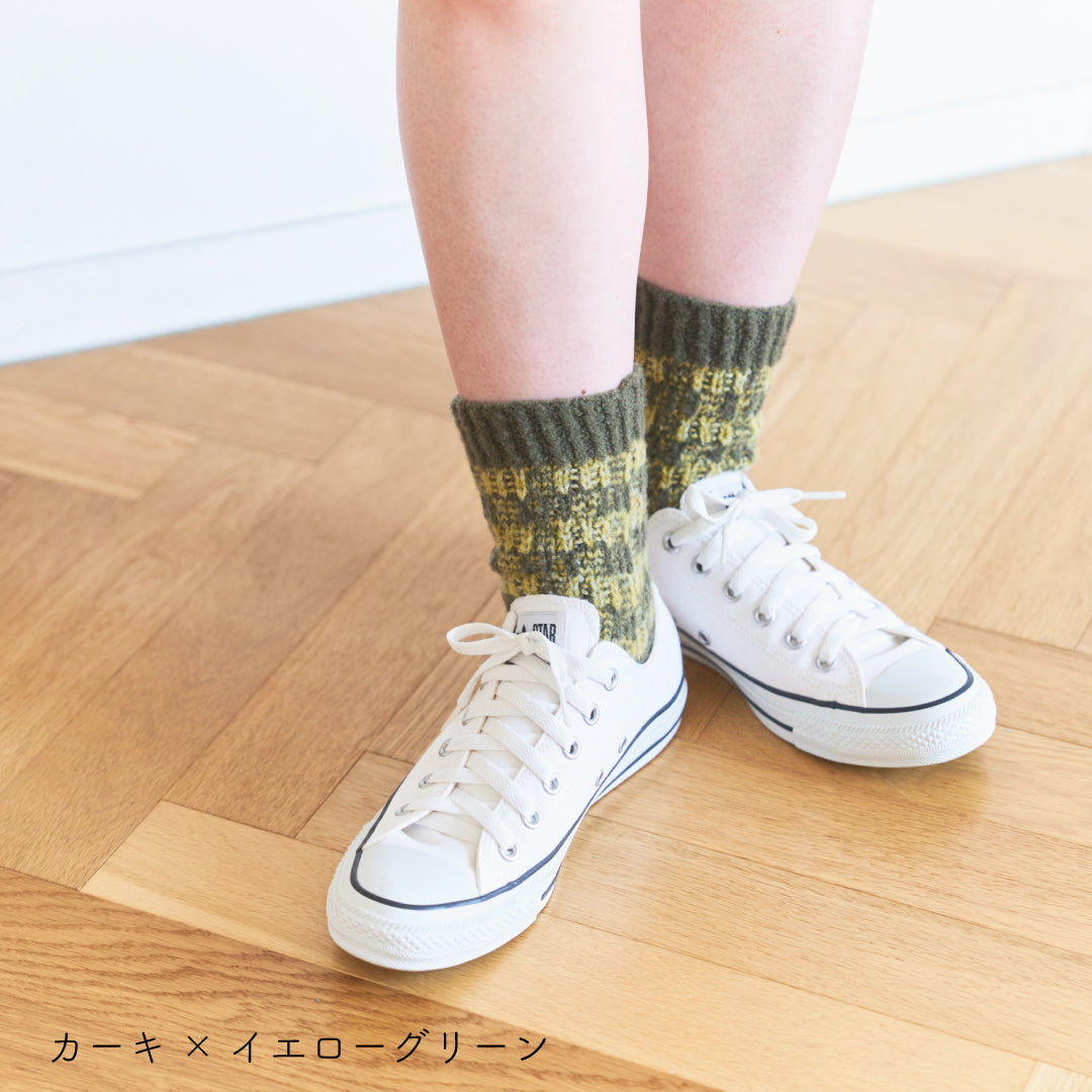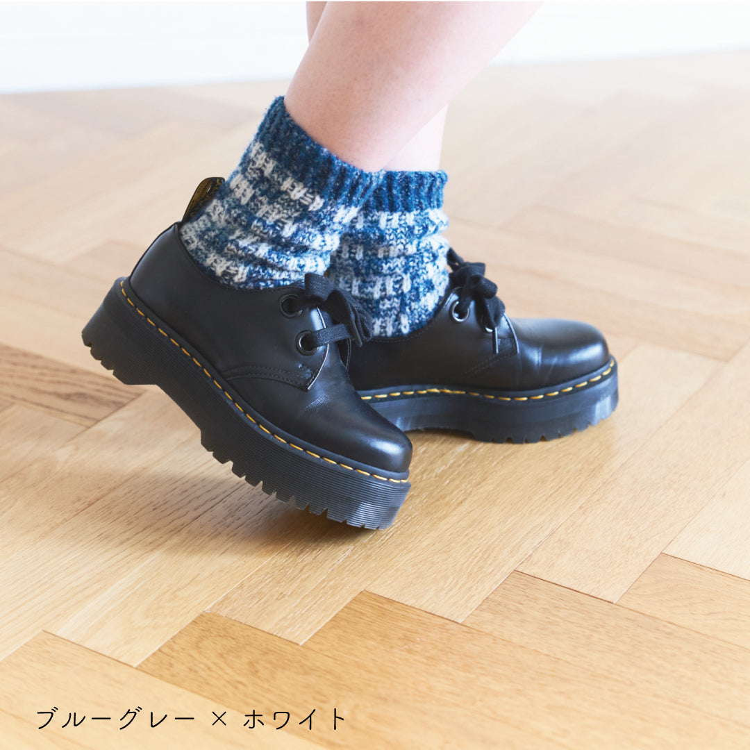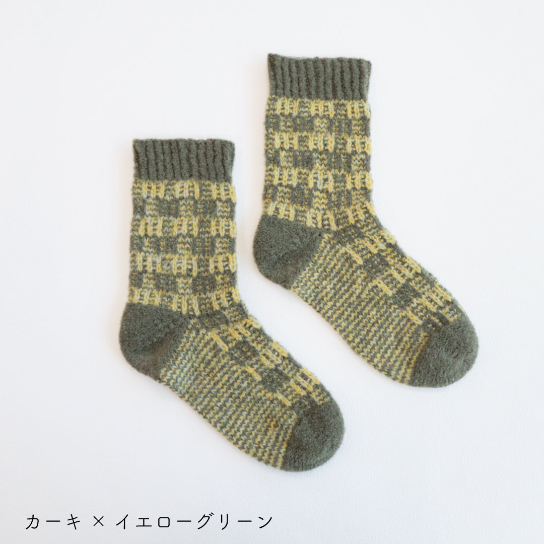 エクストラファインメリノウールを贅沢に使用しふんわり柔らかく、しっとりと肌に寄り添うような心地よさが魅力の糸【moo】で編む、ギンガムチェック柄ソックスキットです。