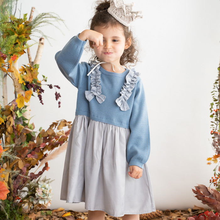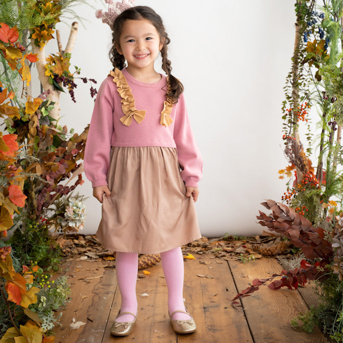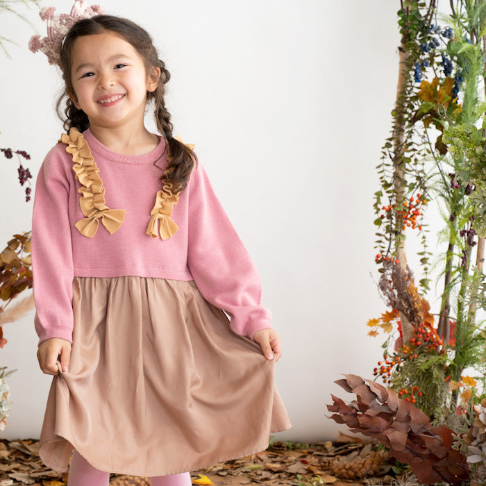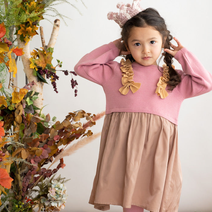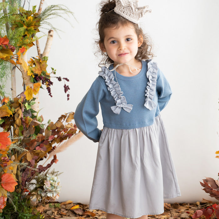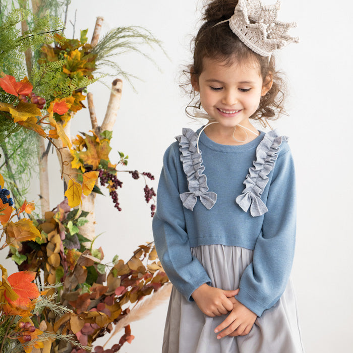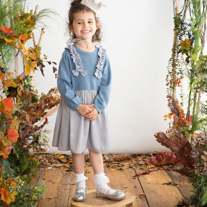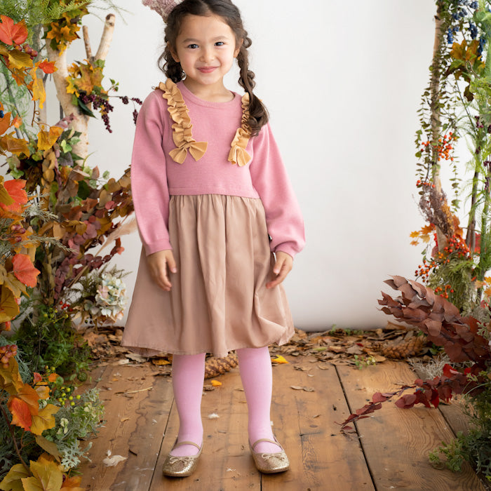 女の子らしい両肩にリボンがついている可愛いワンピースです。またスカートには裏地もついているため1枚でも安心してご着用いただけます。普段着はもちろん、お誕生日会やお食事会、発表会などフォーマルな場所でおススメです。