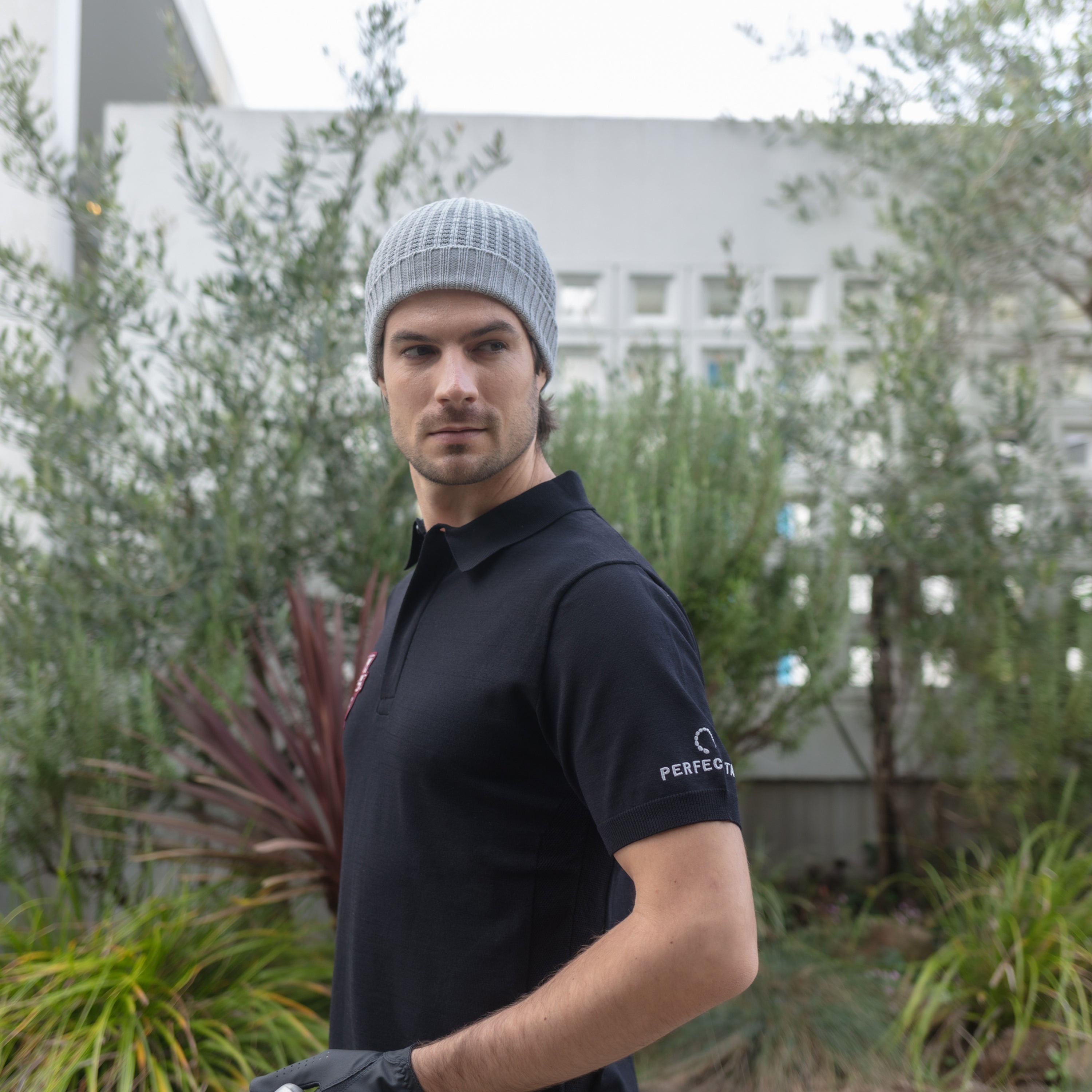 ボディの素材には清涼感のあるコンフィットウールを使用。ハリコシがありストレッチ性がある糸を使用したニットポロ。