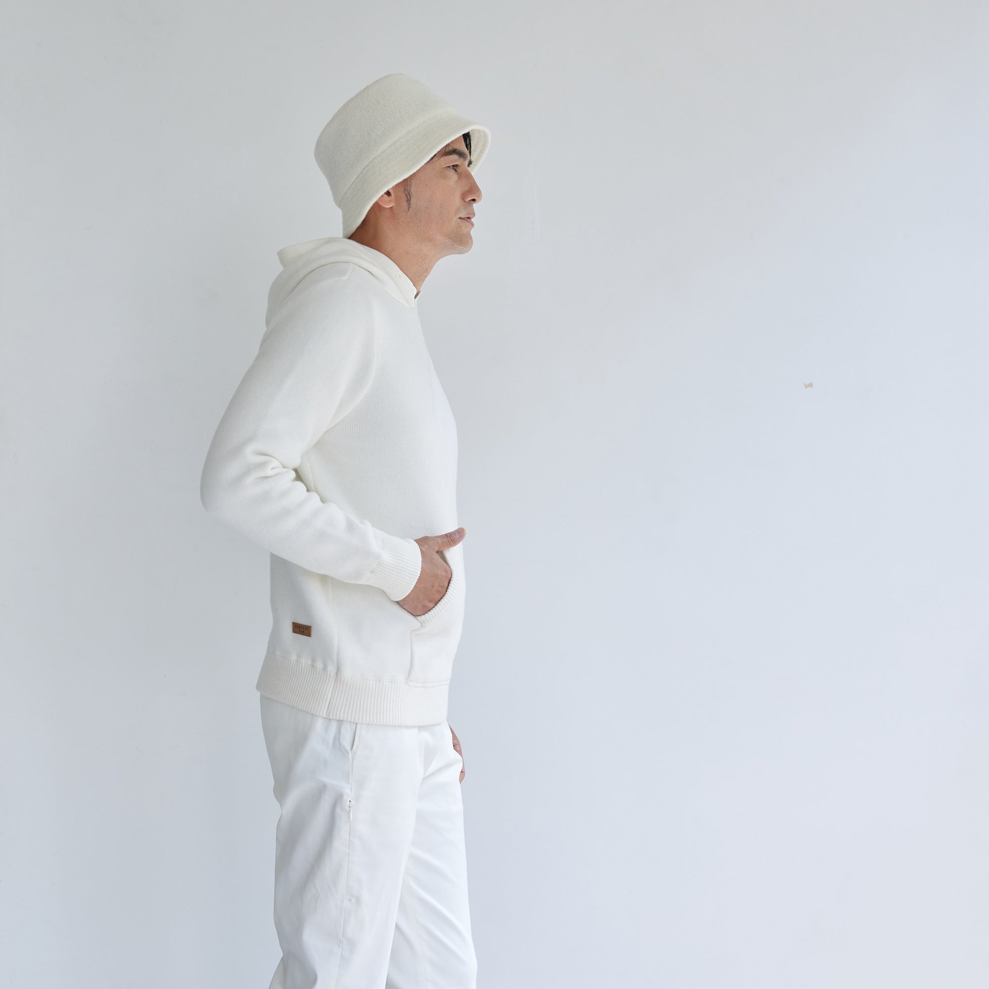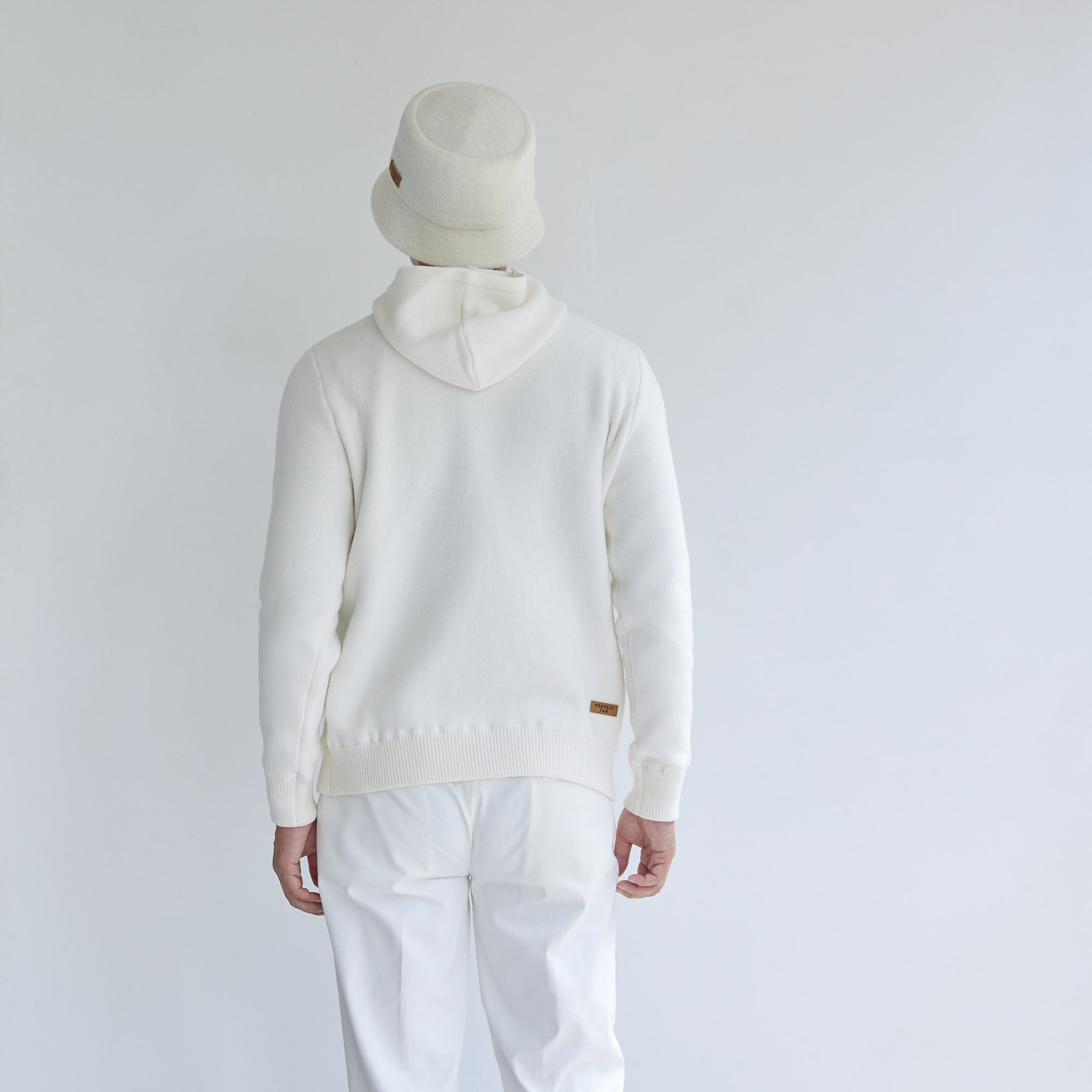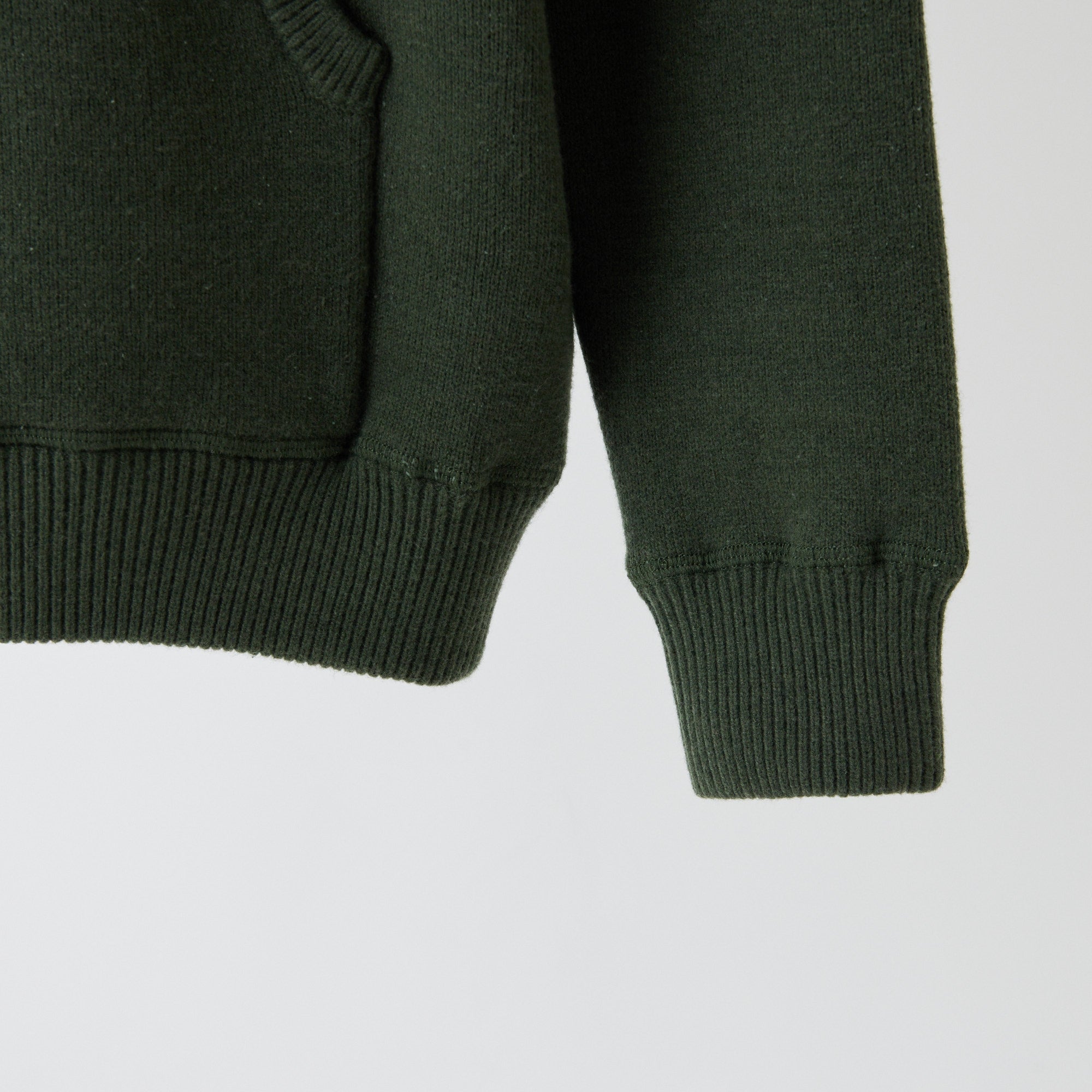 表側にポリエステル糸のフラット面、裏側にモール糸の接結仕様で暖かさを内臓した新感覚のパーカー。