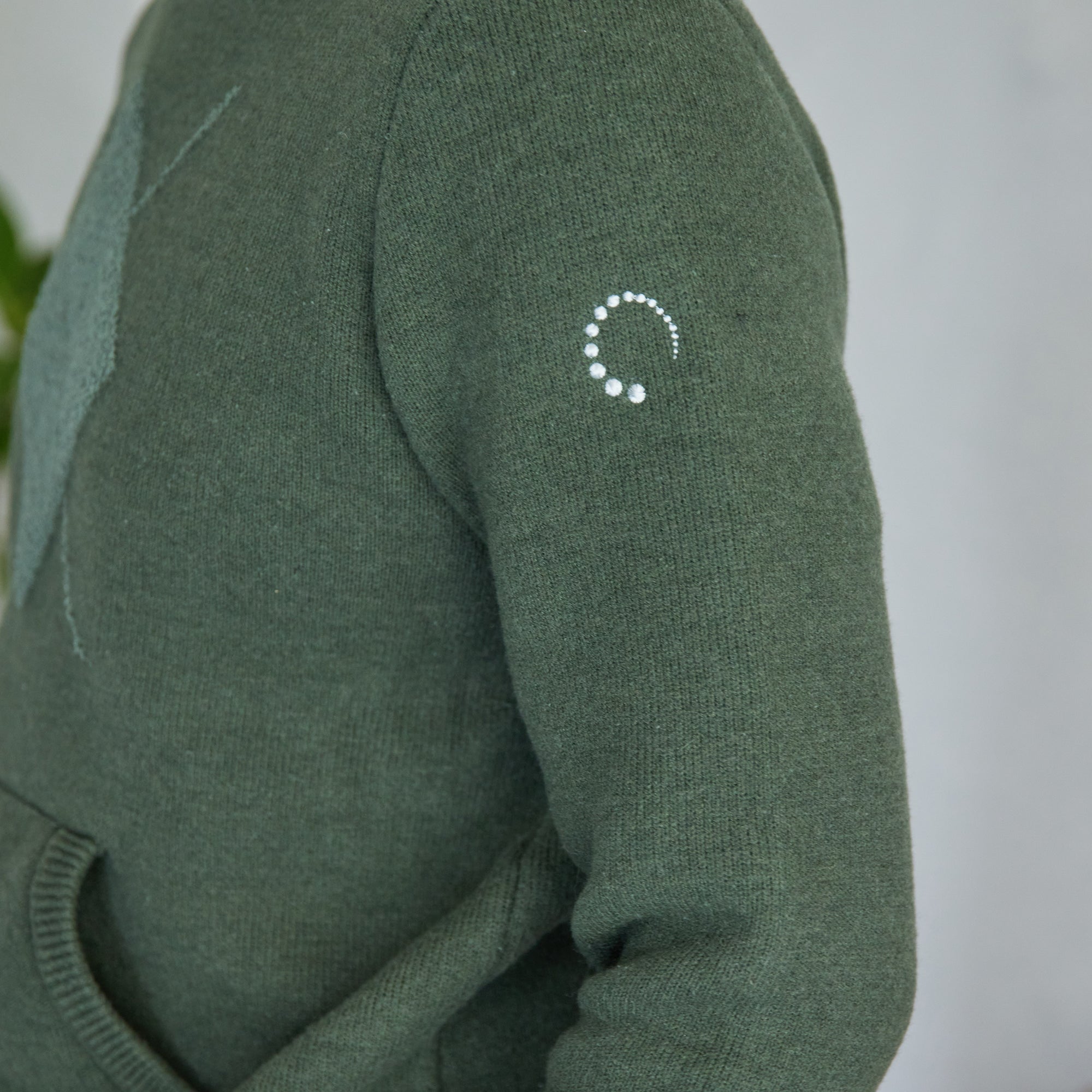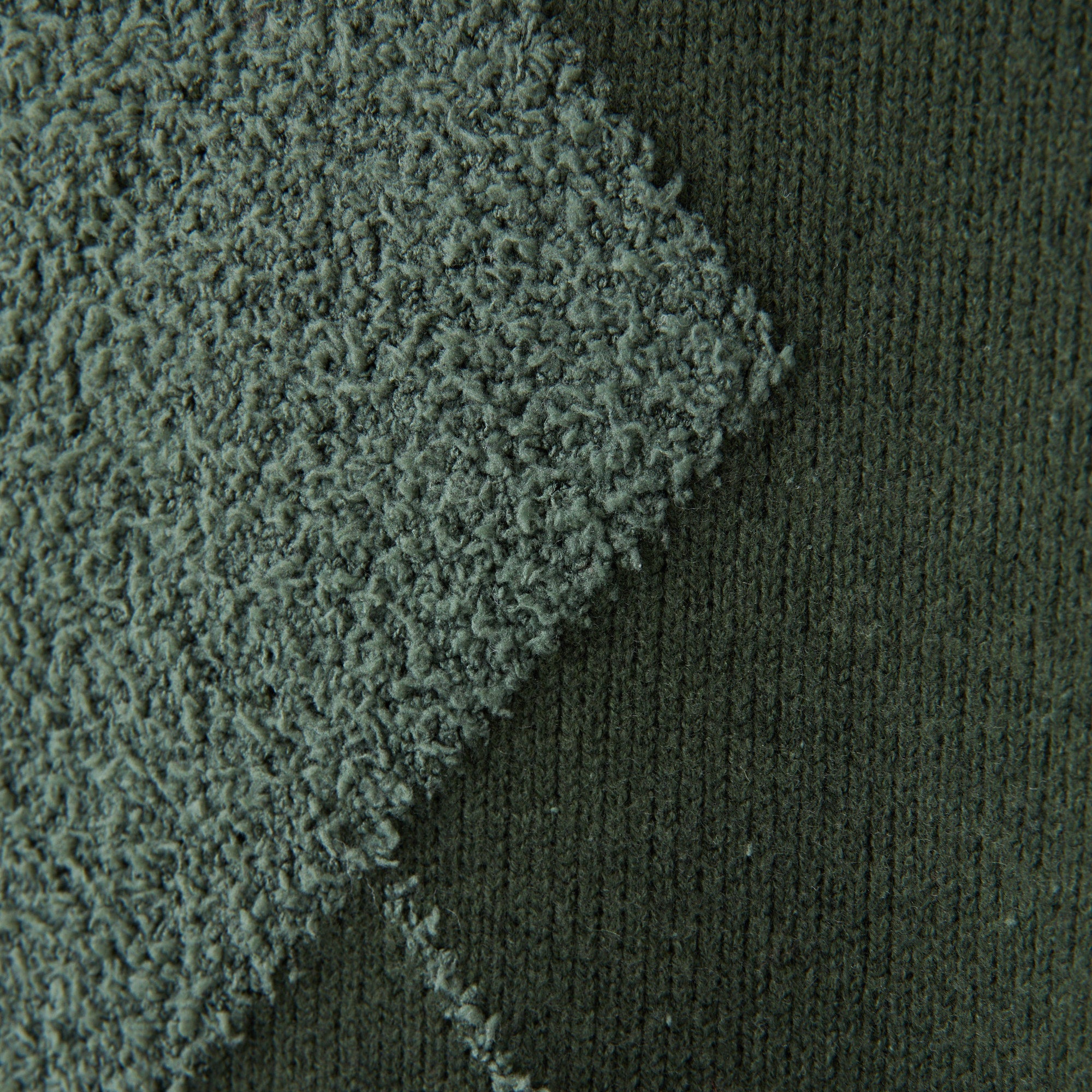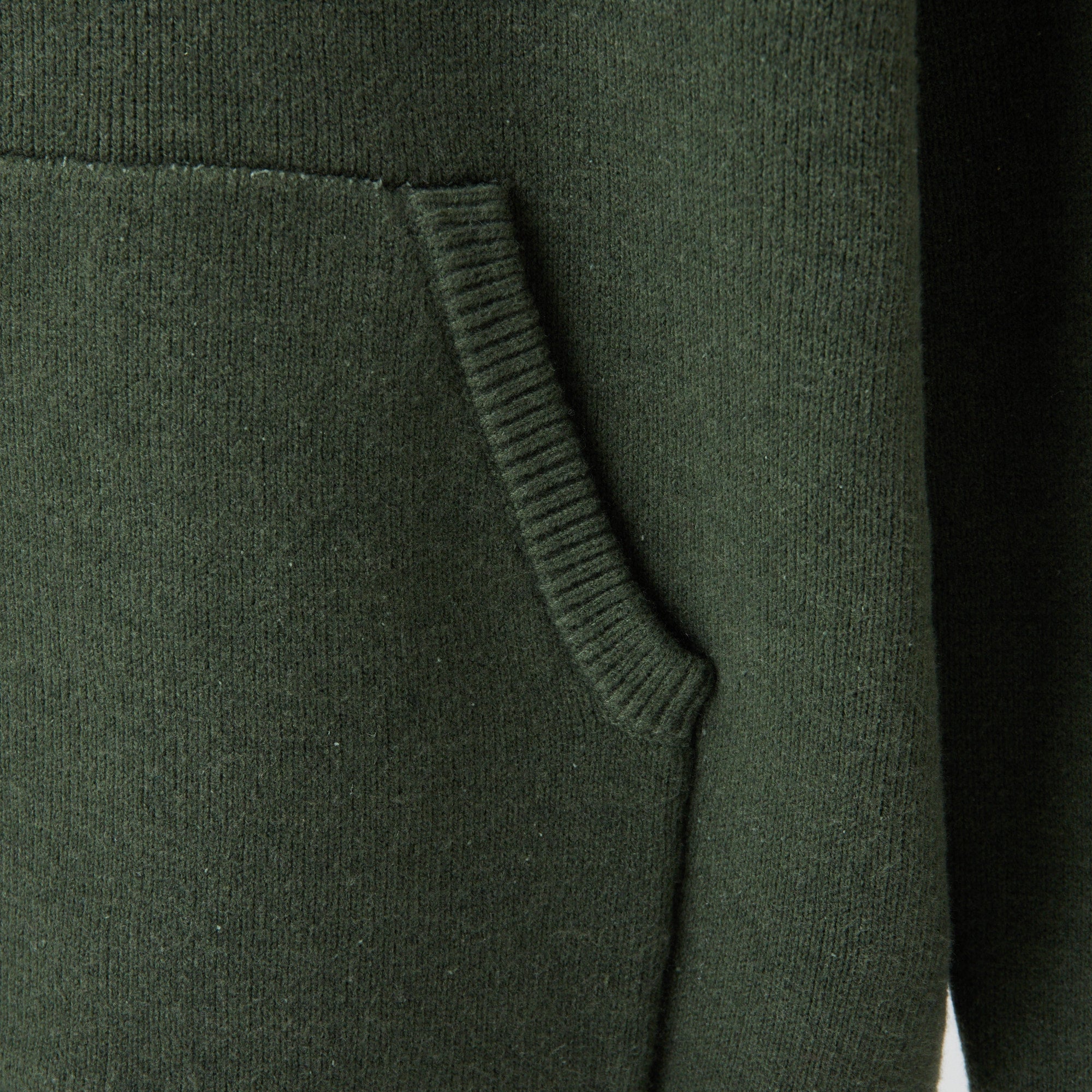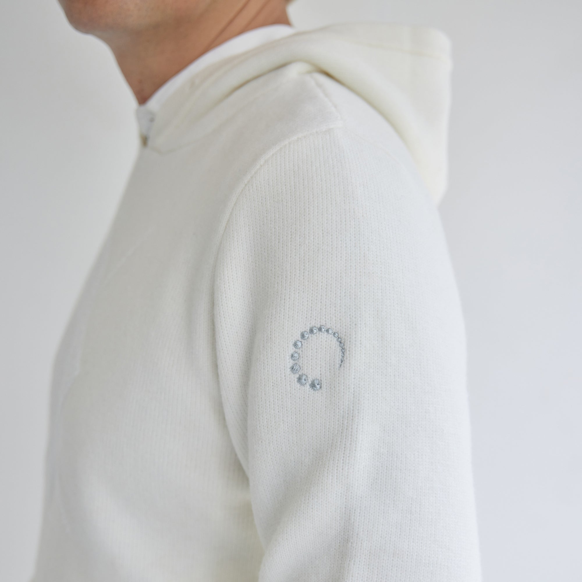 表側にポリエステル糸のフラット面、裏側にモール糸の接結仕様で暖かさを内臓した新感覚のパーカー。