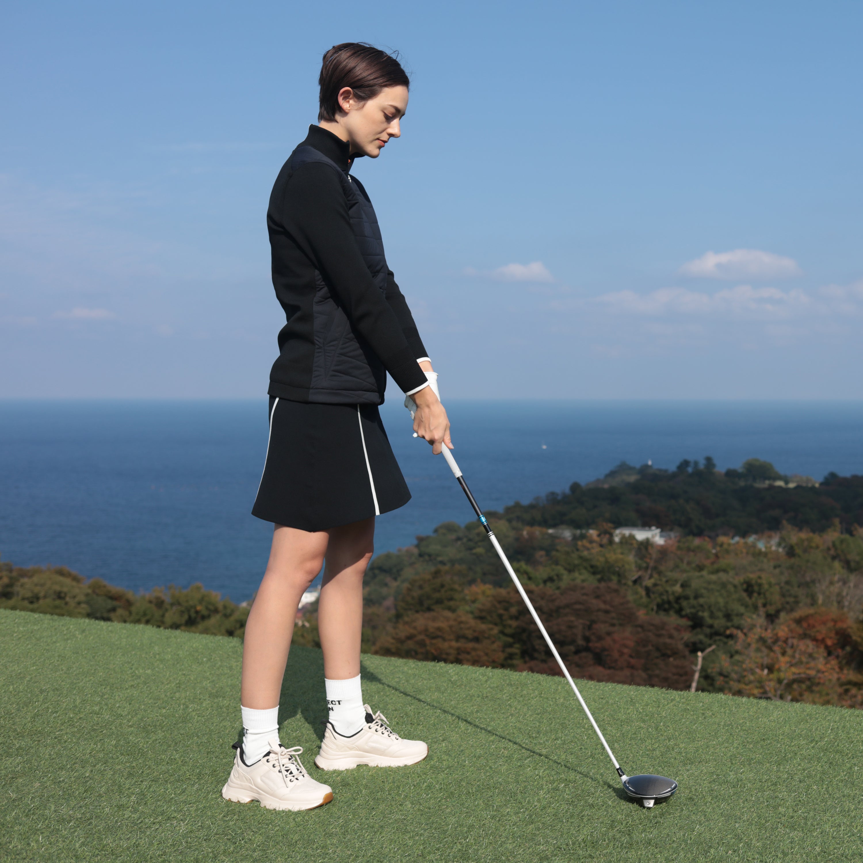 また中綿部分の前身頃にも表にはポリエステル、裏にはポリウレタンフィルムを施したカットソーを使用しており、撥水、透湿、防水性がありながら可動域を邪魔しない素材の組み合わせにより、アウターを着たままでもゴルフを楽しむことが出来るアイテムです。
