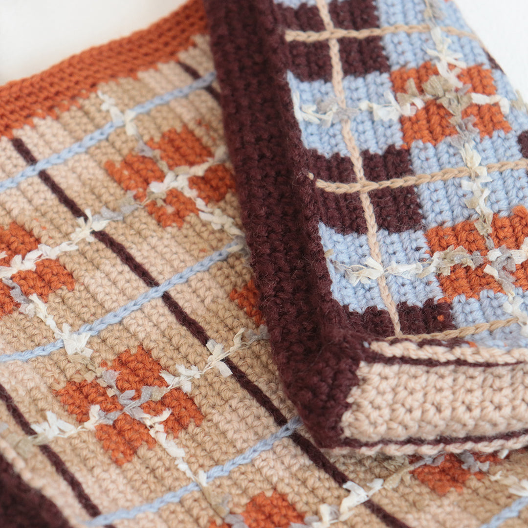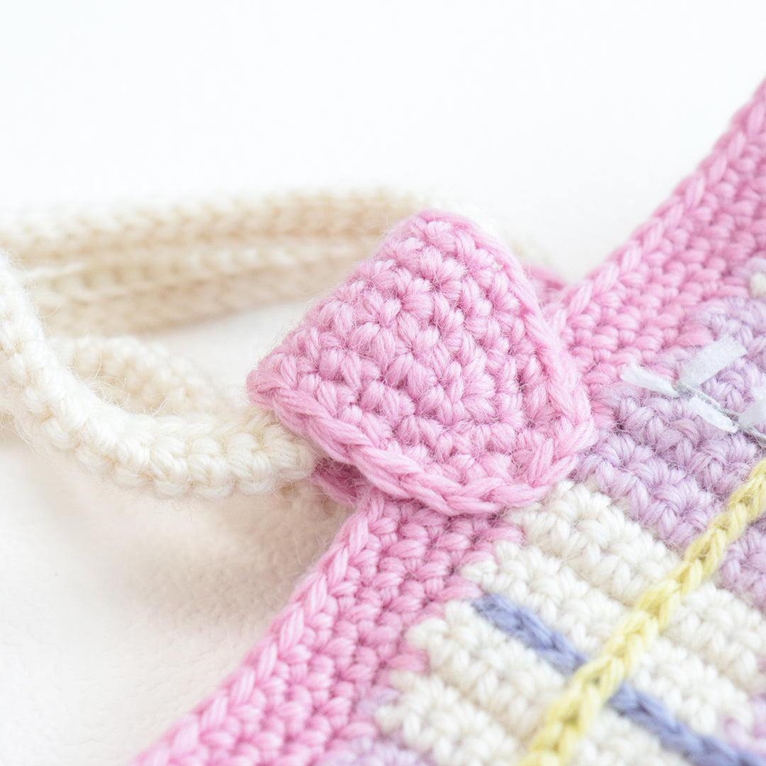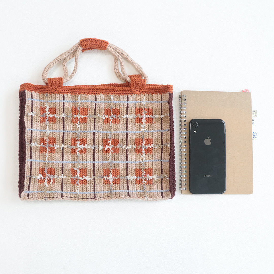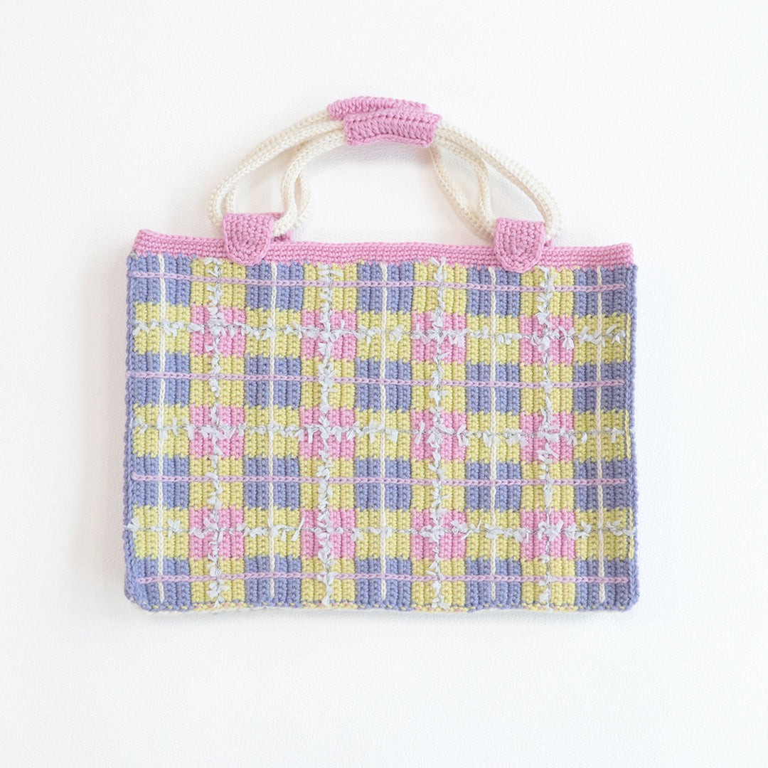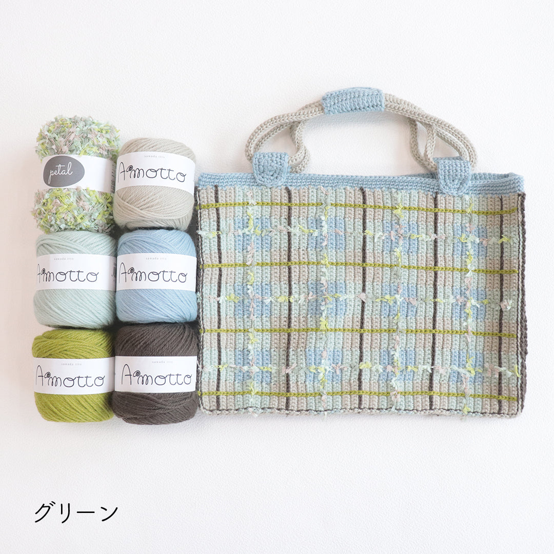 編み包む細編みとチェーンステッチで作るトートバッグです。本体パーツを配色違いで編むことで、Amotto5色を余すことなく使い切れるデザイン!