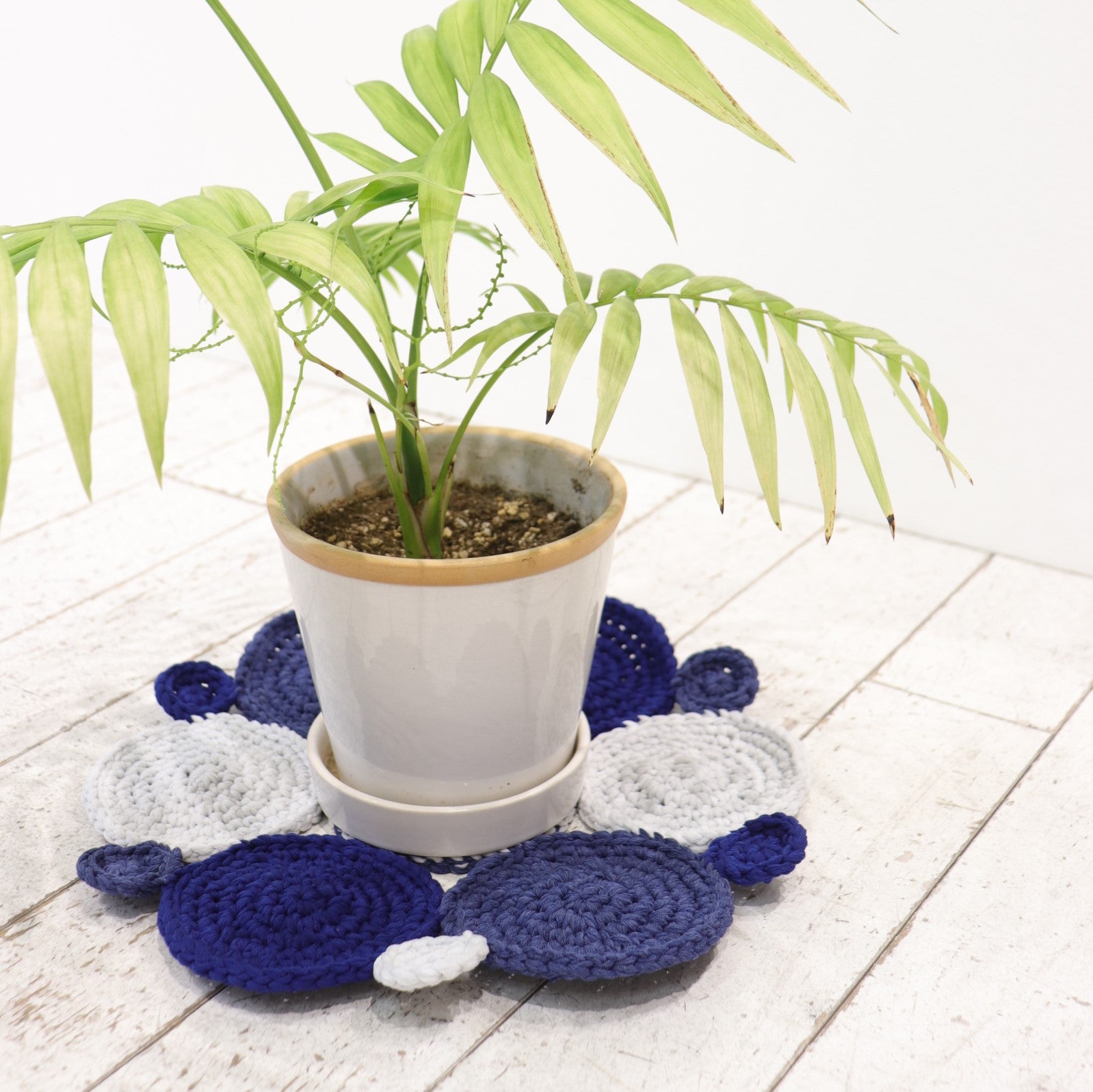 初心者からレベルアップ!初級レベルのサークルコースター。輪から始まる作り目、鎖編み、細編み、増やし目、など基本の編み方をマスターできます。伸縮性のある糸のため、引っ張りすぎないように編むのがおすすめです。配色も何通りもあるのでオリジナルのカラーを楽しめます。インテリアに合わせてお色をお選びいただけます。つなげれば大きなキッチンマットや、ラグとしても使えお部屋を華やかにしてくれます。